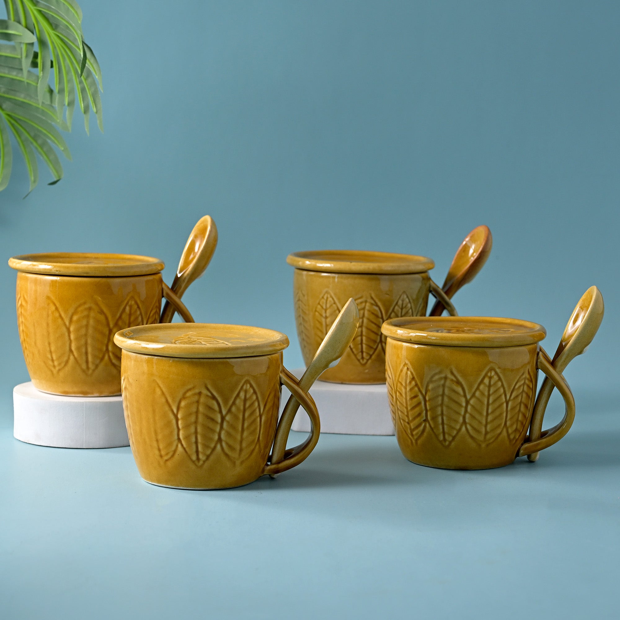 Beige Colour Ceramic Soup Mug with Lid and Spoon (Set of 4)