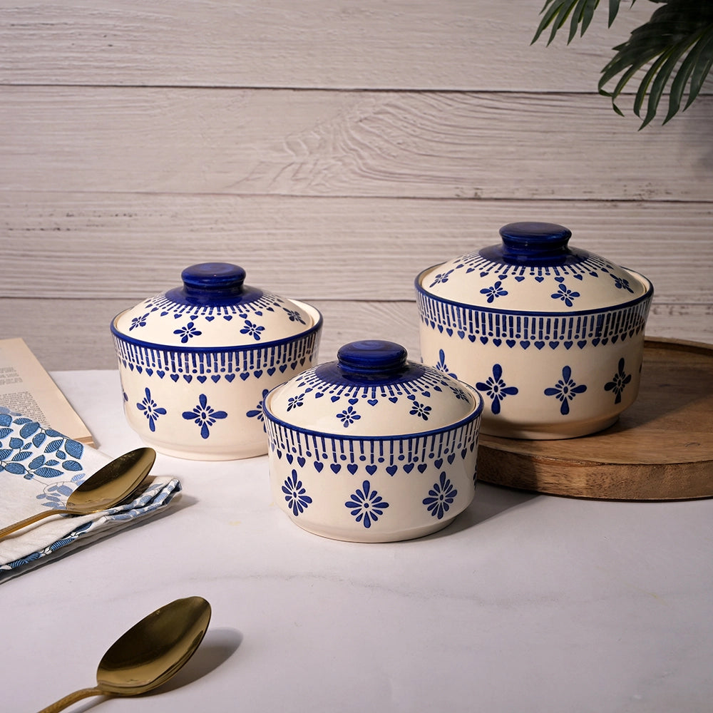 COD availableServing delicious food is great, but serving food in traditional serveware? Even better! That's where our Blue and White Ceramic Bowls with Lids come in - a great option for people who love that traditional feel. These bowls are made of good-quality ceramic, offering lots of durability and should last you a lifetime. Available in white ceramic with stylish blue details. These bowls are not just ordinary bowls, they are inspired by traditional folk art and ethnic motifs, adding a cultural dimension to your table. Whether it's breakfast, lunch or dinner, these bowls are always a simple way to serve your meals with compliments.