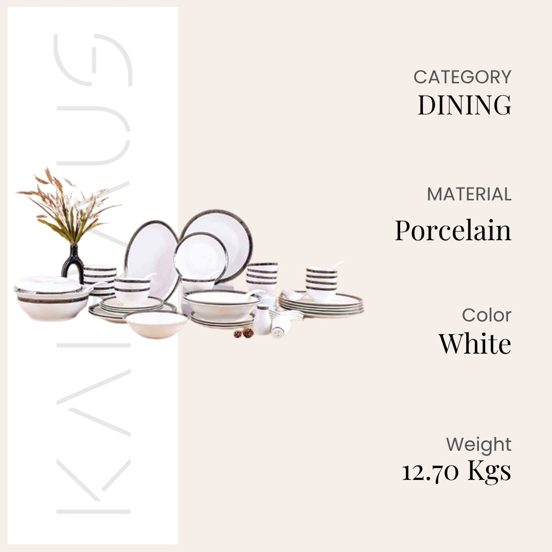 | Dimensions | Dinner Plates (8 Pcs) – 10.5" Dessert Plates (8 Pcs) – 7.5" Bowls (8 Pcs) – 4.5" Bowls (8 Pcs) – 4" Salad Bowls (2 Pcs) – 9" Salad Bowls (1 Pcs) – 7" Oval Plates (1 Pcs) – 12" Spoons (8 Pcs) Soup Spoons (3 Pcs) - Large Salt and Pepper (1+1 Pcs) Casserole with Lid (1+1 Pcs) |