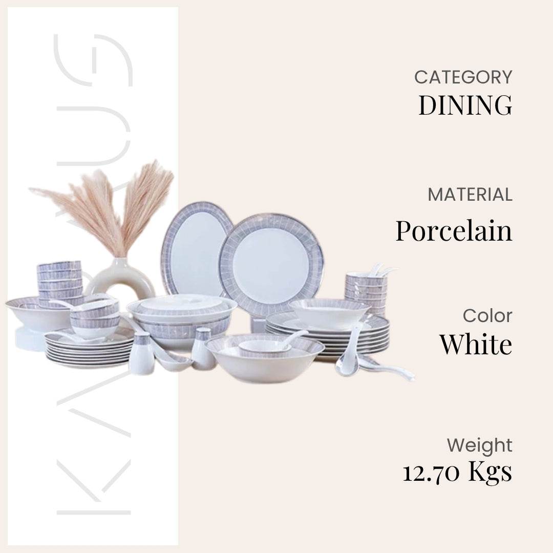 | Dimensions | Dinner Plates (8 Pcs) – 10.5" Dessert Plates (8 Pcs) – 7.5" Bowls (8 Pcs) – 4.5" Bowls (8 Pcs) – 4" Salad Bowls (2 Pcs) – 9" Salad Bowls (1 Pcs) – 7" Oval Plates (1 Pcs) – 12" Spoons (8 Pcs) Soup Spoons (3 Pcs) - Large Salt and Pepper (1+1 Pcs) Casserole with Lid (1+1 Pcs) |