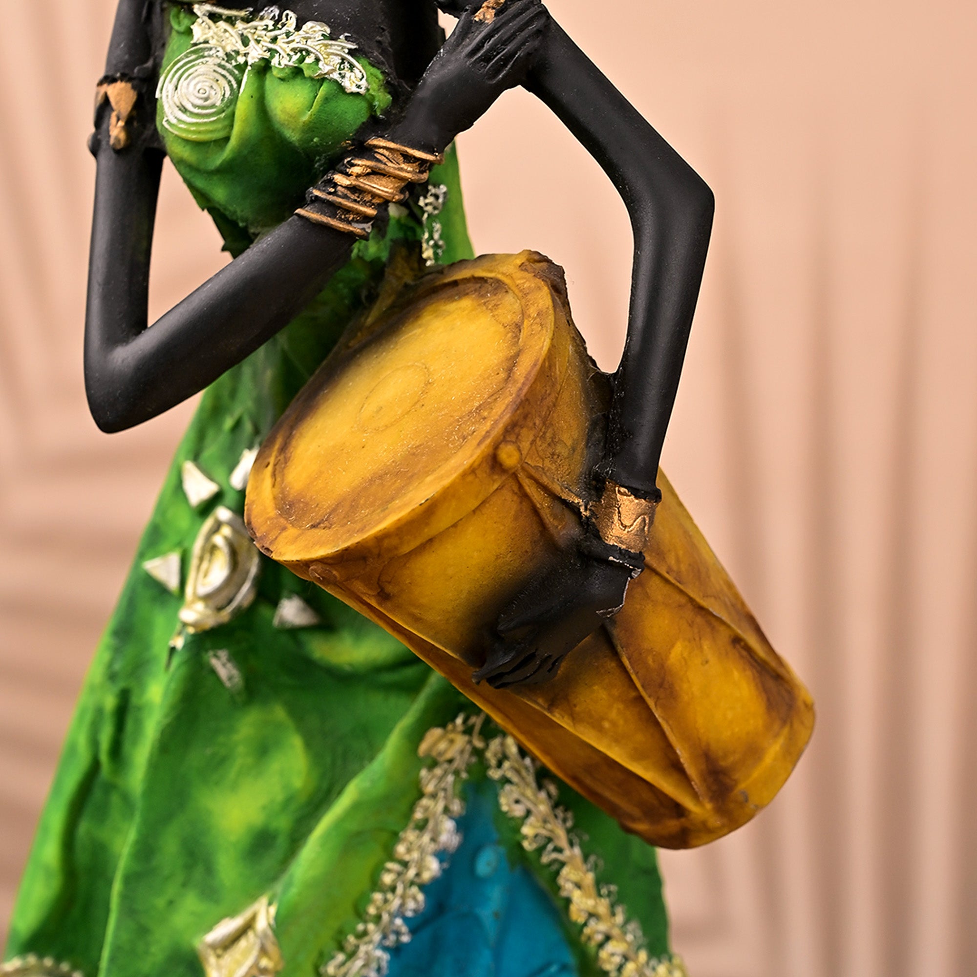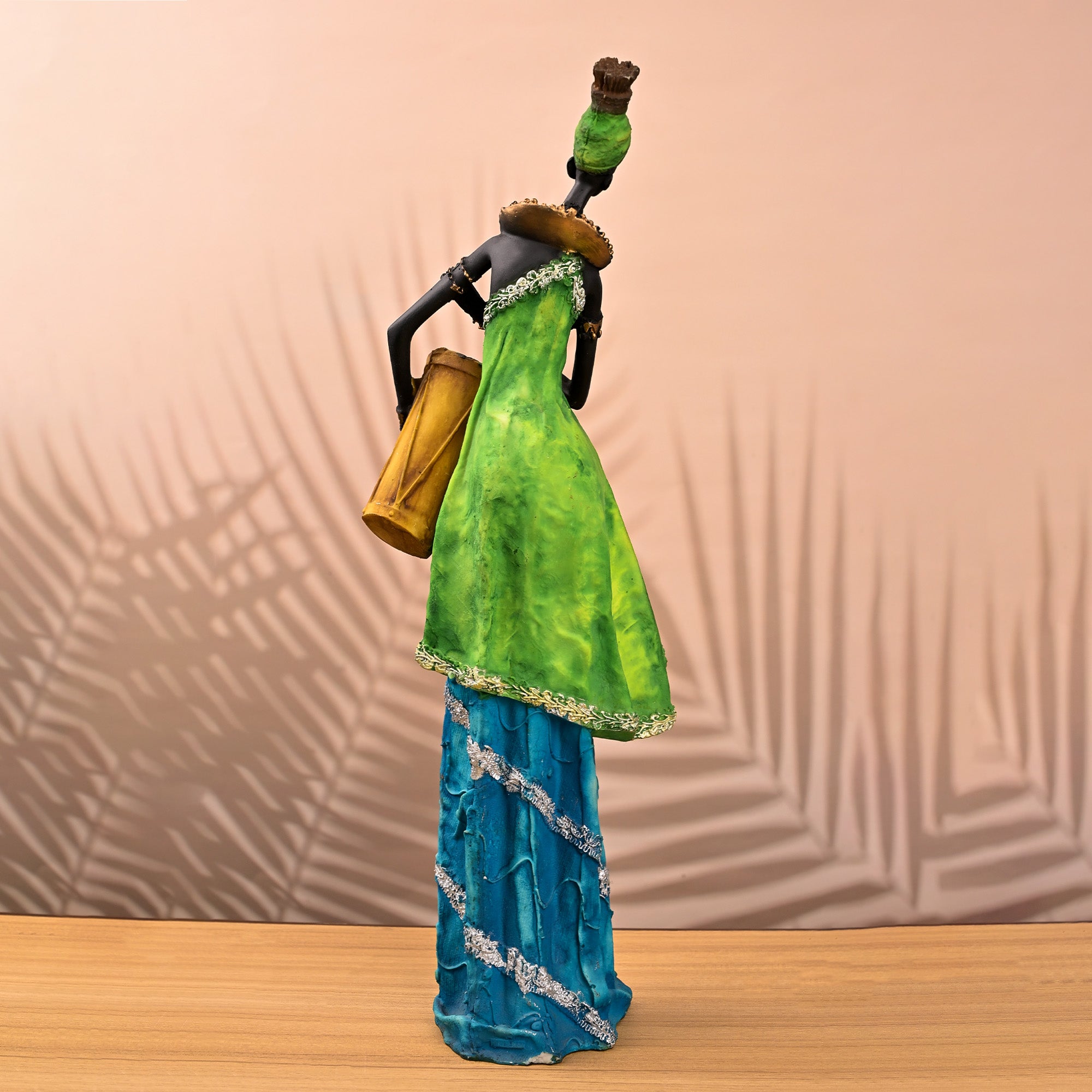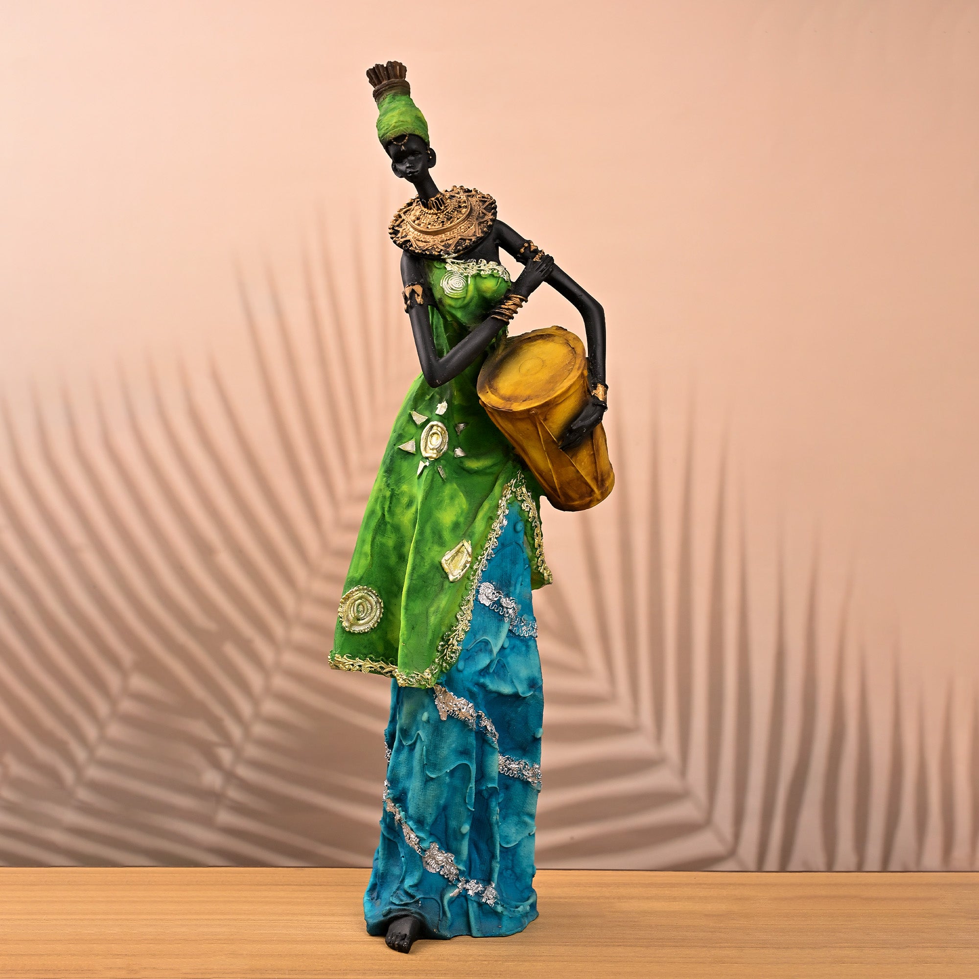 COD availableThe 'African Woman Holding Drum' statue is a vibrant piece celebrating the rich cultural heritage and melodic spirit of Africa. The sculpture depicts an African woman adorned in distinctive tribal jewellery, her mesmerizing dance posture synchronized with the beat of the drum as she plays it, representing togetherness in peace. The intricate detailing of her dress, jewellery, and drum smoothly contrasts in a rich blend of gold, bright green, and blue hues. Place it on a tabletop in your office or hallway to add depth to any space.