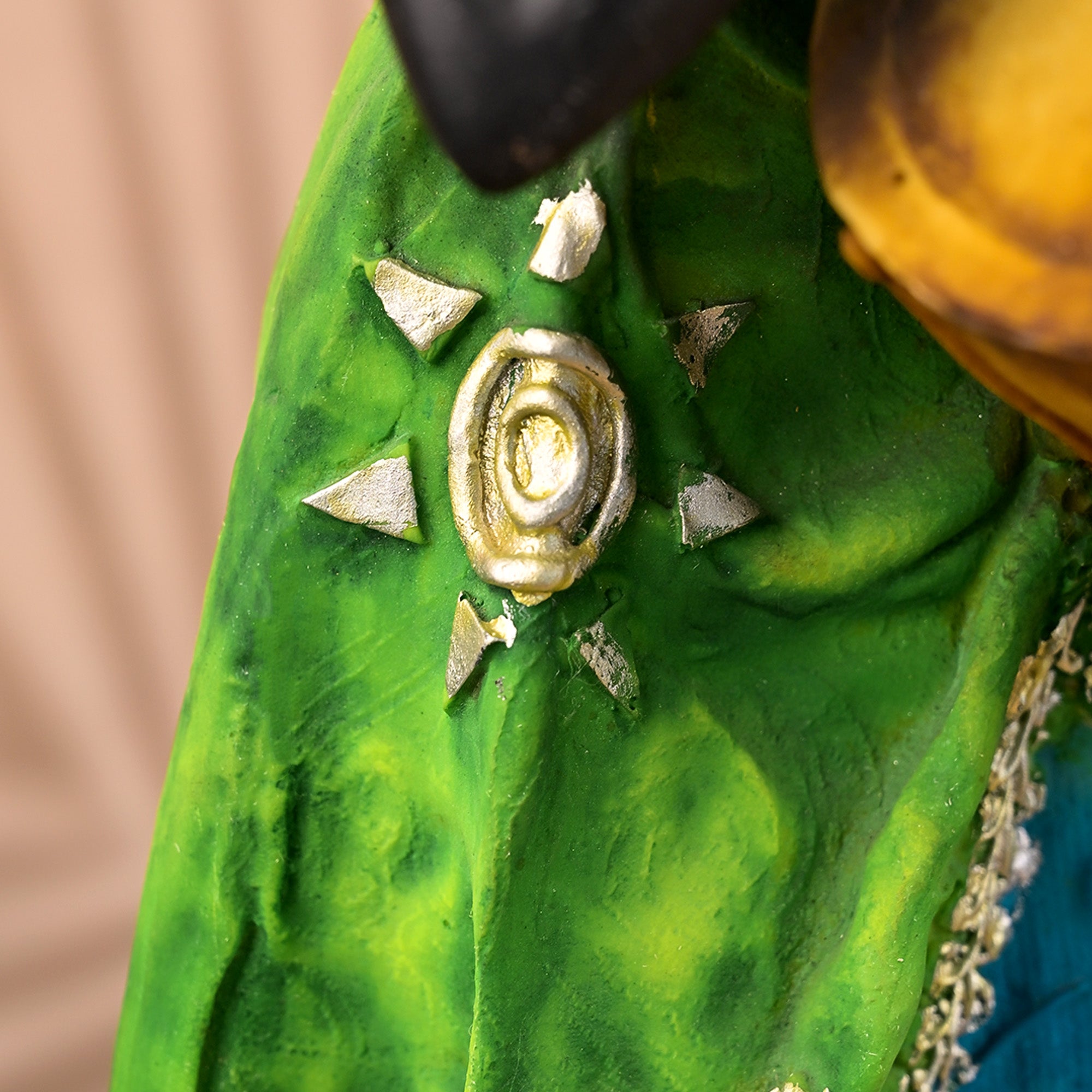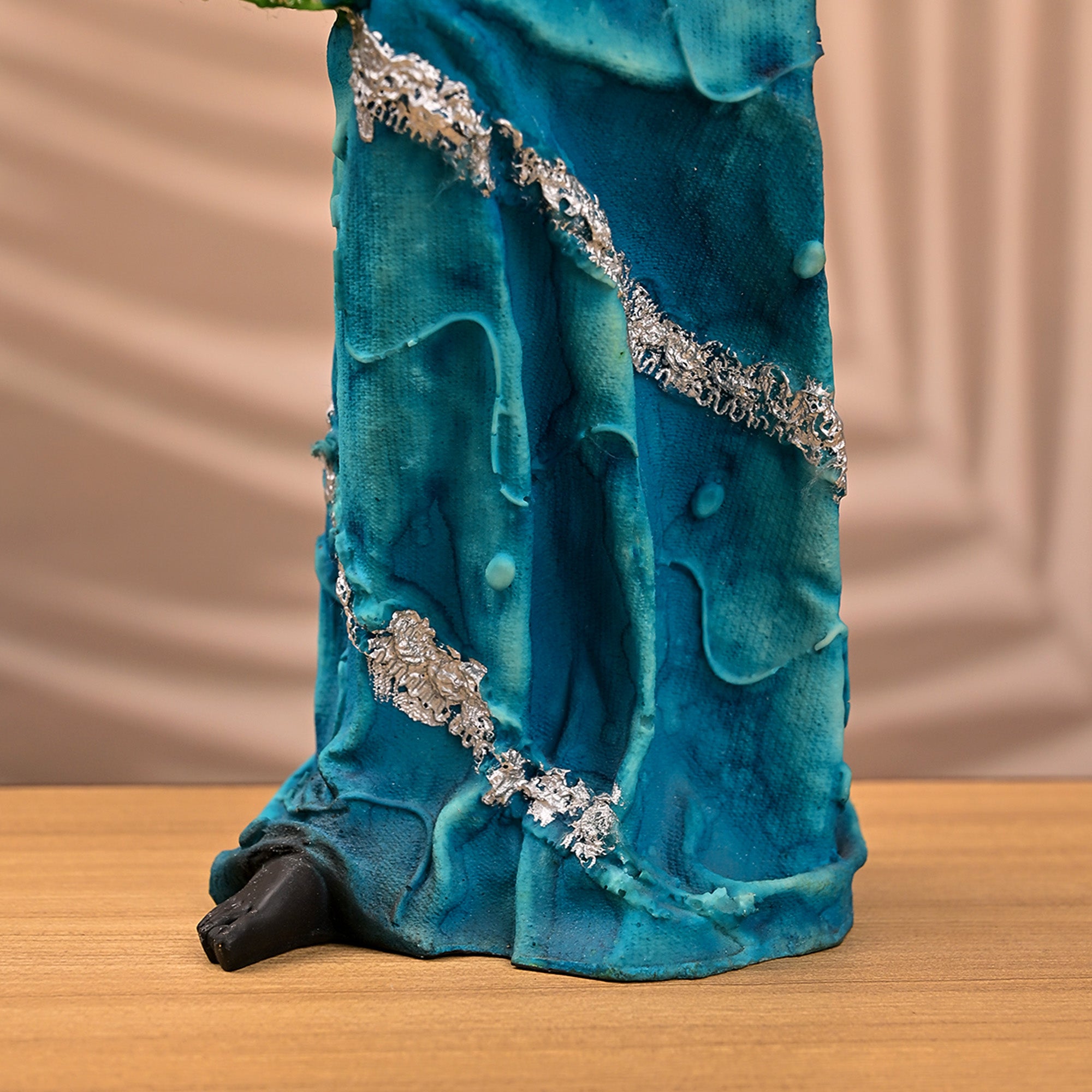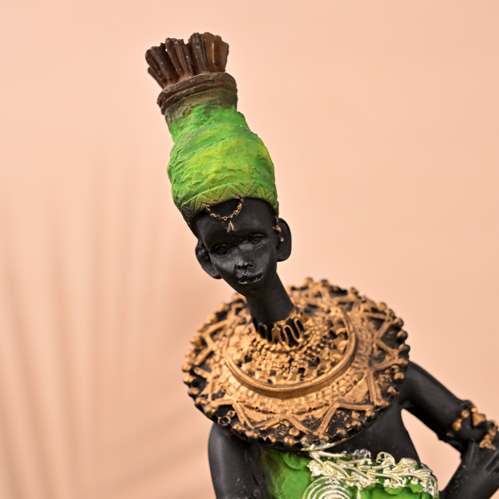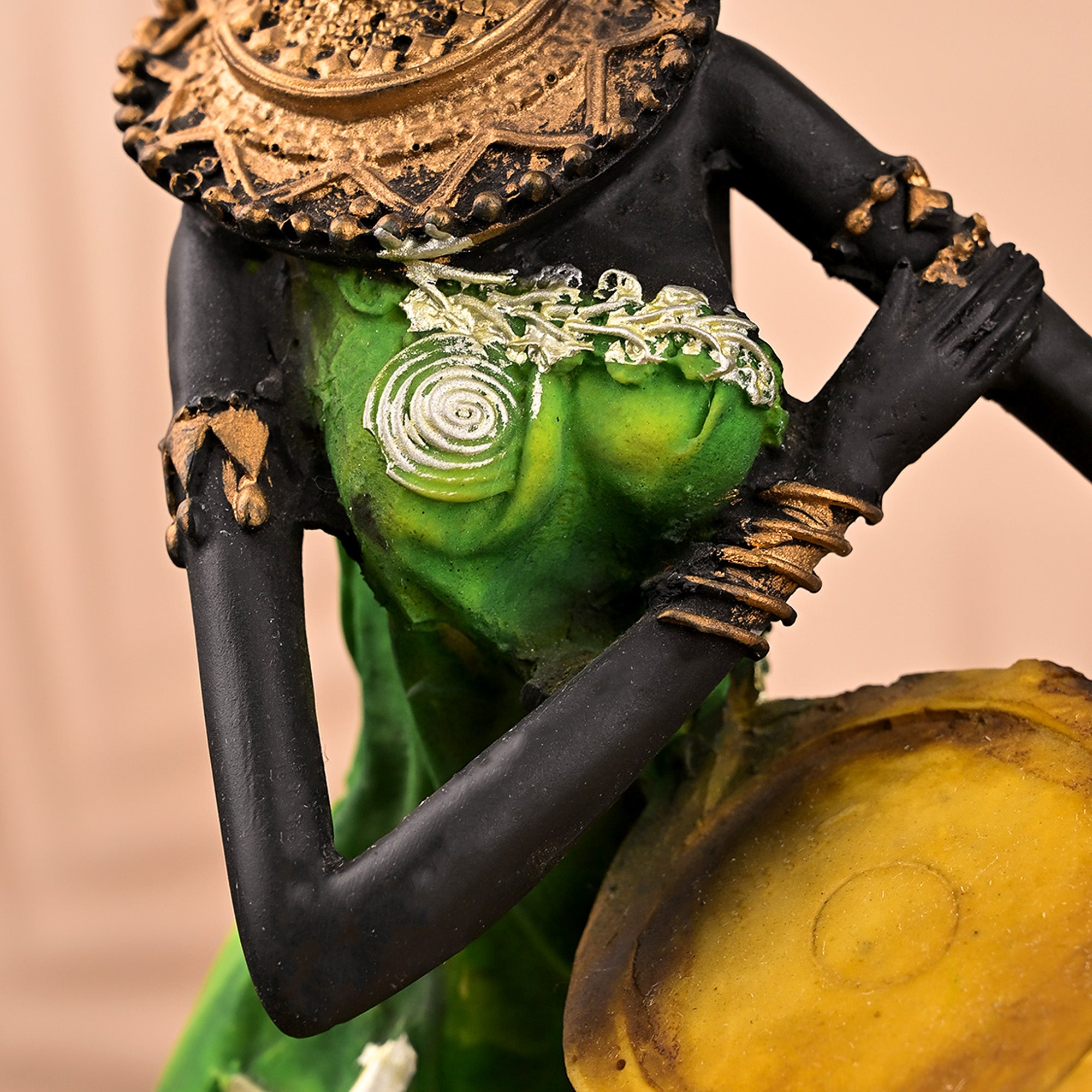 COD availableThe 'African Woman Holding Drum' statue is a vibrant piece celebrating the rich cultural heritage and melodic spirit of Africa. The sculpture depicts an African woman adorned in distinctive tribal jewellery, her mesmerizing dance posture synchronized with the beat of the drum as she plays it, representing togetherness in peace. The intricate detailing of her dress, jewellery, and drum smoothly contrasts in a rich blend of gold, bright green, and blue hues. Place it on a tabletop in your office or hallway to add depth to any space.