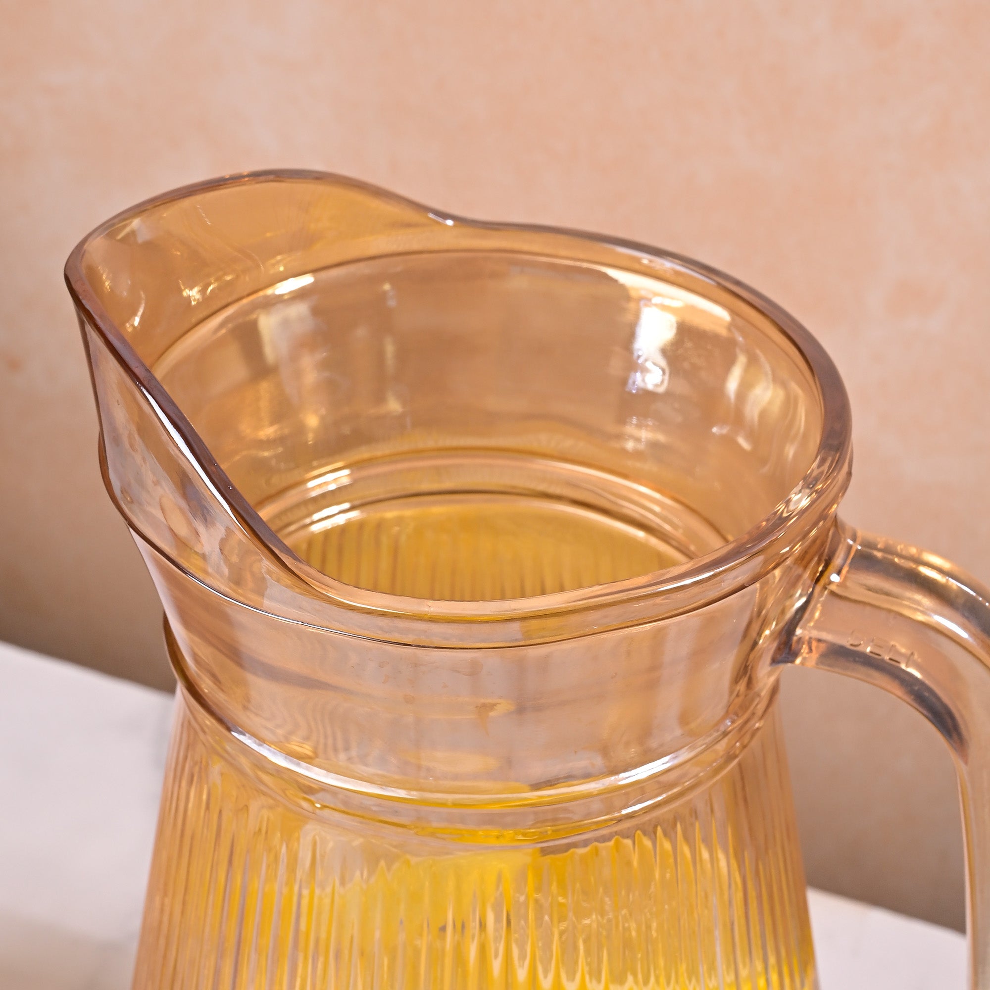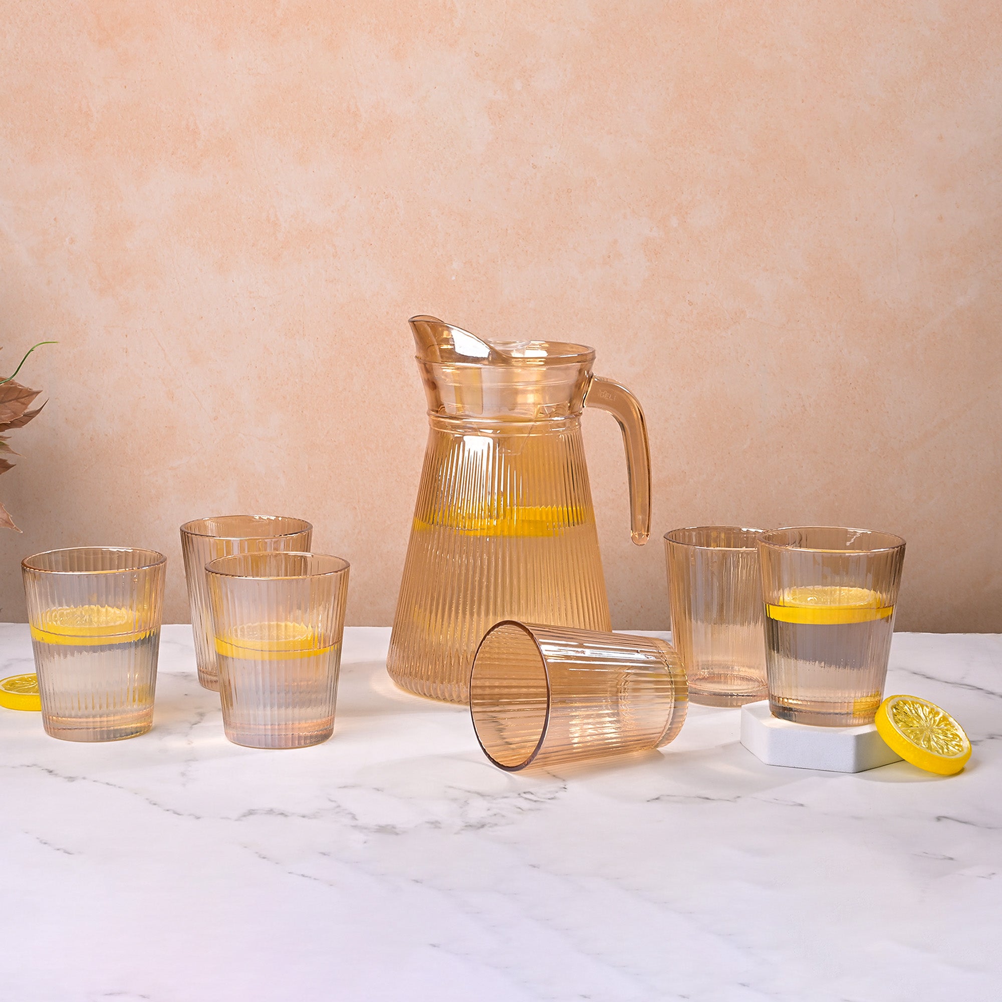 COD availableElevate your beverage service with a touch of vintage charm with this amber-tinted glass jug set. Featuring a sleek jug with a comfortable handle for easy pouring and matching ribbed glasses that offer a secure grip, this set blends minimalist elegance with functionality. It’s perfect for serving water, juices, iced teas, or infused beverages, making it ideal for both daily use and special gatherings. Whether your table setting is modern or classic, this set adds a warm, inviting touch to every occasion. Pour in style, sip in comfort, and enjoy every moment with this beautifully crafted glassware.