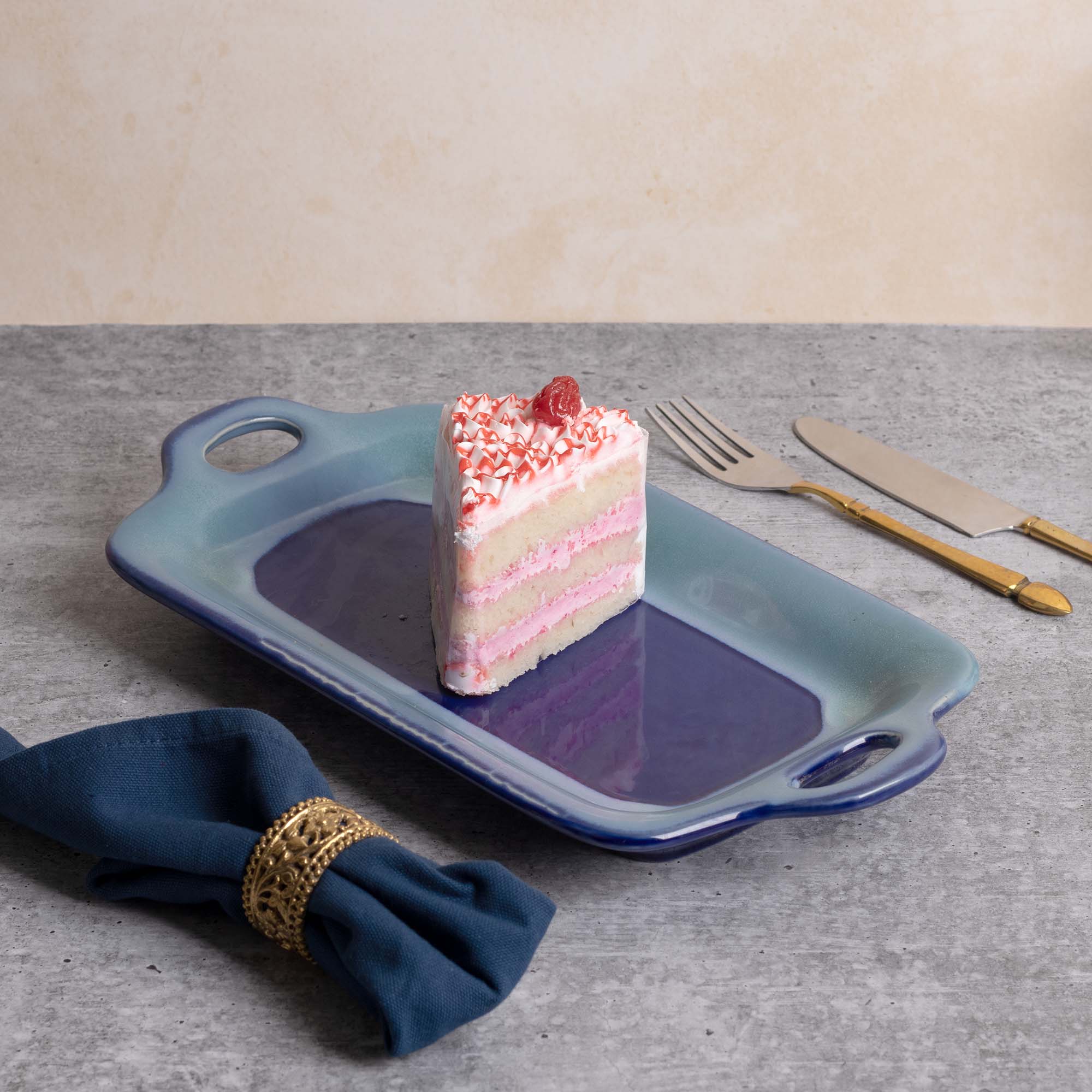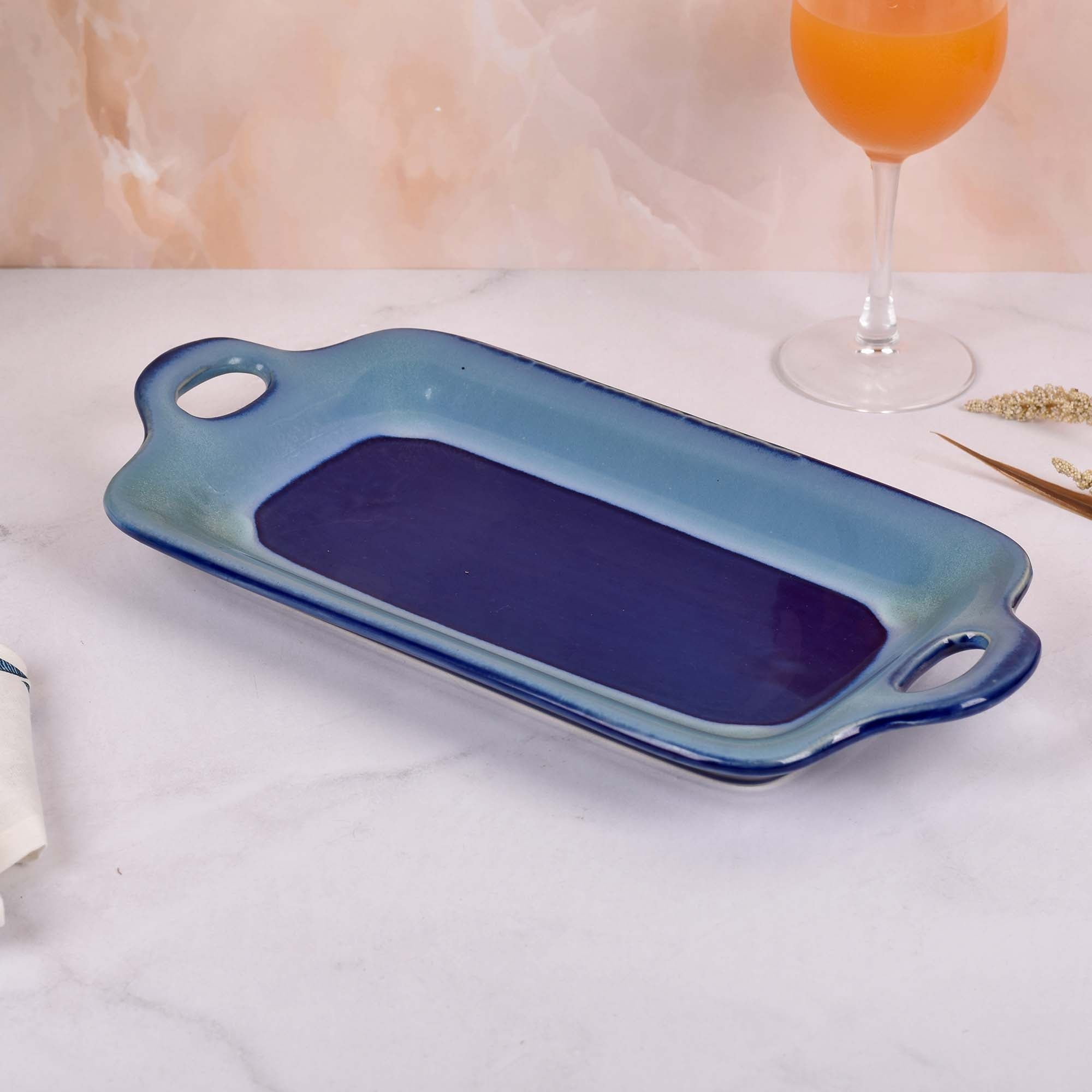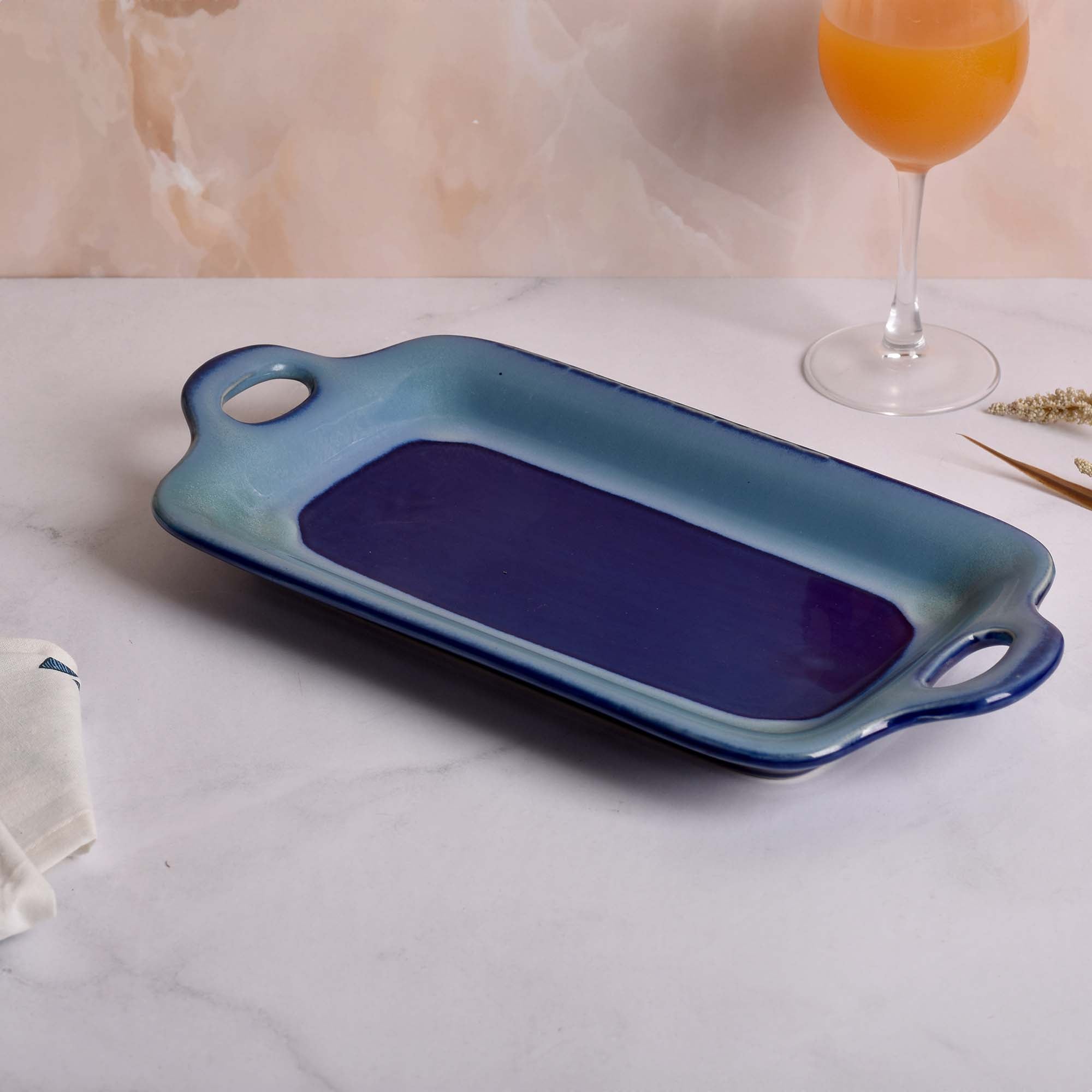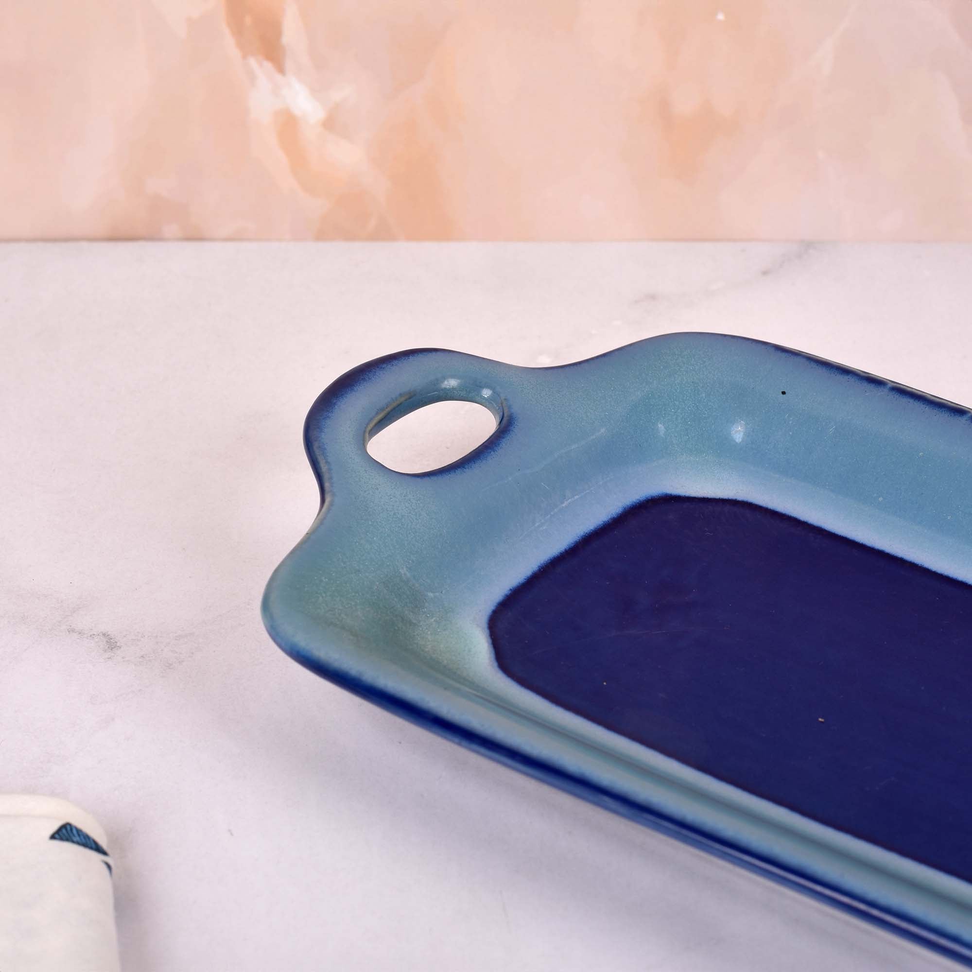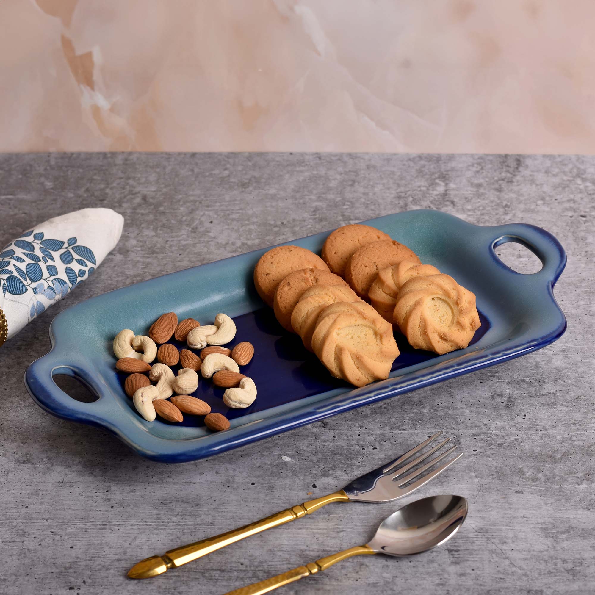 COD availableThis Aqua & Navy Ceramic Platter showcases a beautiful navy blue color glaze with a aqua blue rim that clearly warms its every serve. Its long curved shape is elegant yet easy to use, a shape that just draws the eye. There is an defining beauty in the hand-made surface, smooth, soothing and full of care. You can use it for dry snacks, cookies, starters or sweets while hosting or enjoying a personal moment. This platter carries visible sings of handwork, making it one of kind, just like the tiny moments it become part of.