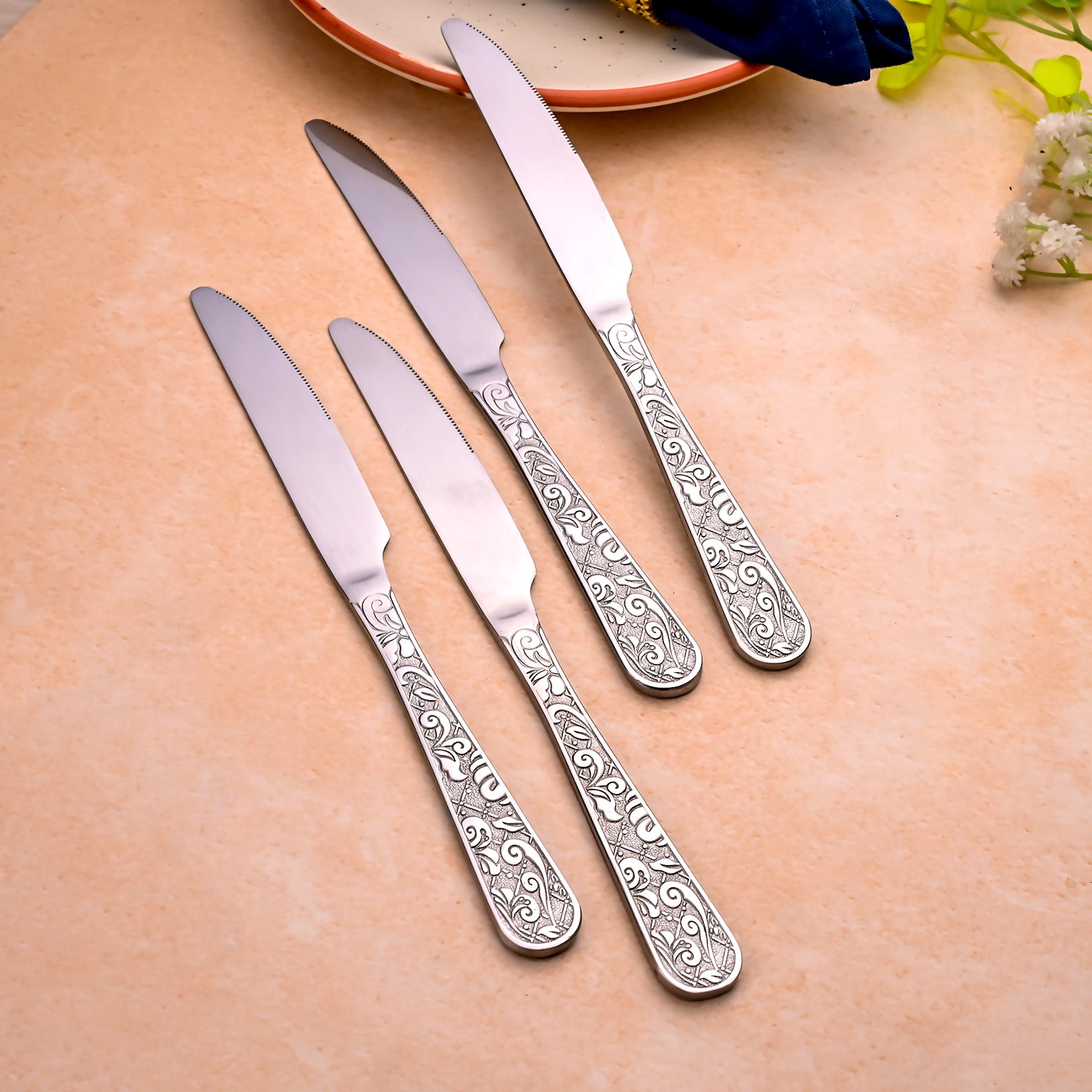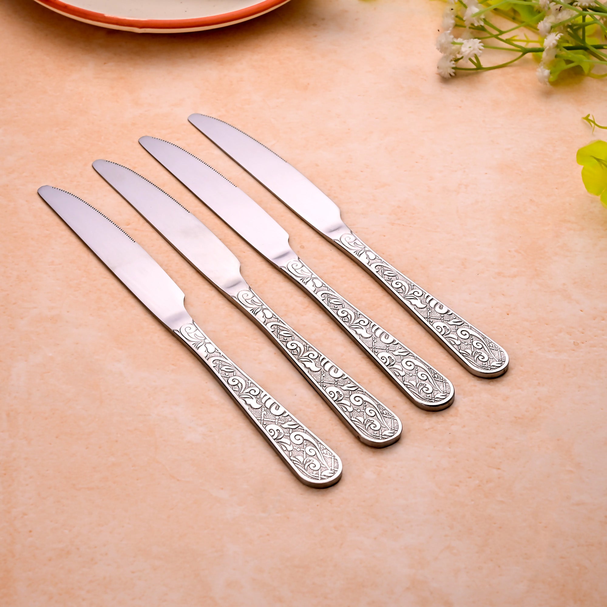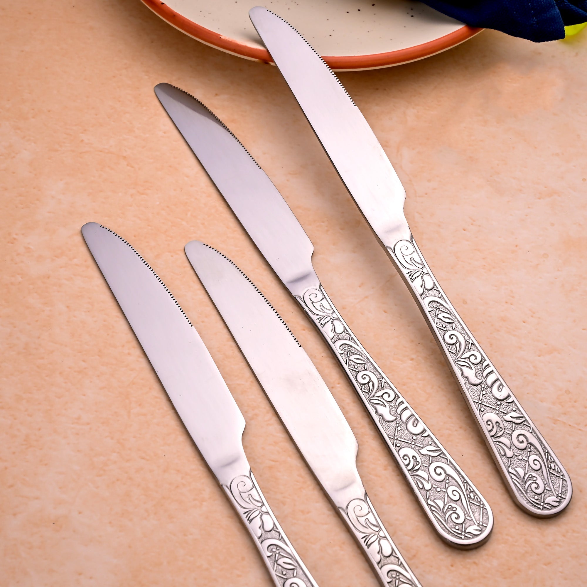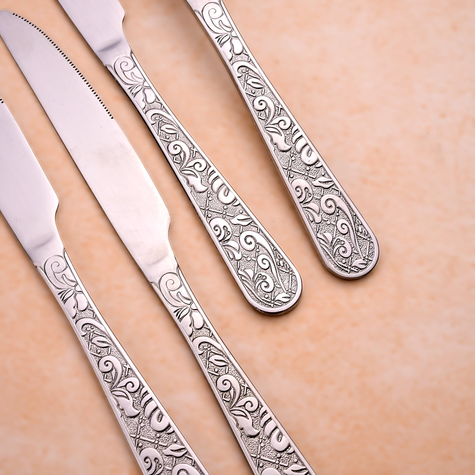 COD availableThe Artisan Edge Stainless Steel Knife brings elegance and sharpness to your dining table. Inspired by traditional fine silverware, this two-piece set of stainless steel knives has exquisitely crafted handles with elaborate Baroque-style patterns.
