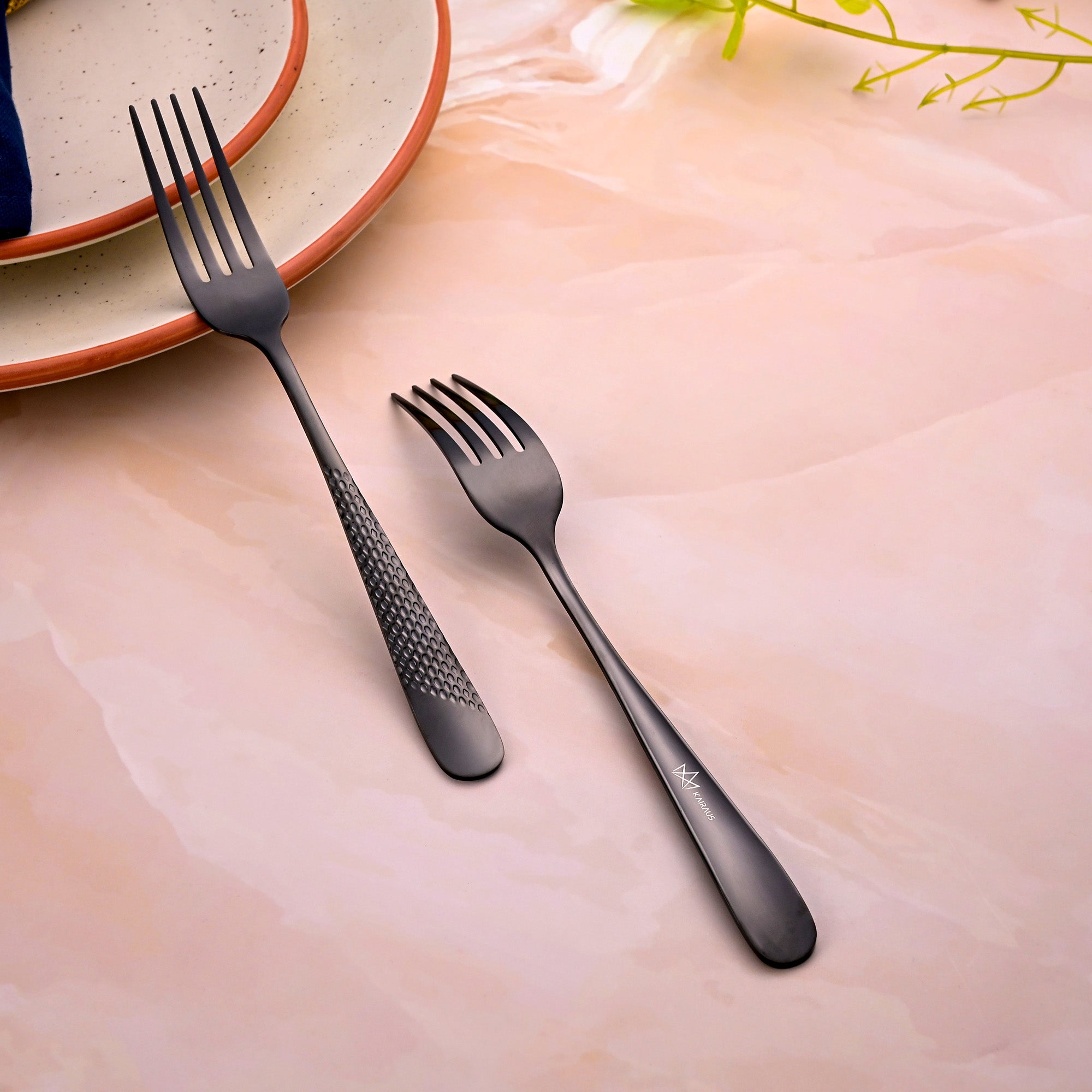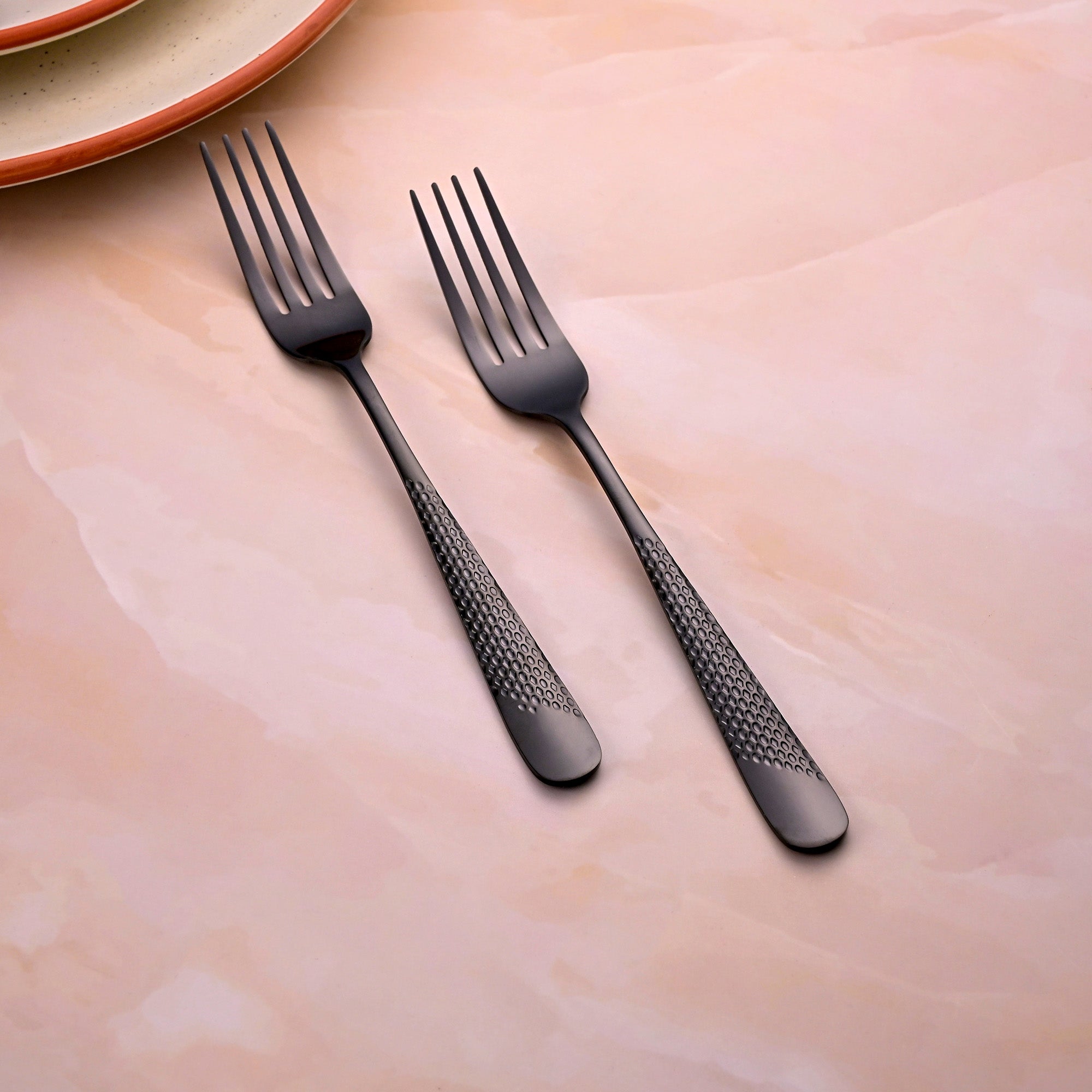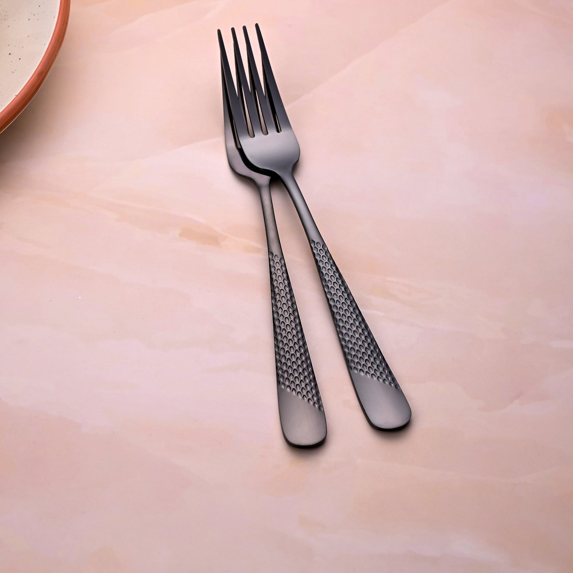 COD availableRaving a rich dessert is one thing, but enjoying it with the Black Flame Stainless Steel Fork takes it to a whole new level. This fork features a luxurious matte black finish and a hammered texture design on the handle, offering both style and a comfortable grip. Its elegant form makes every dessert moment feel special, Whether it's cake, pastries, or fruit bowls. Smooth to hold and stunning to look at, it’s the perfect match for your indulgent bit