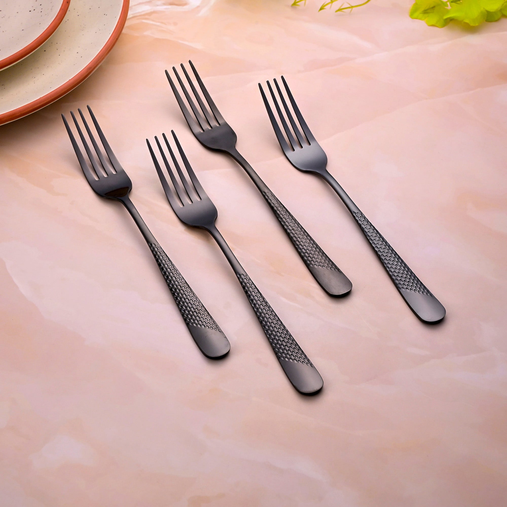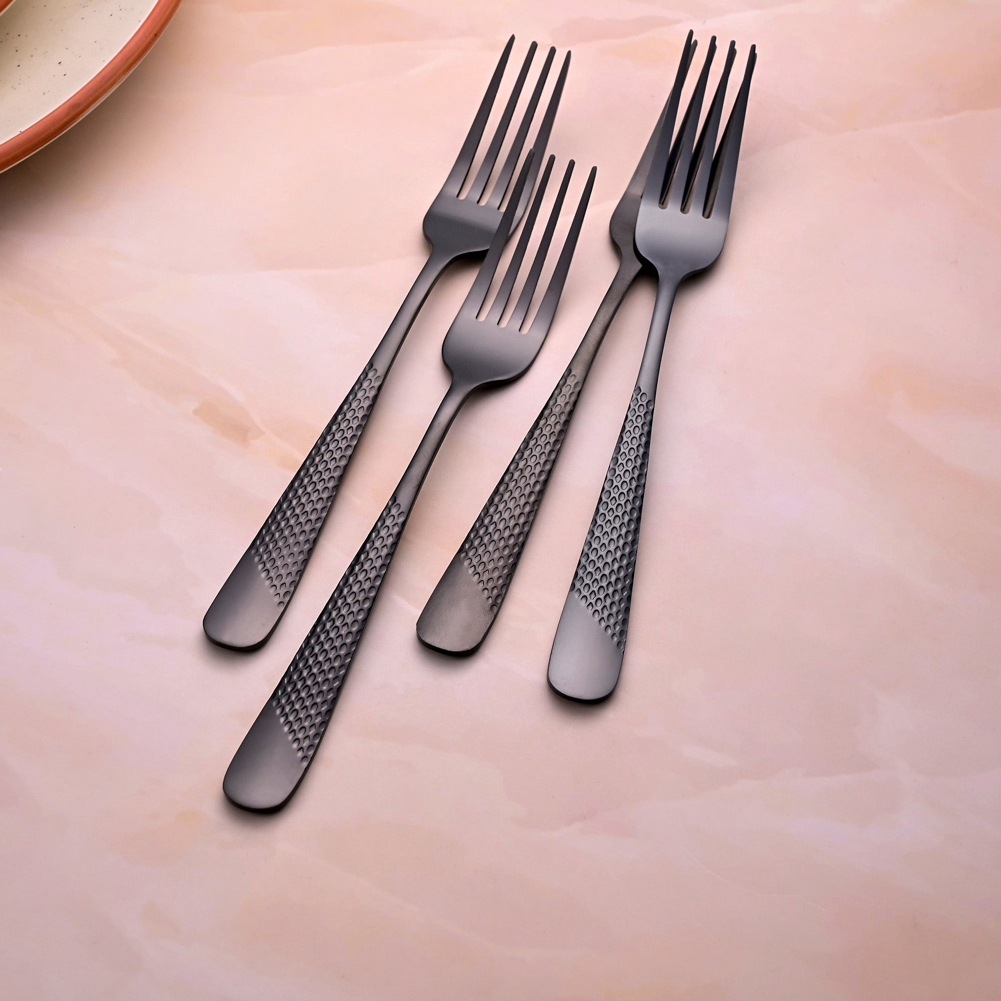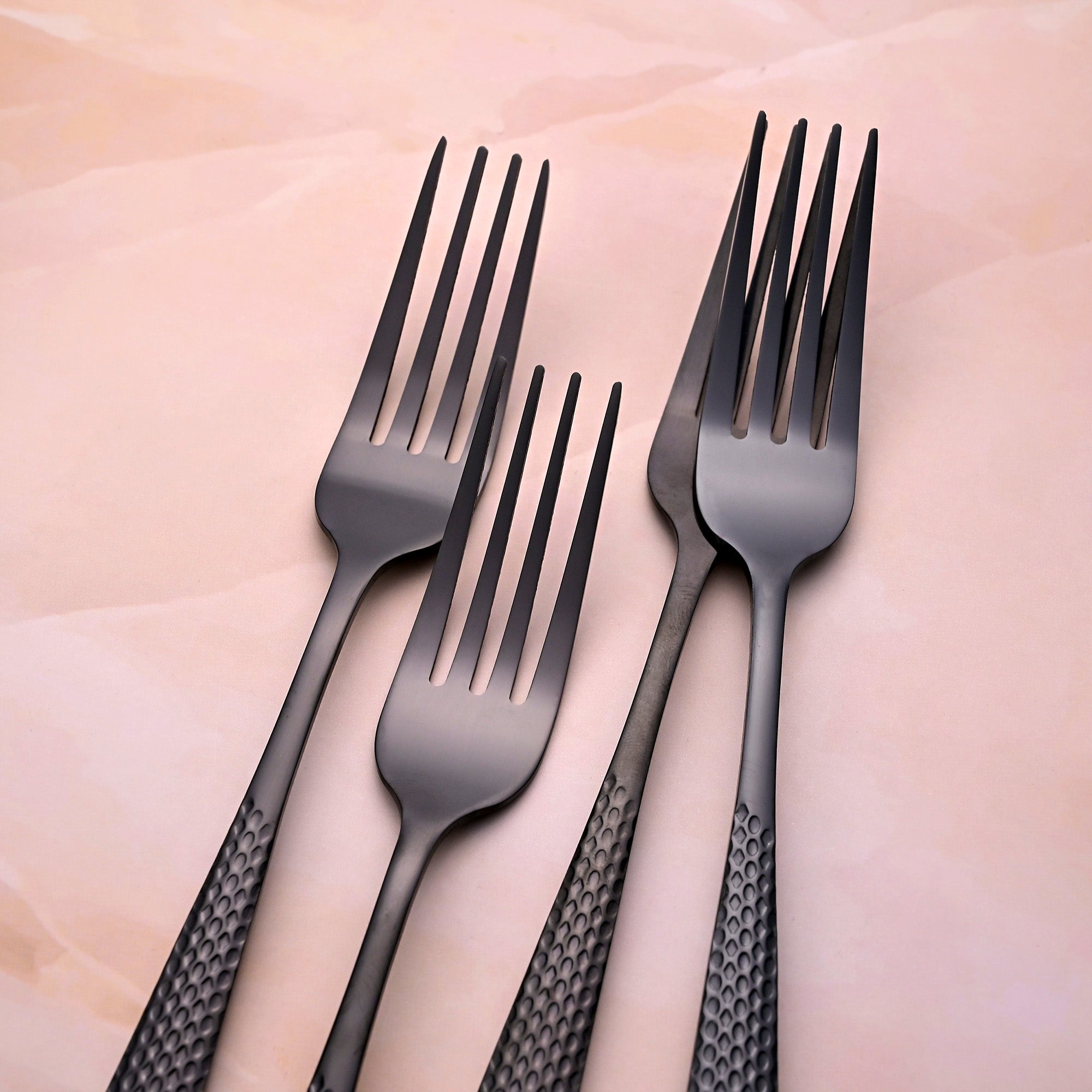COD availableRaving a rich dessert is one thing, but enjoying it with the Black Flame Stainless Steel Fork takes it to a whole new level. This fork features a luxurious matte black finish and a hammered texture design on the handle, offering both style and a comfortable grip. Its elegant form makes every dessert moment feel special, Whether it's cake, pastries, or fruit bowls. Smooth to hold and stunning to look at, it’s the perfect match for your indulgent bit