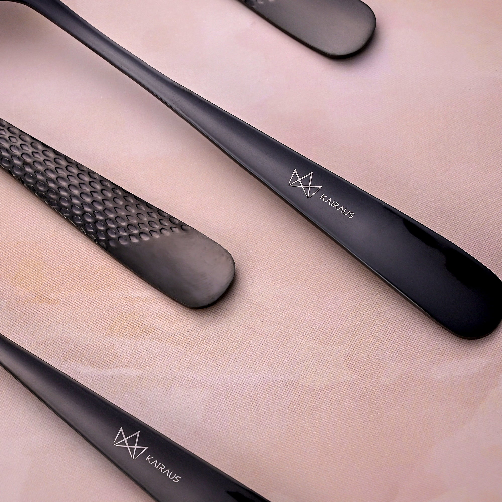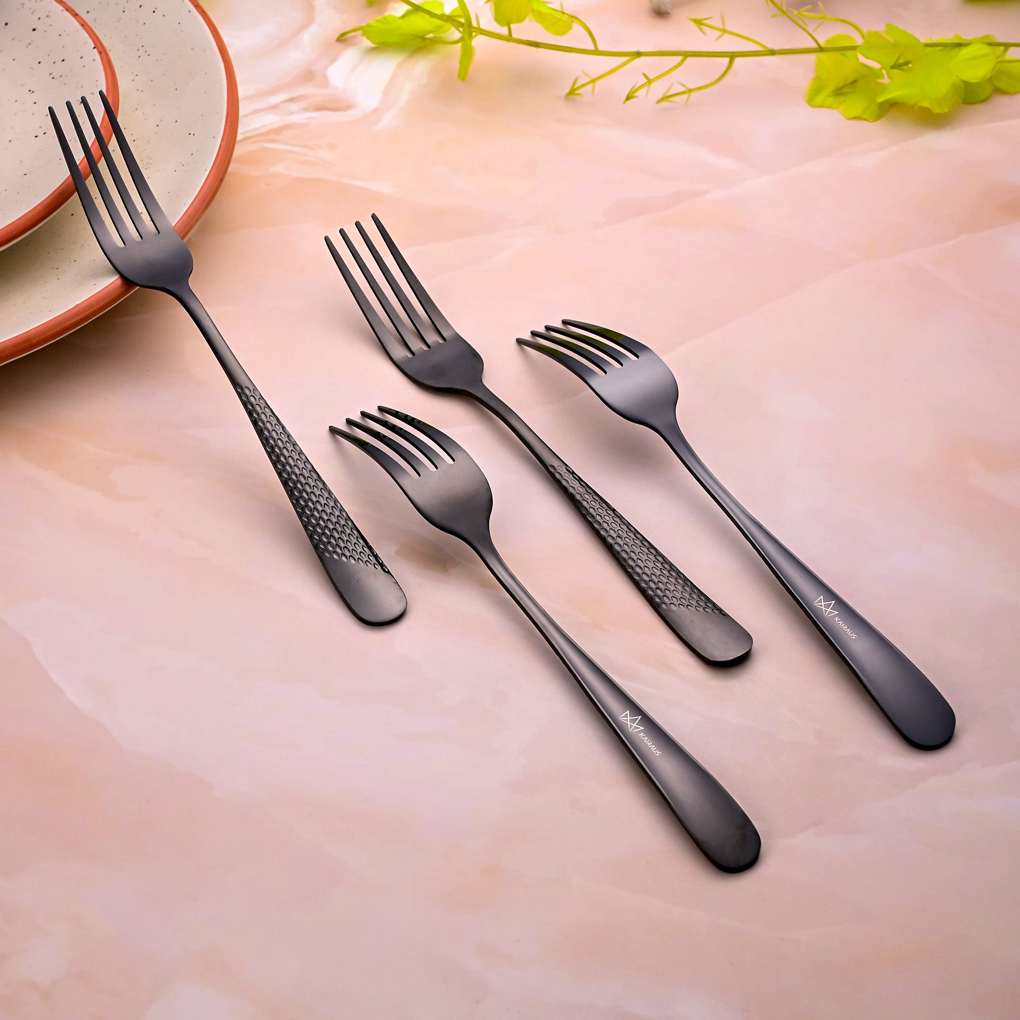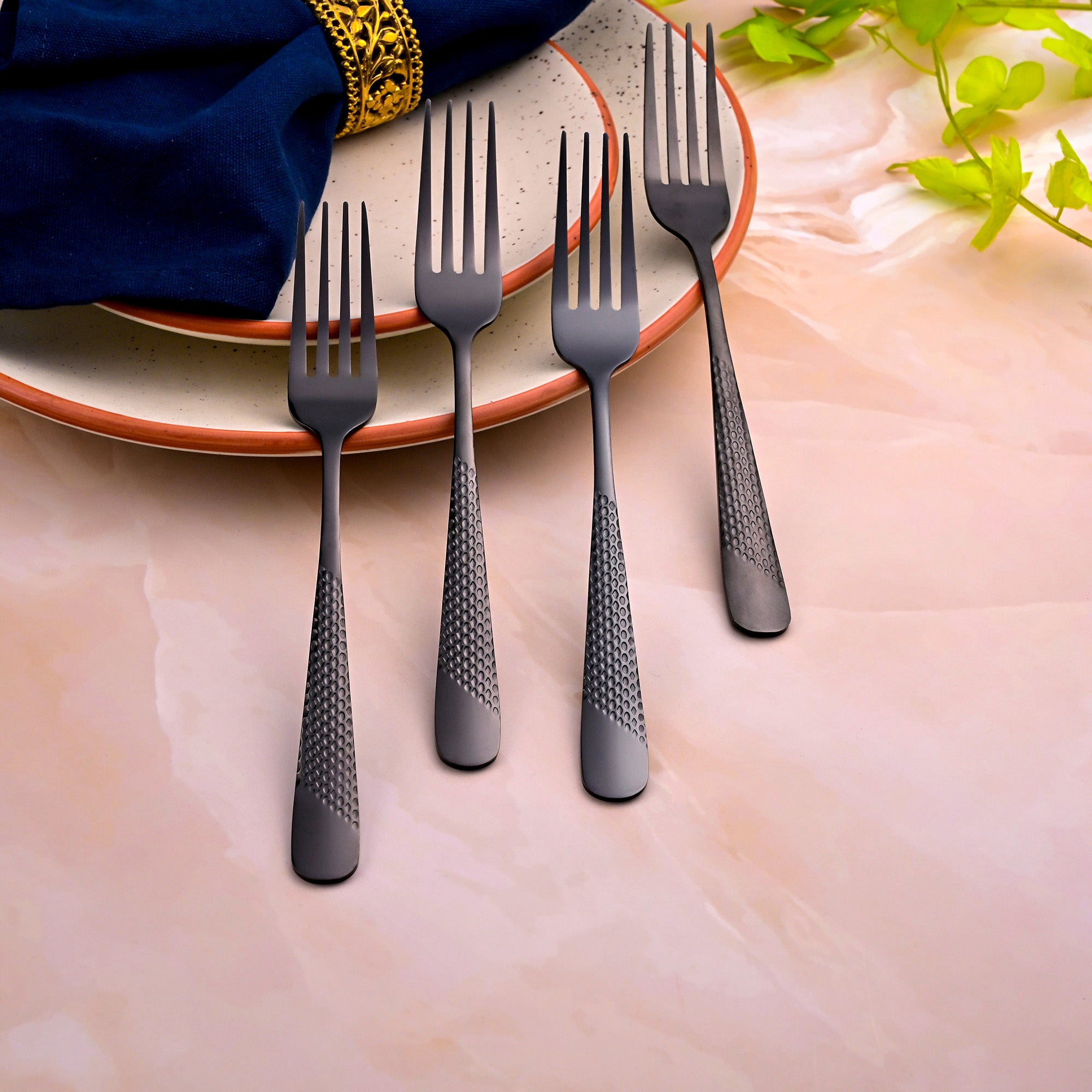 COD availableRaving a rich dessert is one thing, but enjoying it with the Black Flame Stainless Steel Fork takes it to a whole new level. This fork features a luxurious matte black finish and a hammered texture design on the handle, offering both style and a comfortable grip. Its elegant form makes every dessert moment feel special, Whether it's cake, pastries, or fruit bowls. Smooth to hold and stunning to look at, it’s the perfect match for your indulgent bit