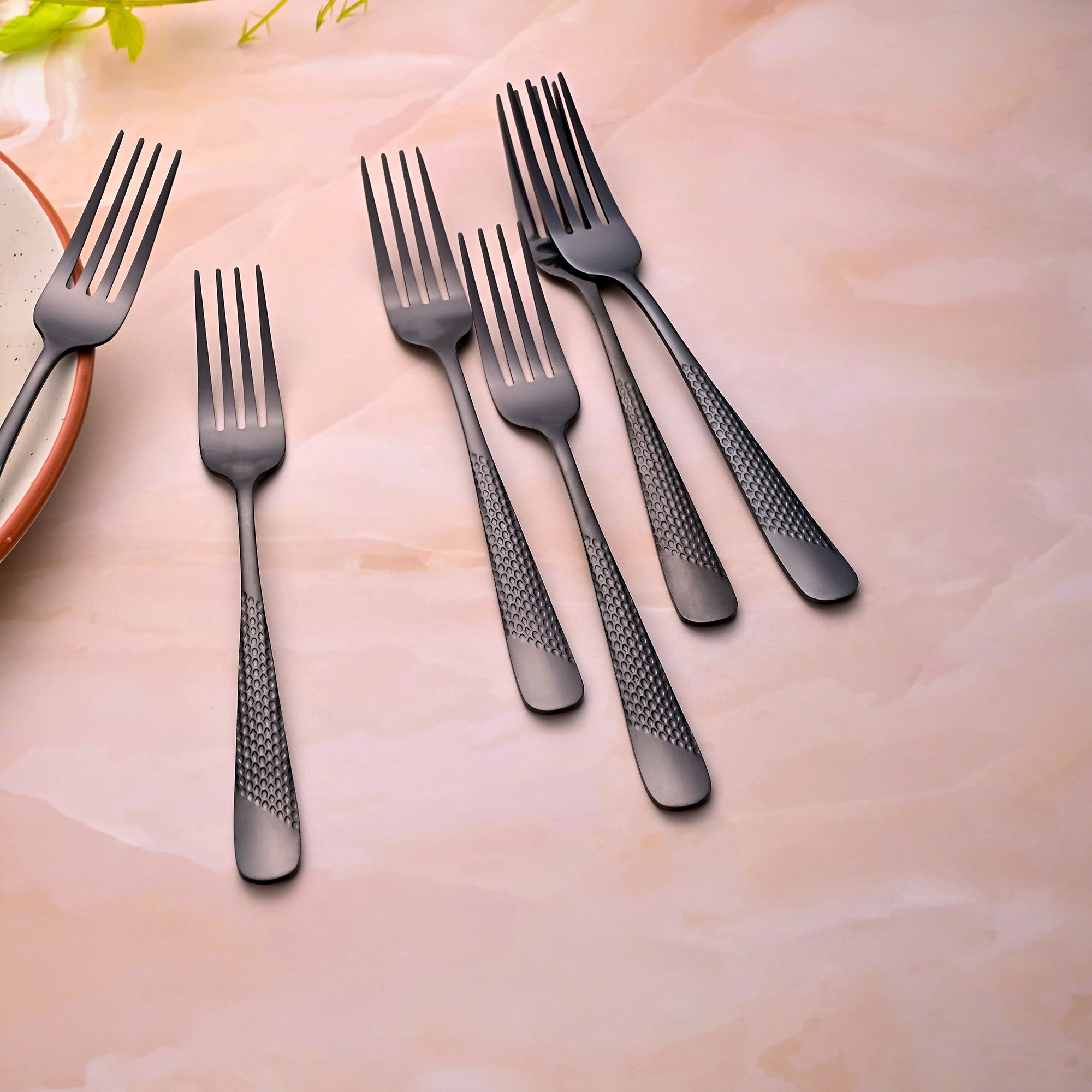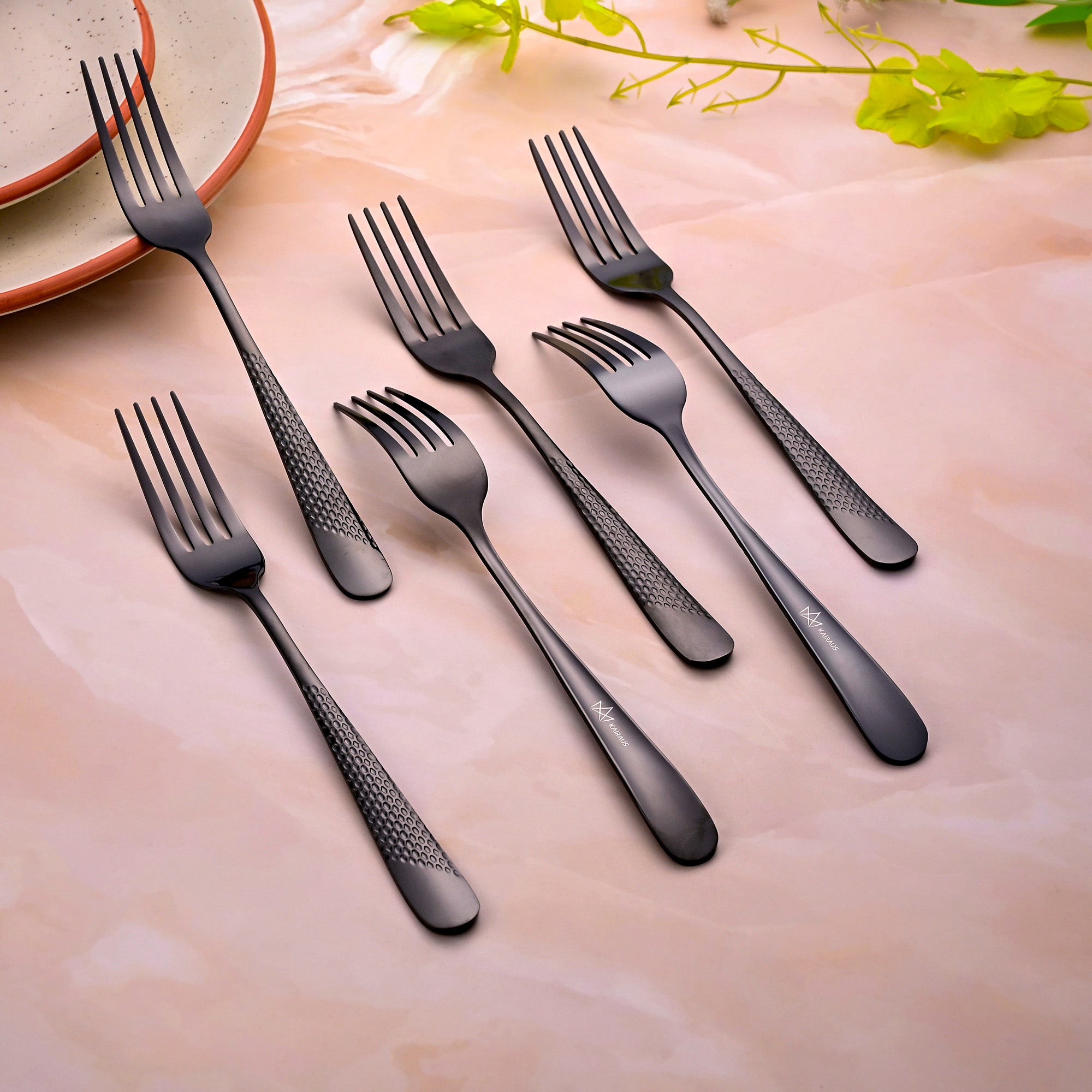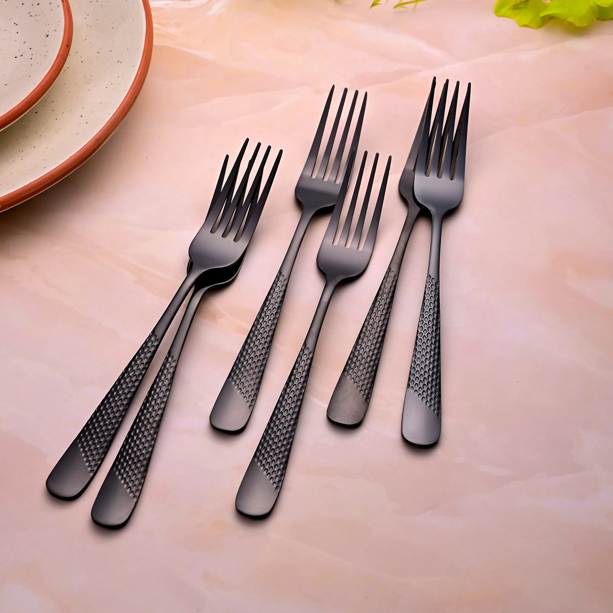 COD availableRaving a rich dessert is one thing, but enjoying it with the Black Flame Stainless Steel Fork takes it to a whole new level. This fork features a luxurious matte black finish and a hammered texture design on the handle, offering both style and a comfortable grip. Its elegant form makes every dessert moment feel special, Whether it's cake, pastries, or fruit bowls. Smooth to hold and stunning to look at, it’s the perfect match for your indulgent bit
