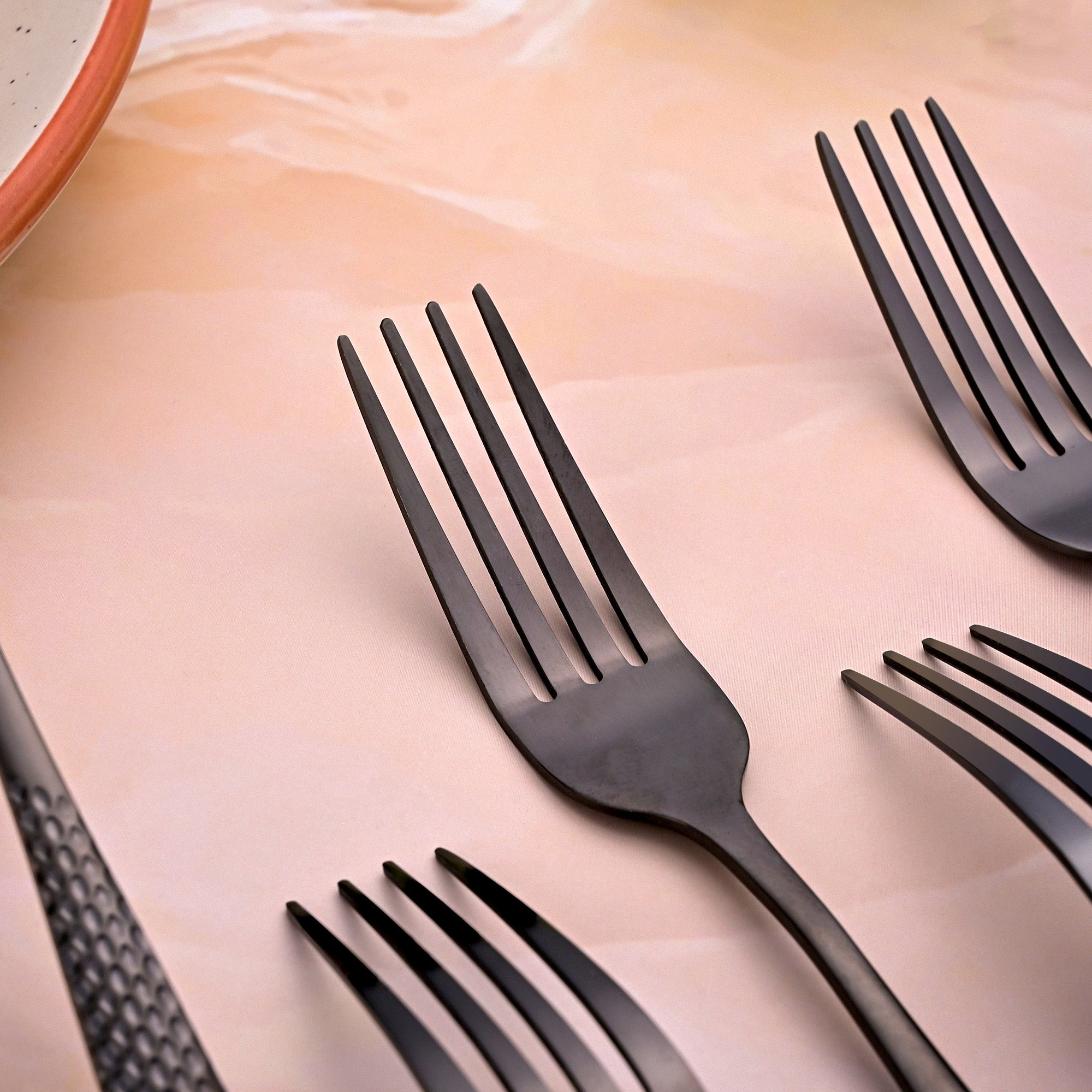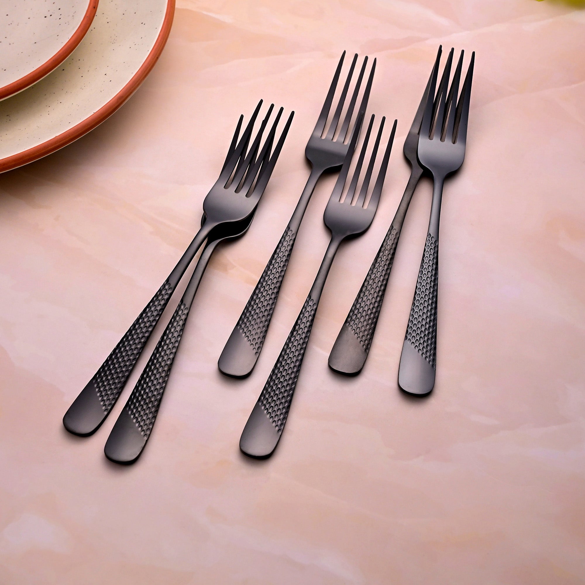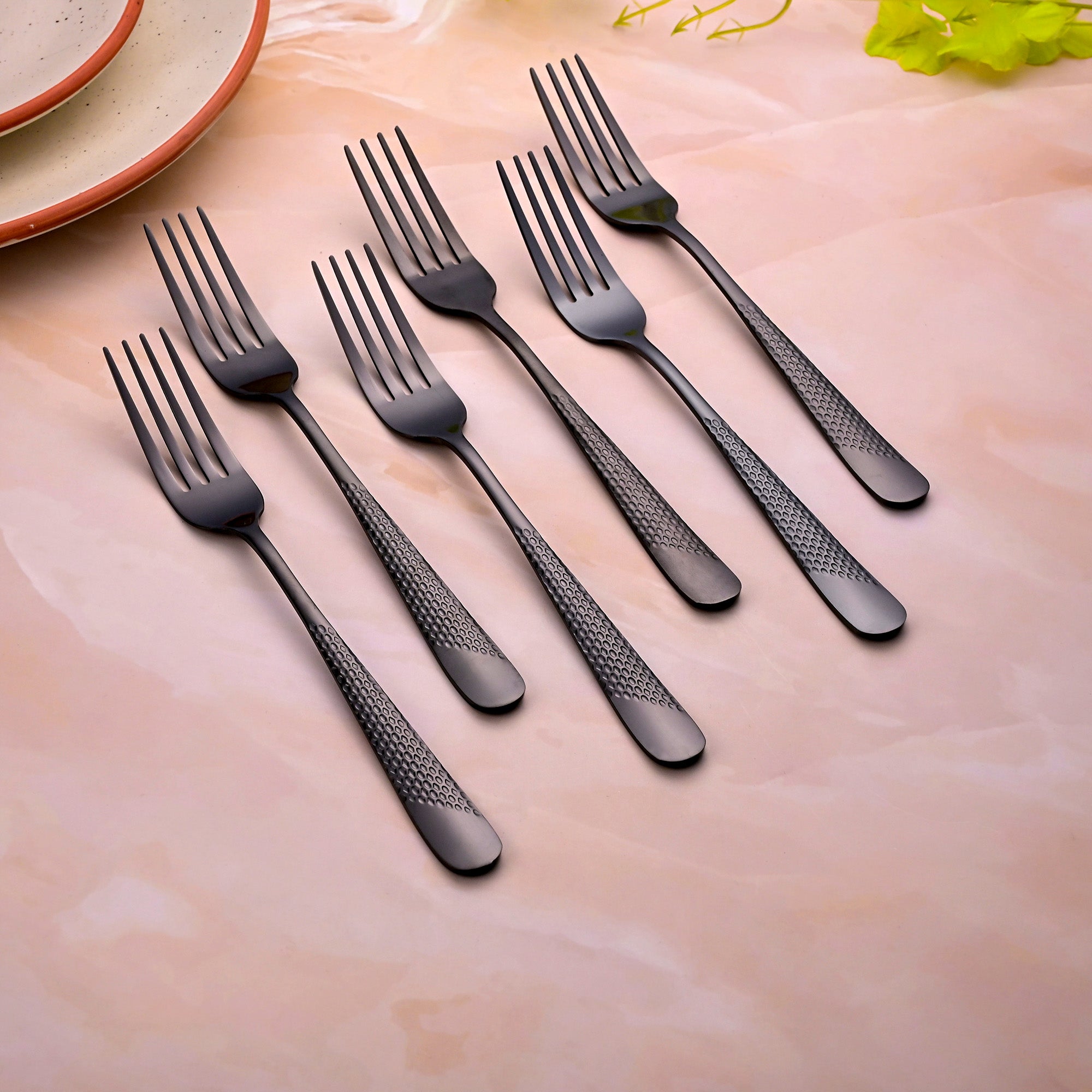 COD availableRaving a rich dessert is one thing, but enjoying it with the Black Flame Stainless Steel Fork takes it to a whole new level. This fork features a luxurious matte black finish and a hammered texture design on the handle, offering both style and a comfortable grip. Its elegant form makes every dessert moment feel special, Whether it's cake, pastries, or fruit bowls. Smooth to hold and stunning to look at, it’s the perfect match for your indulgent bit