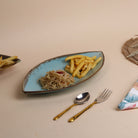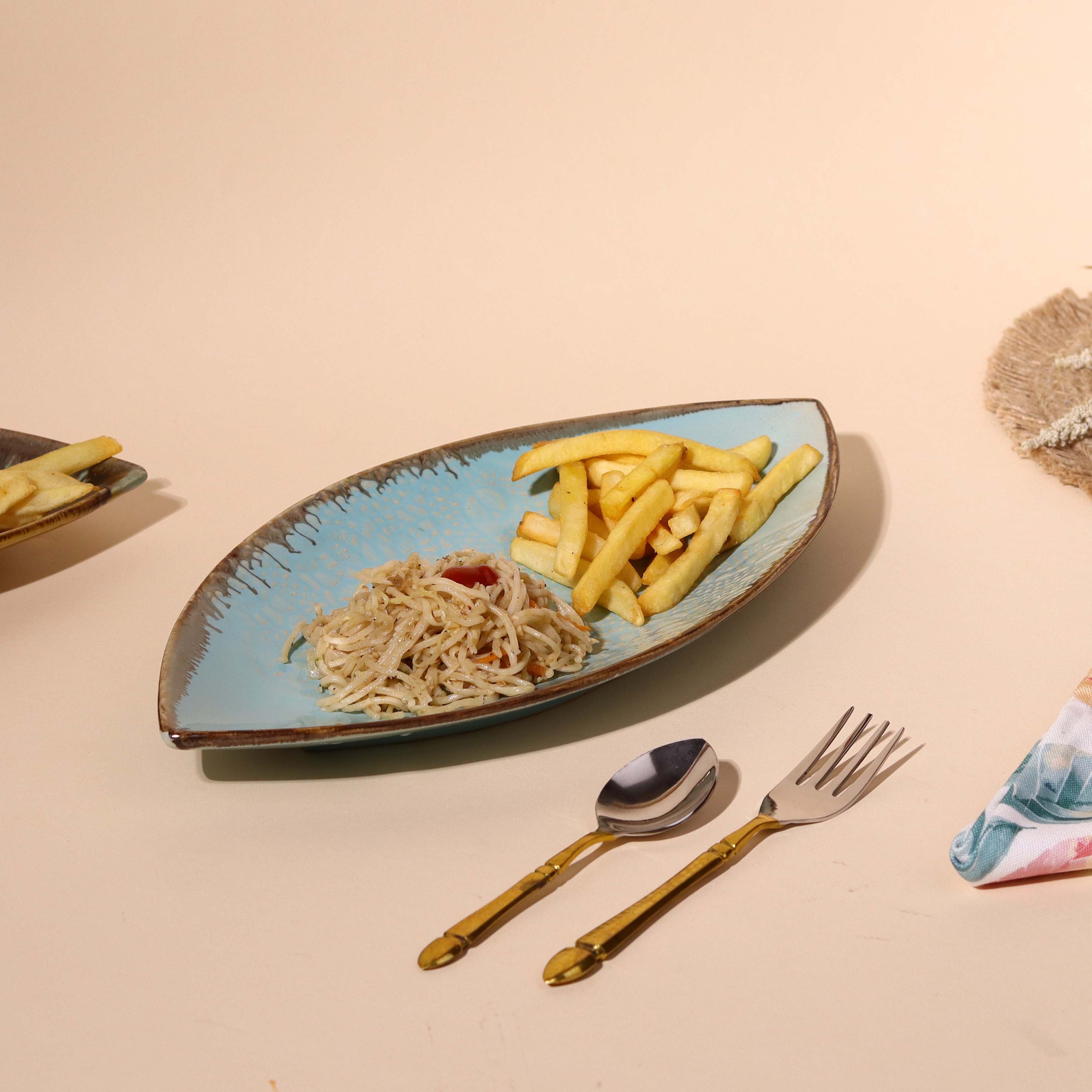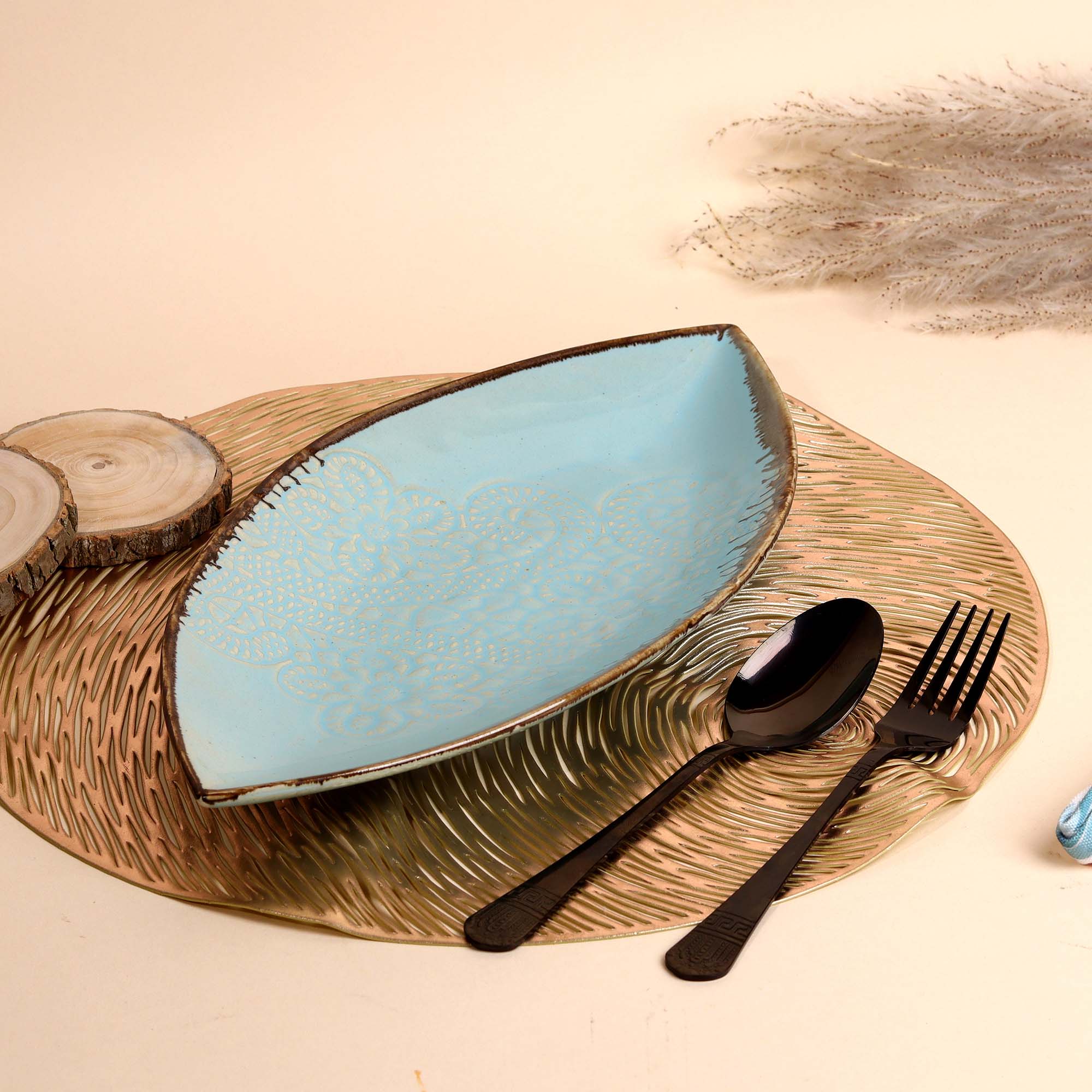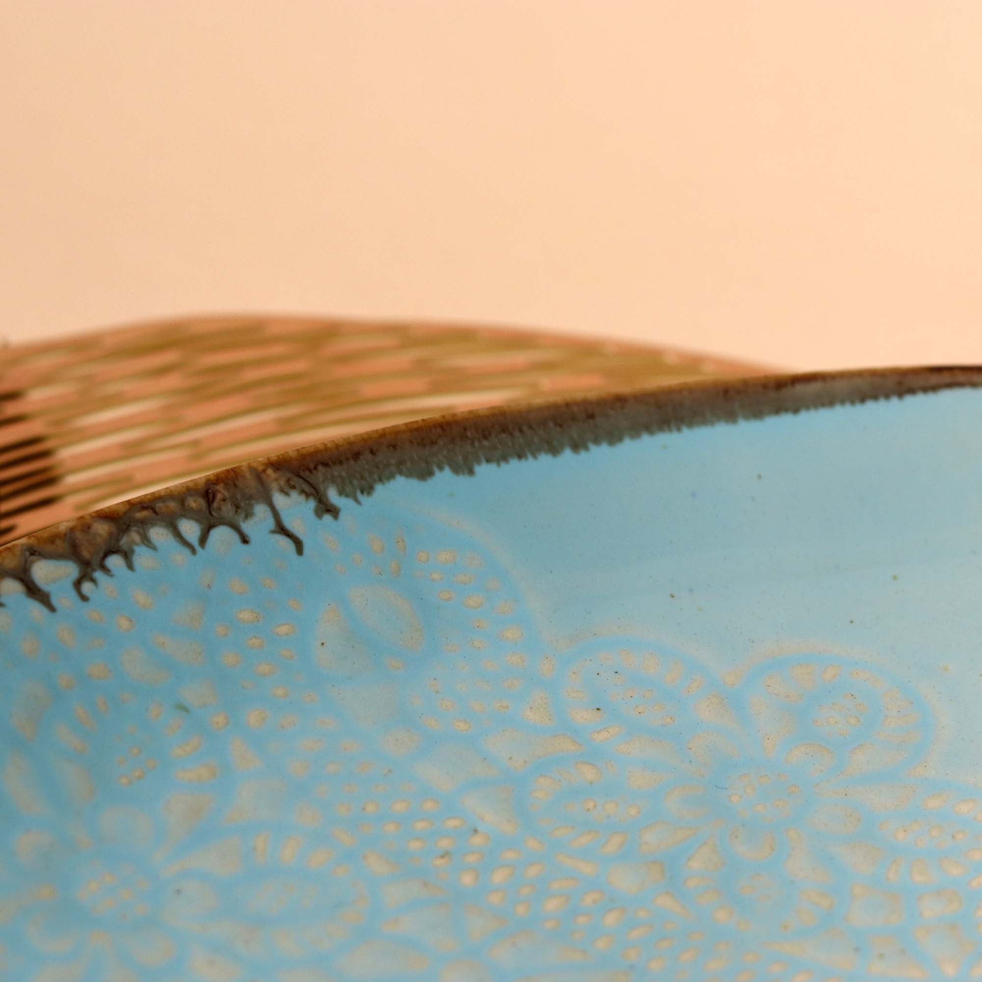 COD availableThis handcrafted Sky Blue Leaf Lace Platter has a soft sky blue base with a sweet floral impression and a deep brown glaze rim. It has an visual appeal that feels like art in motion, as well as earthy, textured, and soulful beauty. The leaf-like shape gives it an elegant but flowing form, perfect for serving holiday treats or dry snacks, or simply to enjoy and beautify your table. Each piece will show subtle signs of handwork making it unique just like every time it helps you serve and enjoy.