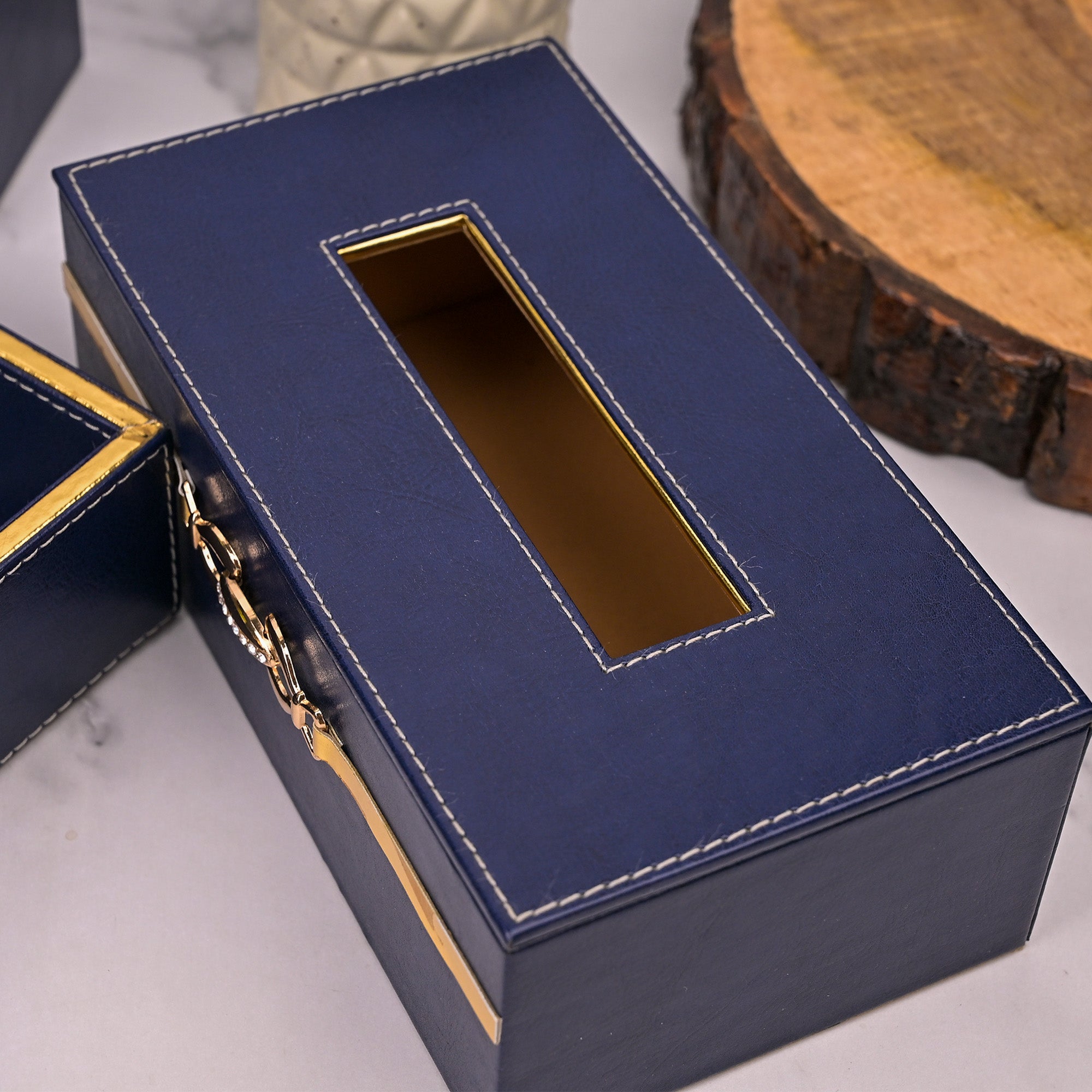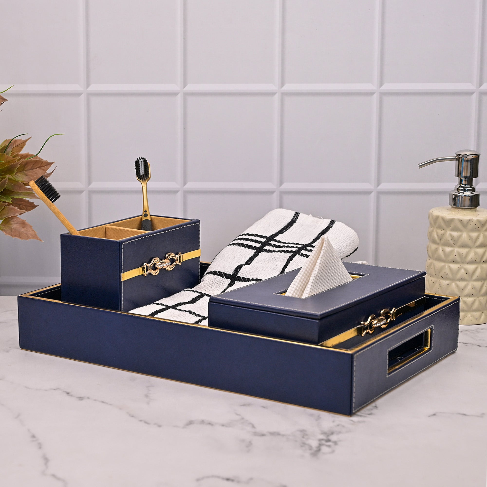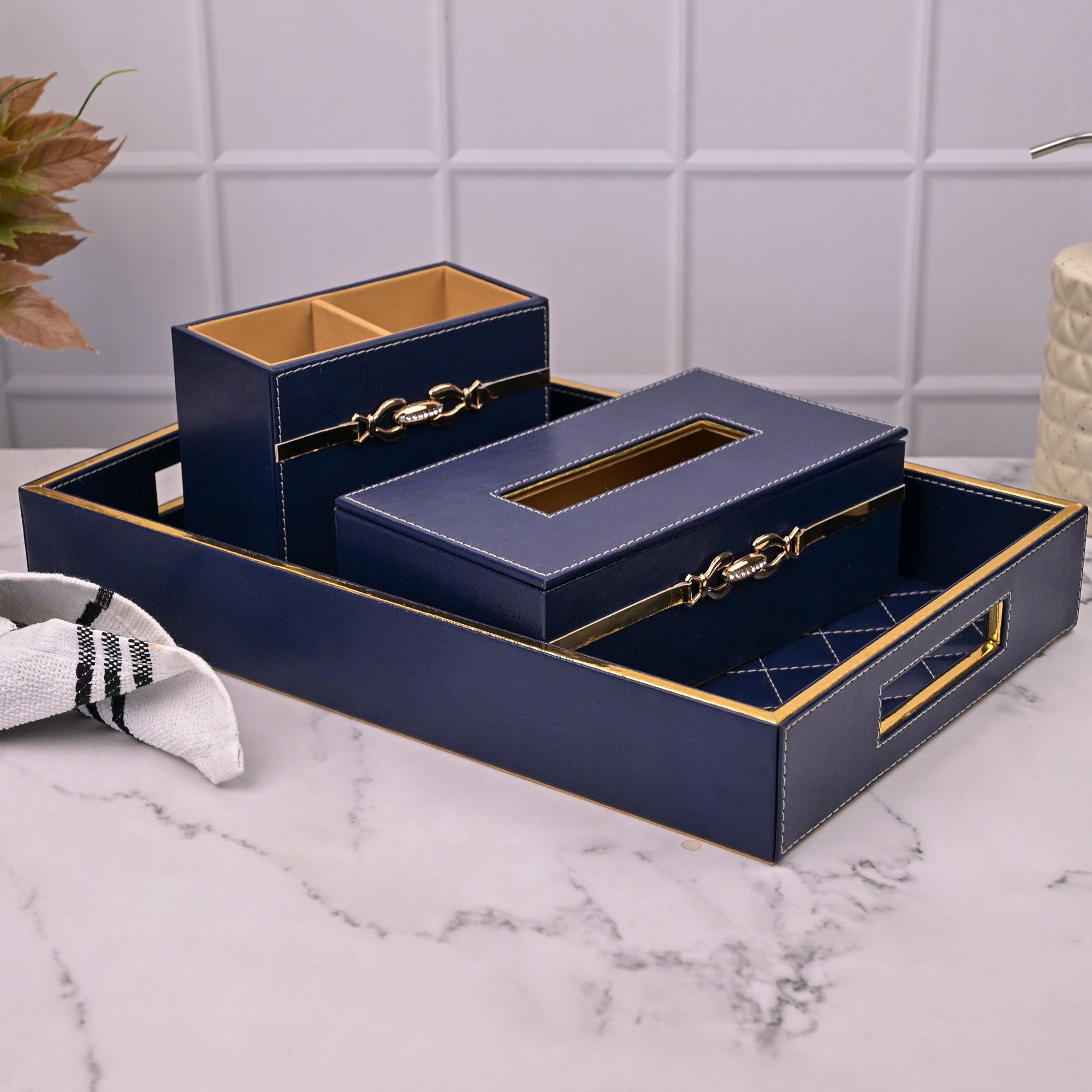 COD availableThis elegant blue leather bathroom accessory set includes a stylish tray, a storage box, and a tissue holder box, all crafted from high-quality leather. The tray provide ample space for organizing toiletries and essentials, while the storage box offers a chic solution for keeping items neatly tucked away. The tissue holder box adds a touch of sophistication, making this set a perfect addition to any modern bathroom decor.