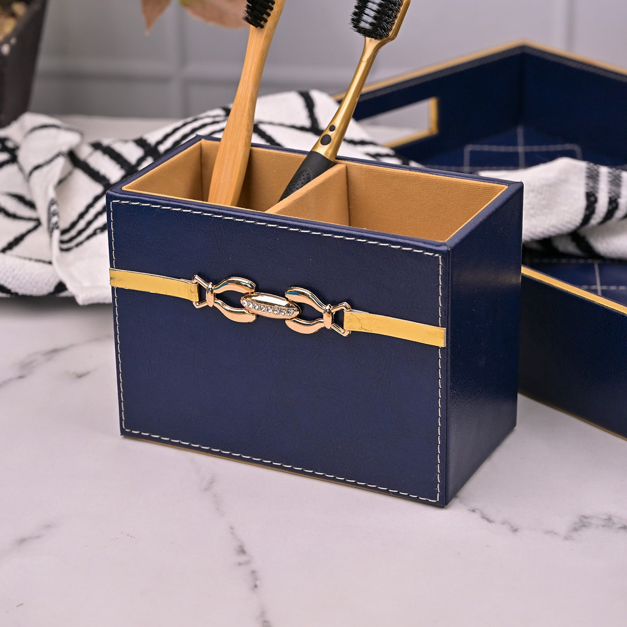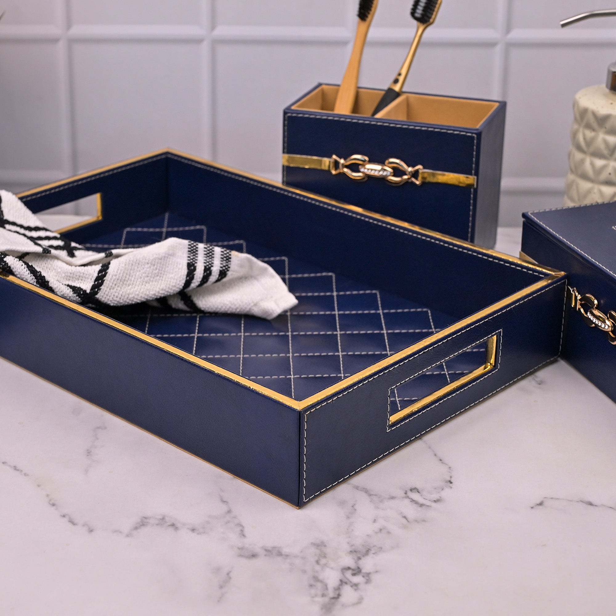 Blue Leather Bathroom Accessory Set