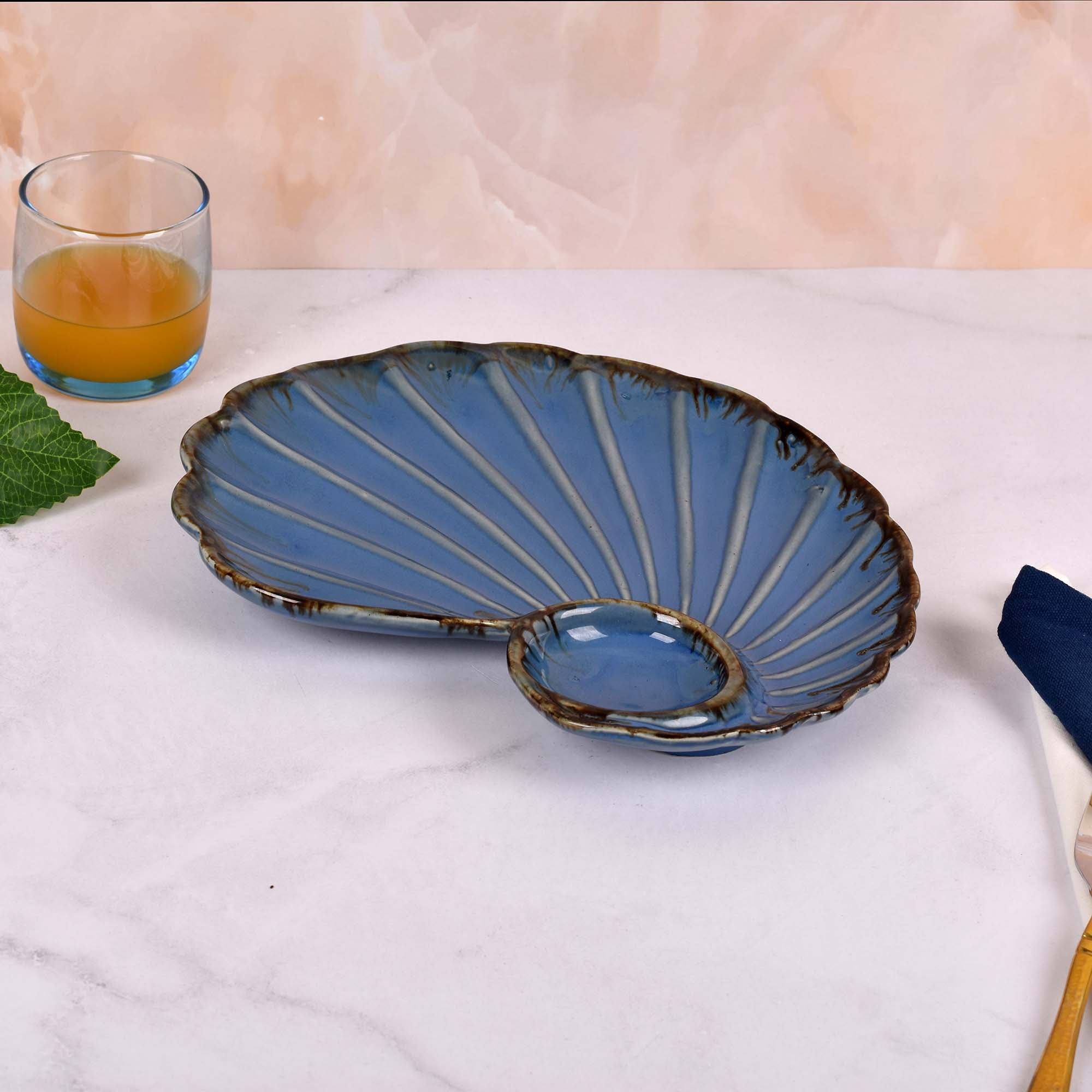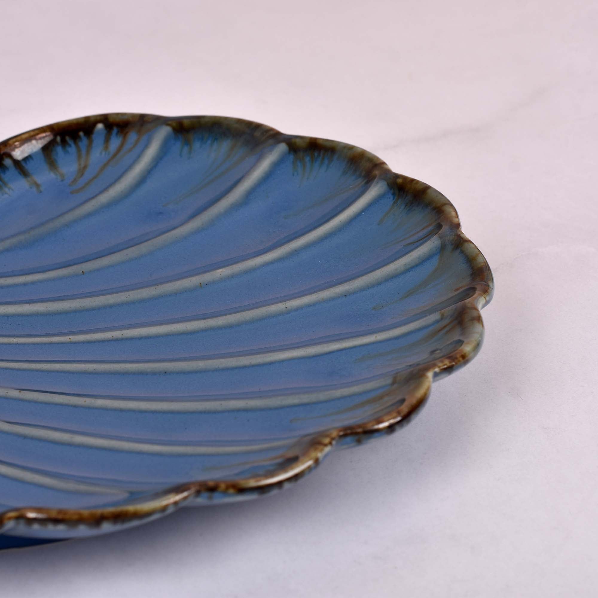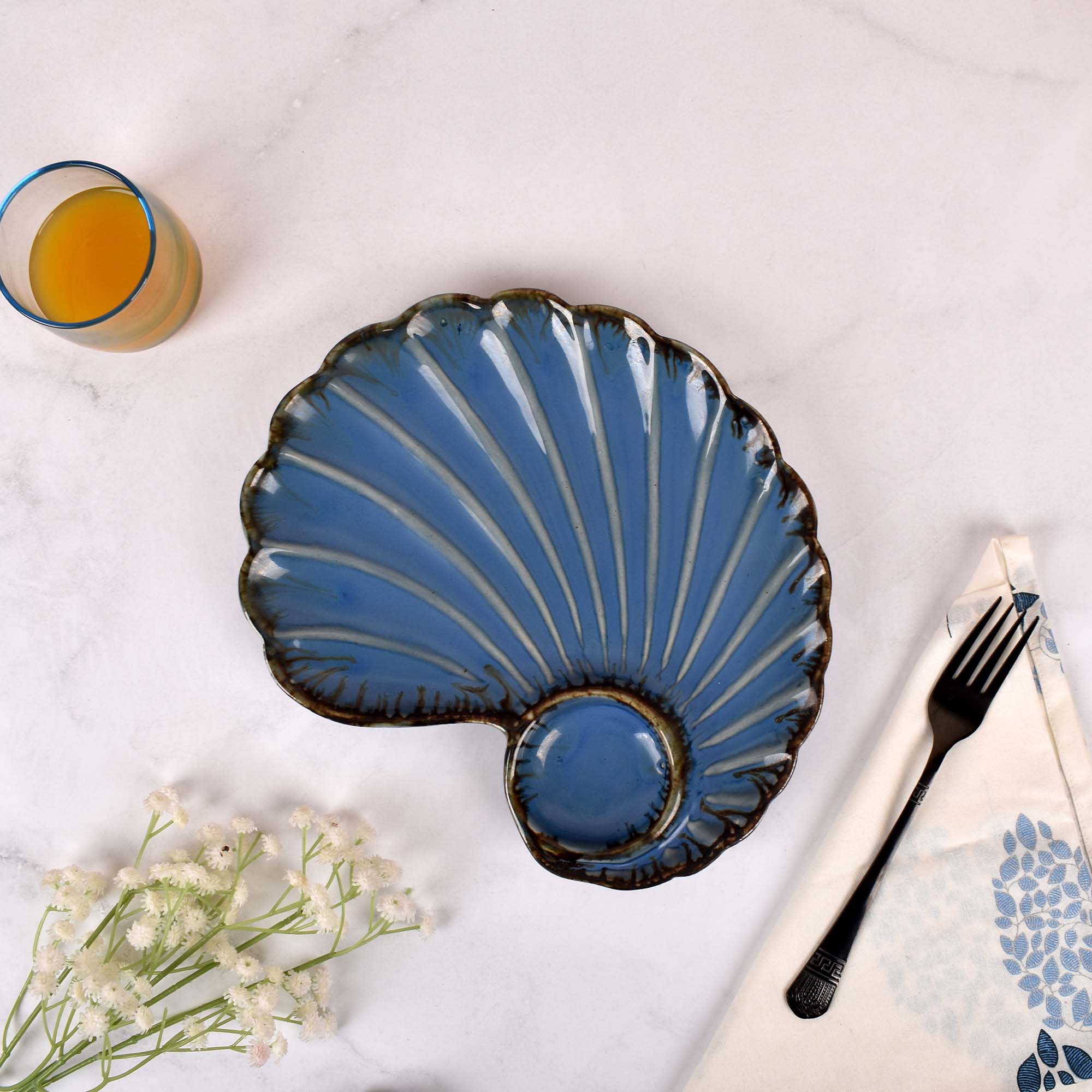 COD availablePresent your staters on something that is just as special as the moment itself. This precisely handcrafted Blue Shell Serving Platter features a deep blue glaze with bronze-brown edges that create depth in every curvature. The result? A colour palette that feels both class and rich, perfect for modern spaces that are earthy but not quite rustic. Not only does its flowing leaf-like form add charm to the dining set, but it also offers the perfect amount of space to serve dry snacks, mithai, cookies, or fruit. This platter is going to make your bites worthy of styling whether you're hosting guests or indulging in quiet nights.