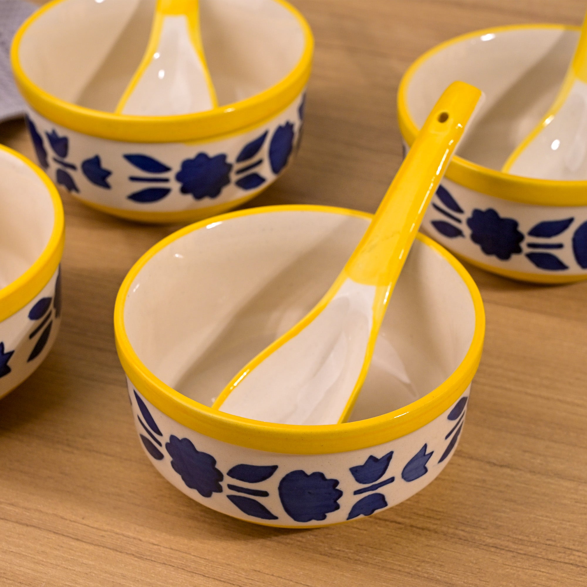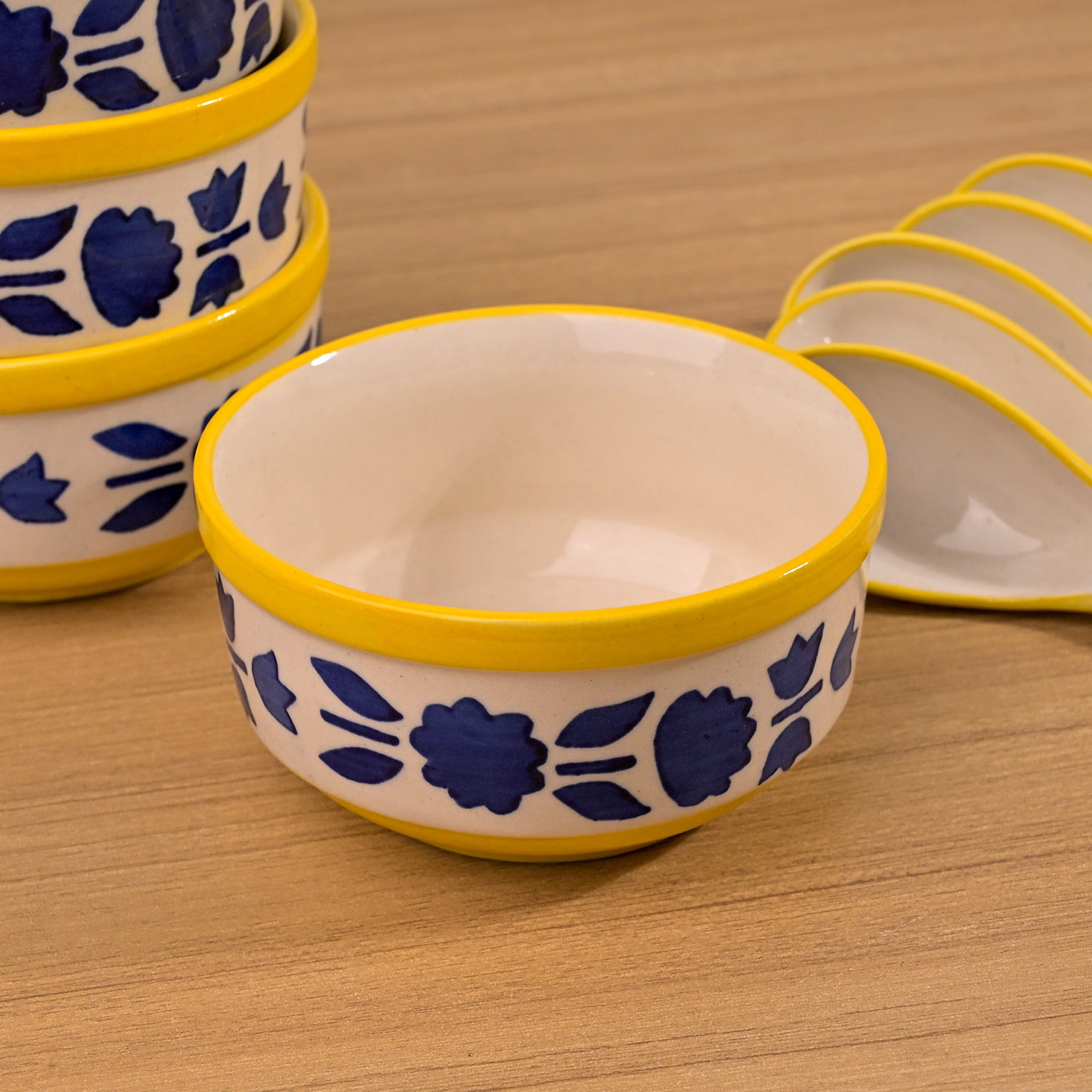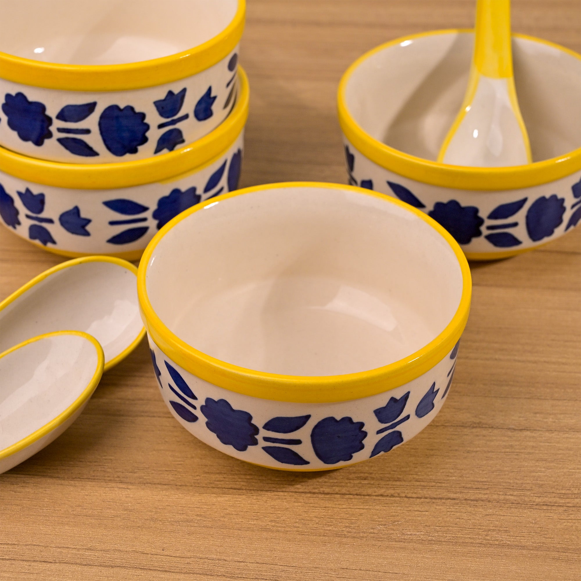 COD availableBring some sunshine to the table with this Blue Soup Bowl with Spoon. With a warm yellow rim and a dark indigo flower pattern, these beautifully designed bowls are made to uplift your table and your mood in no time. Each bowl is made from quality porcelain and includes a matching spoon- making it perfect for soup, snacks, chutneys, or even your morning cereal. The traditional block print brings a touch of Jaipur's heritage charm into your everyday life. From entertaining guests to making everyday me-time feel special, this will be the serving set you use and enjoy for years to come.