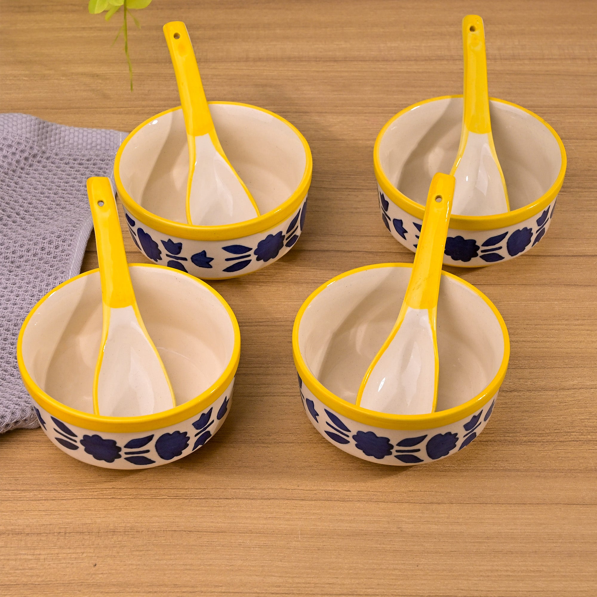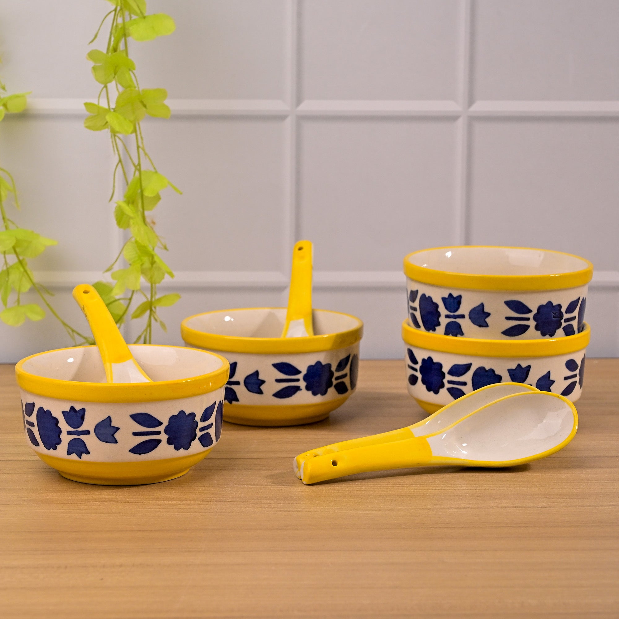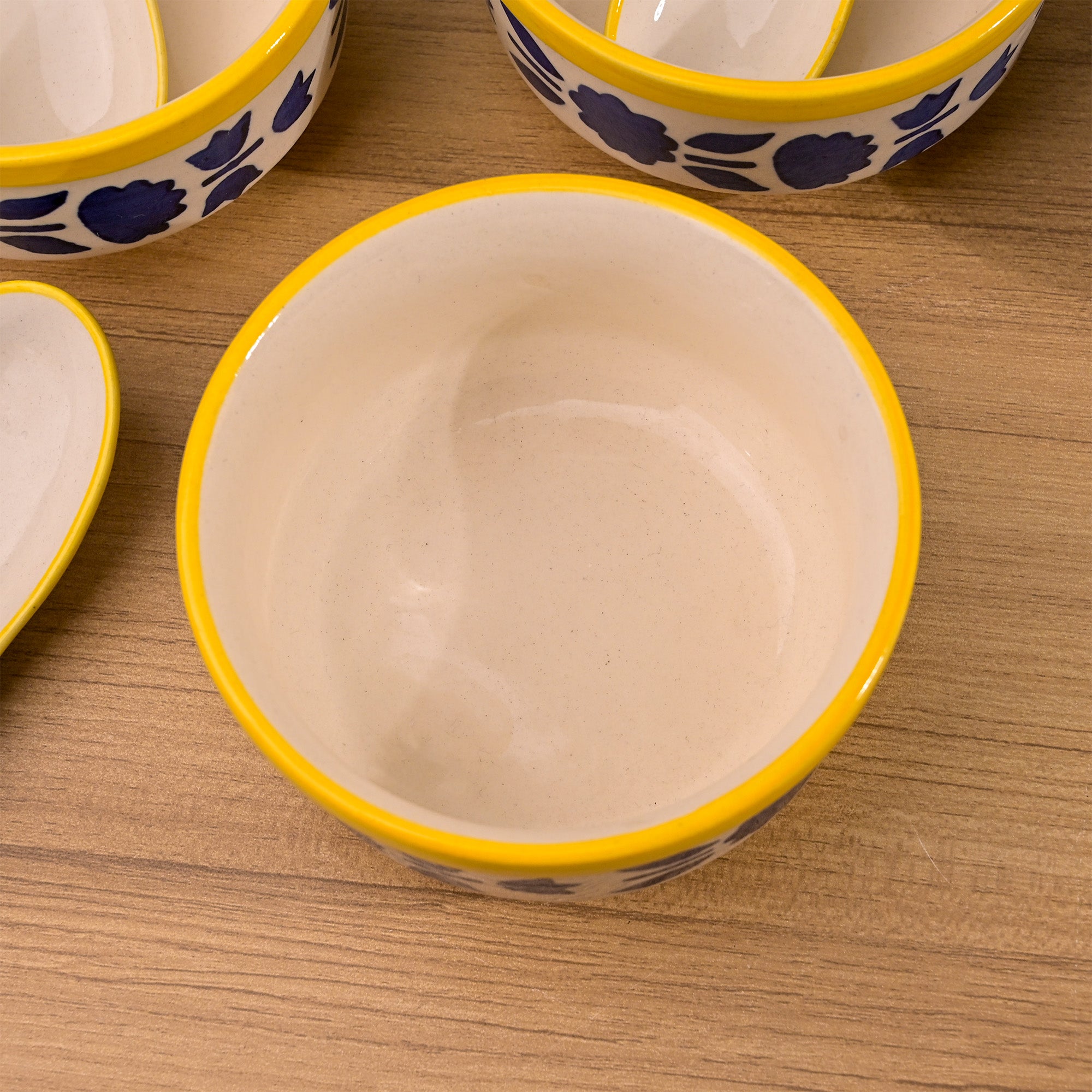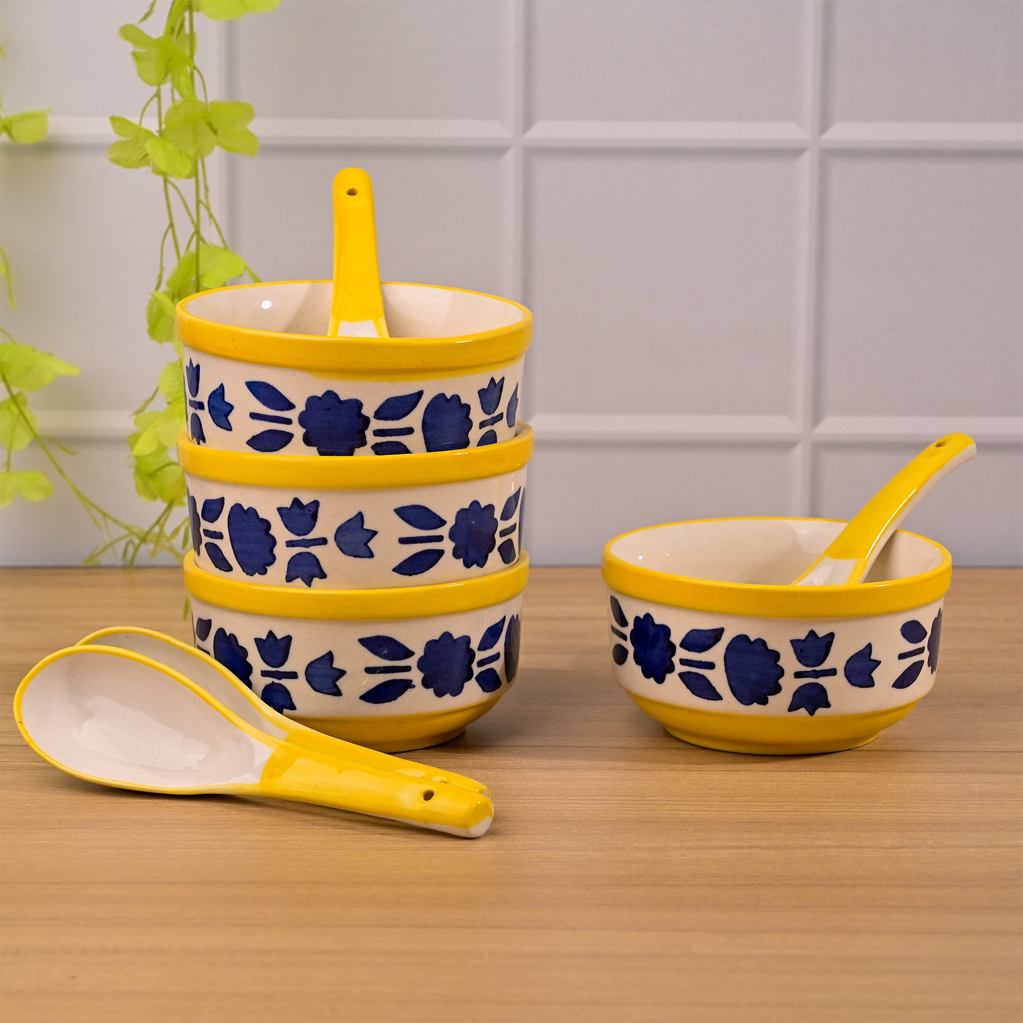 COD availableBring some sunshine to the table with this Blue Soup Bowl with Spoon. With a warm yellow rim and a dark indigo flower pattern, these beautifully designed bowls are made to uplift your table and your mood in no time. Each bowl is made from quality porcelain and includes a matching spoon- making it perfect for soup, snacks, chutneys, or even your morning cereal. The traditional block print brings a touch of Jaipur's heritage charm into your everyday life. From entertaining guests to making everyday me-time feel special, this will be the serving set you use and enjoy for years to come.
