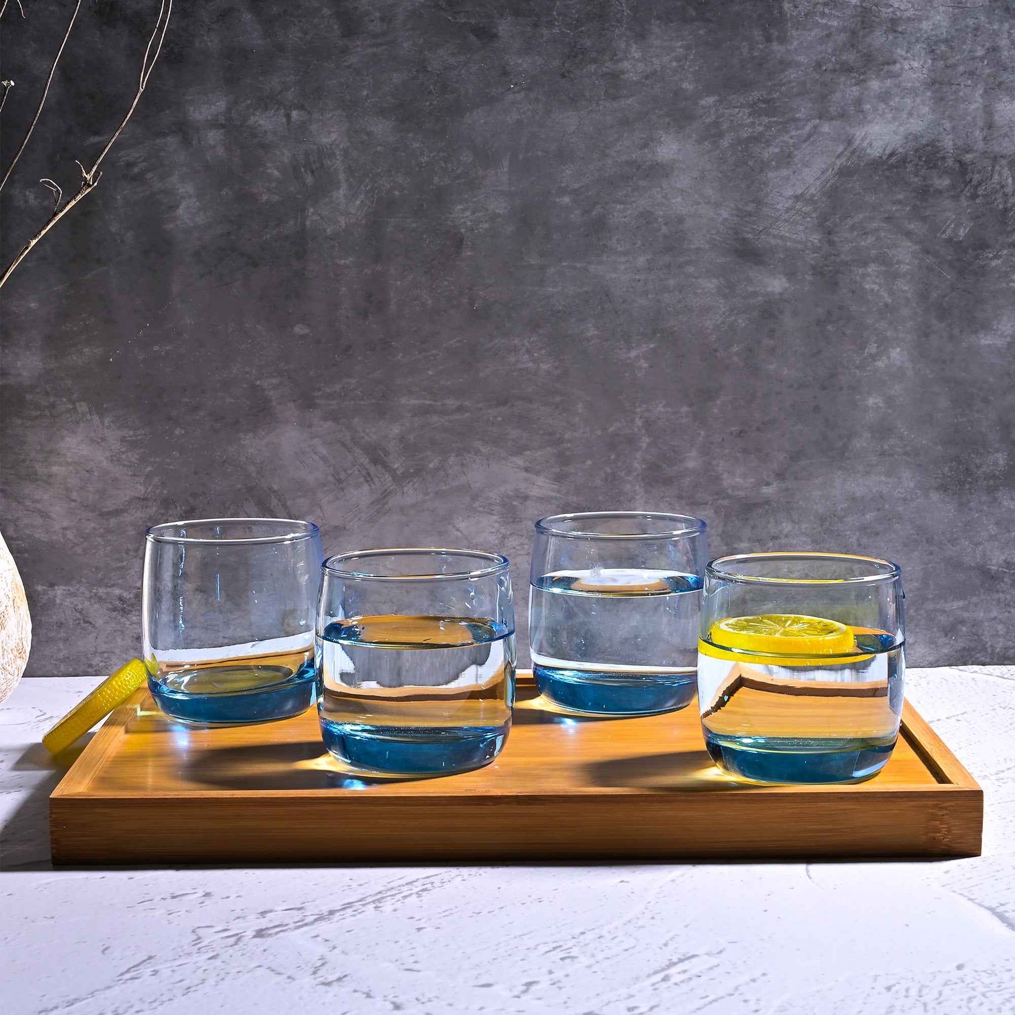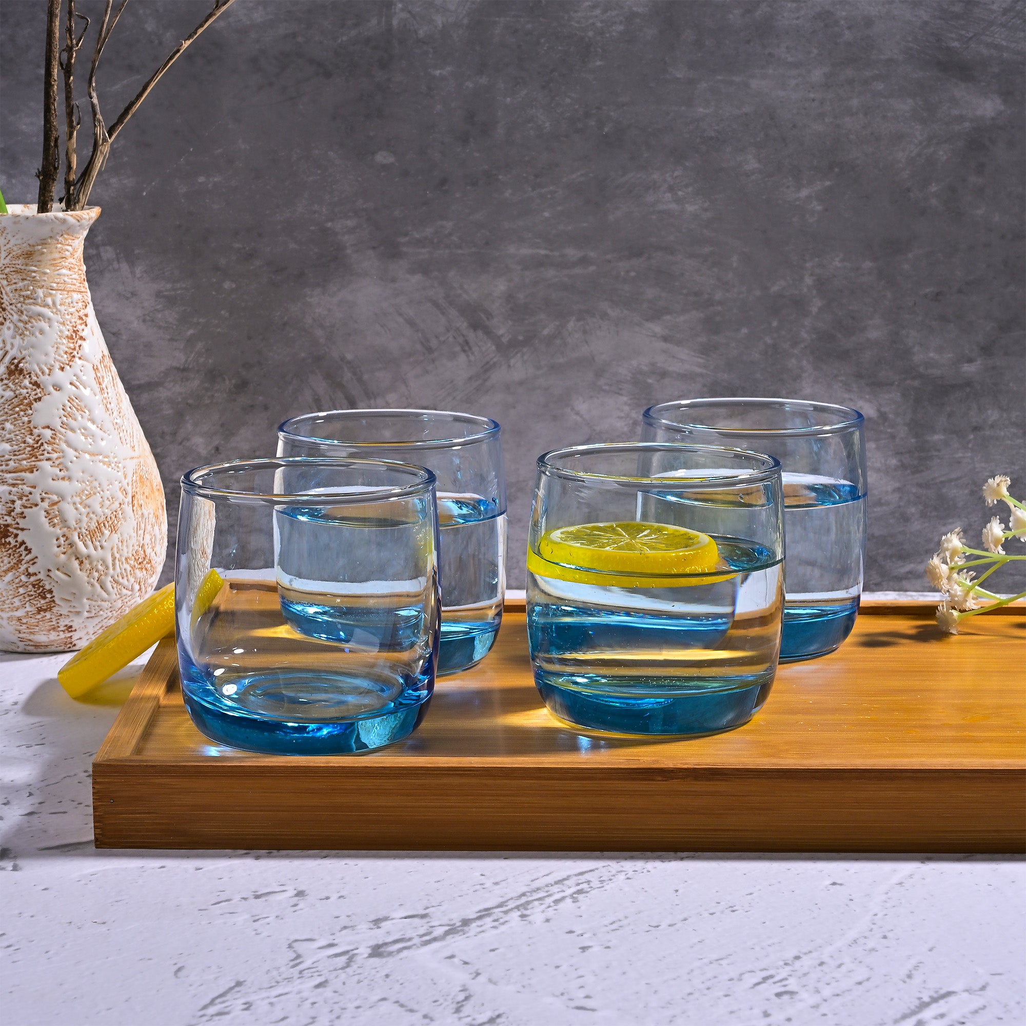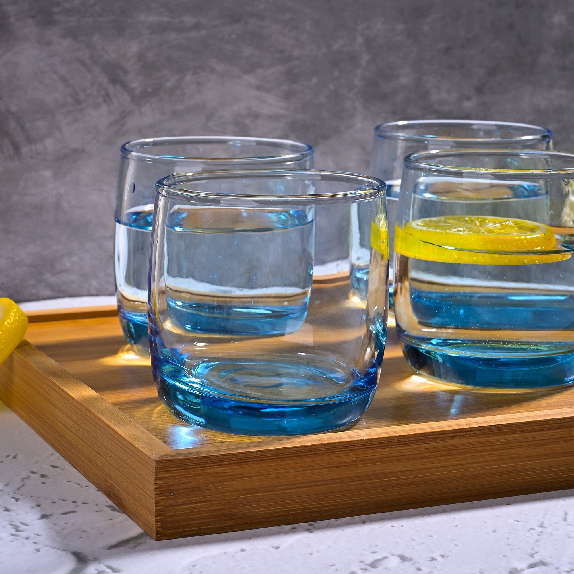 COD availableAdd a splash of fun to your dining experience with this 'Blue Tinted Glass Set of 4.' Each glass features a sturdy, clear bowl with a base tinted in Ocean blue so that every sip feels like a beach celebration. These glasses are perfect for serving juices, mocktails, or refreshing beverages. Their simple, colourful design will add a playful touch to your table.