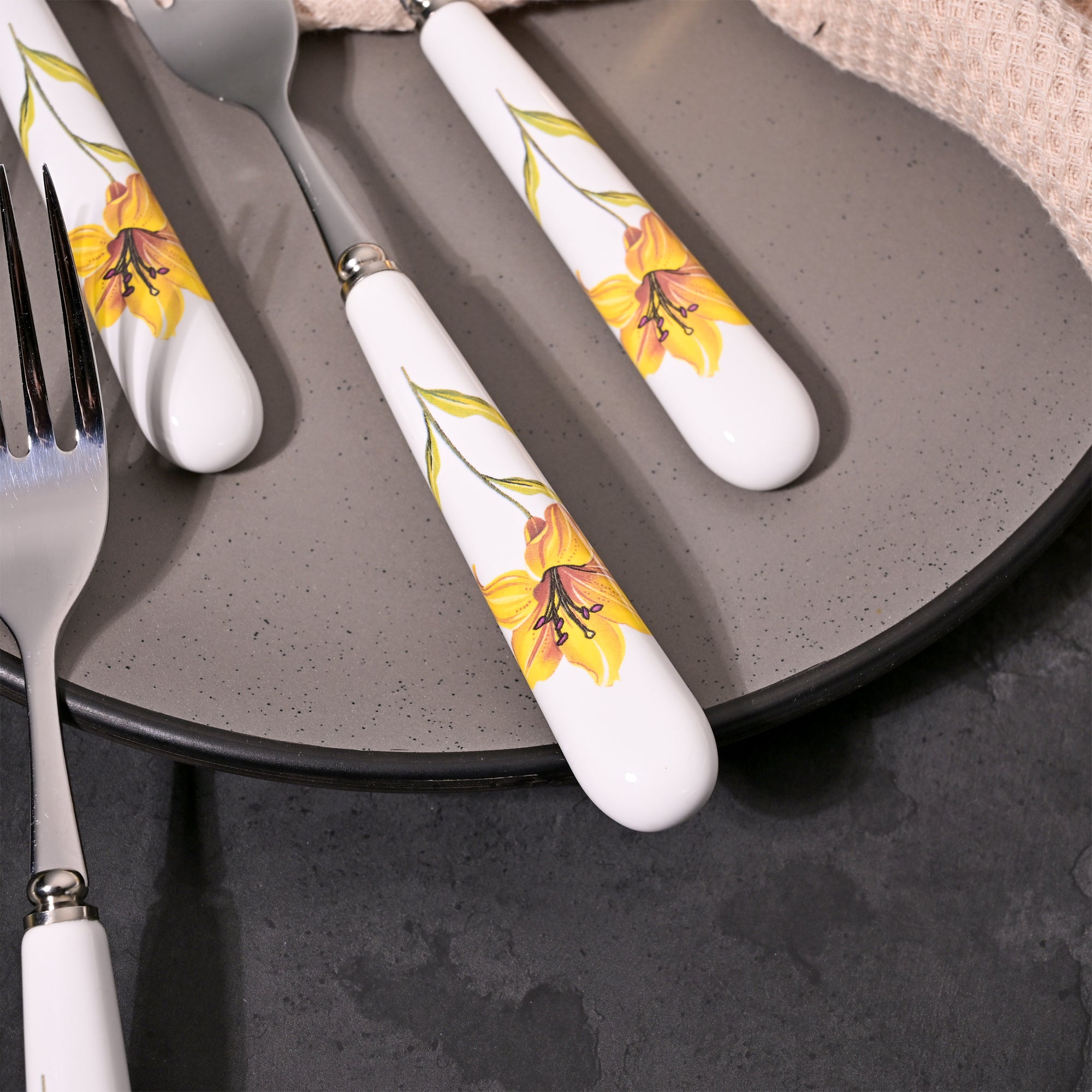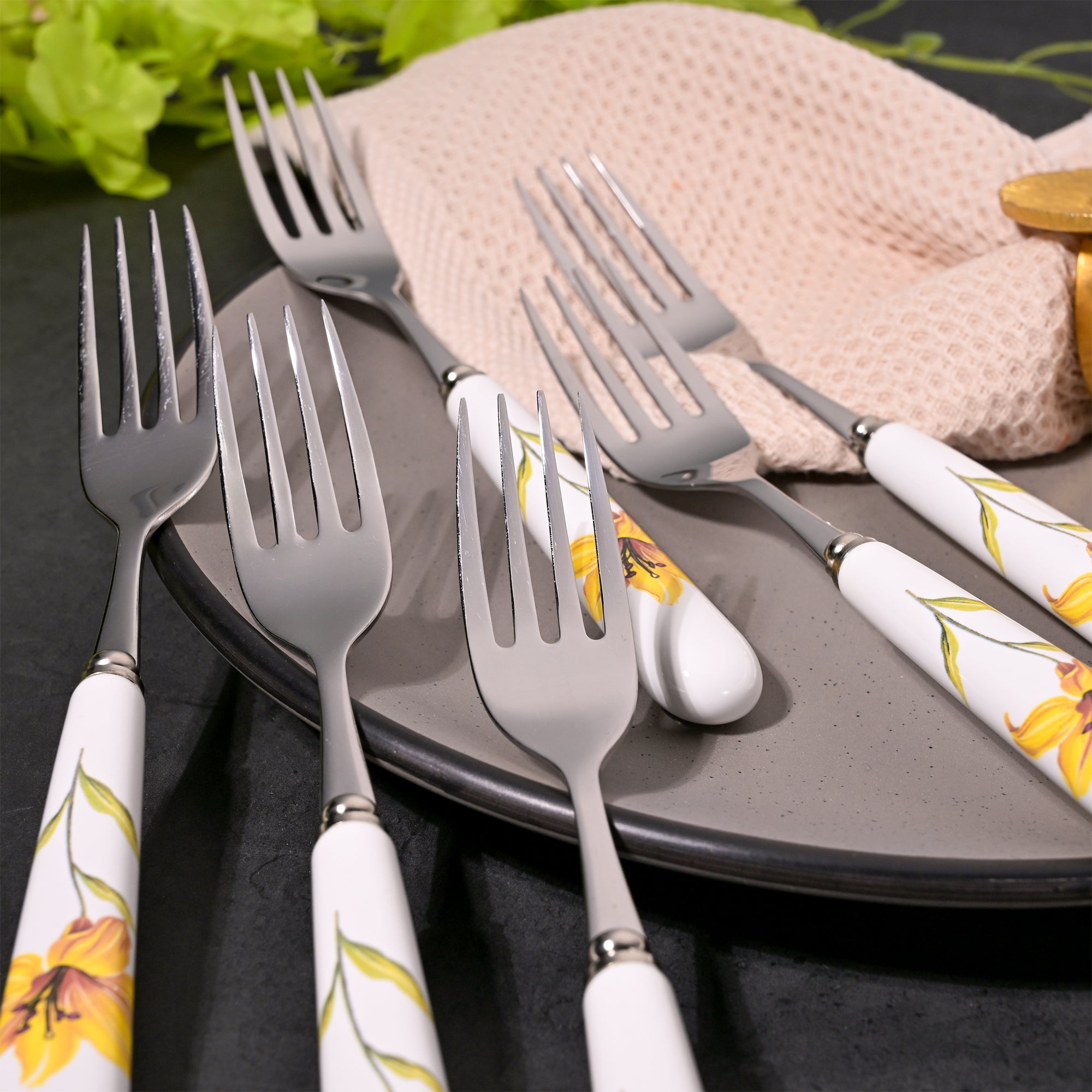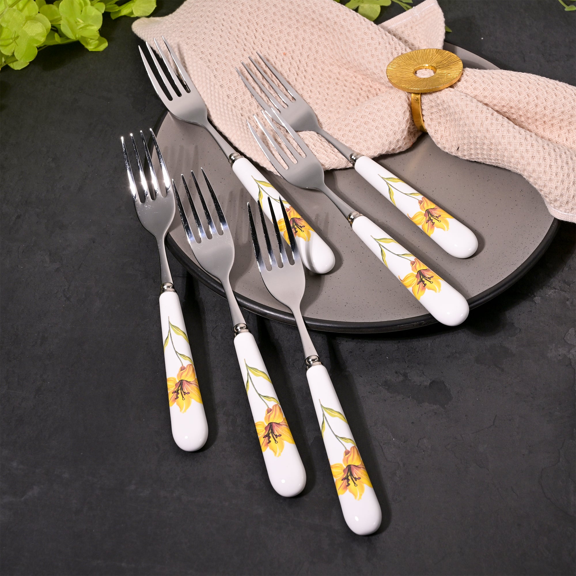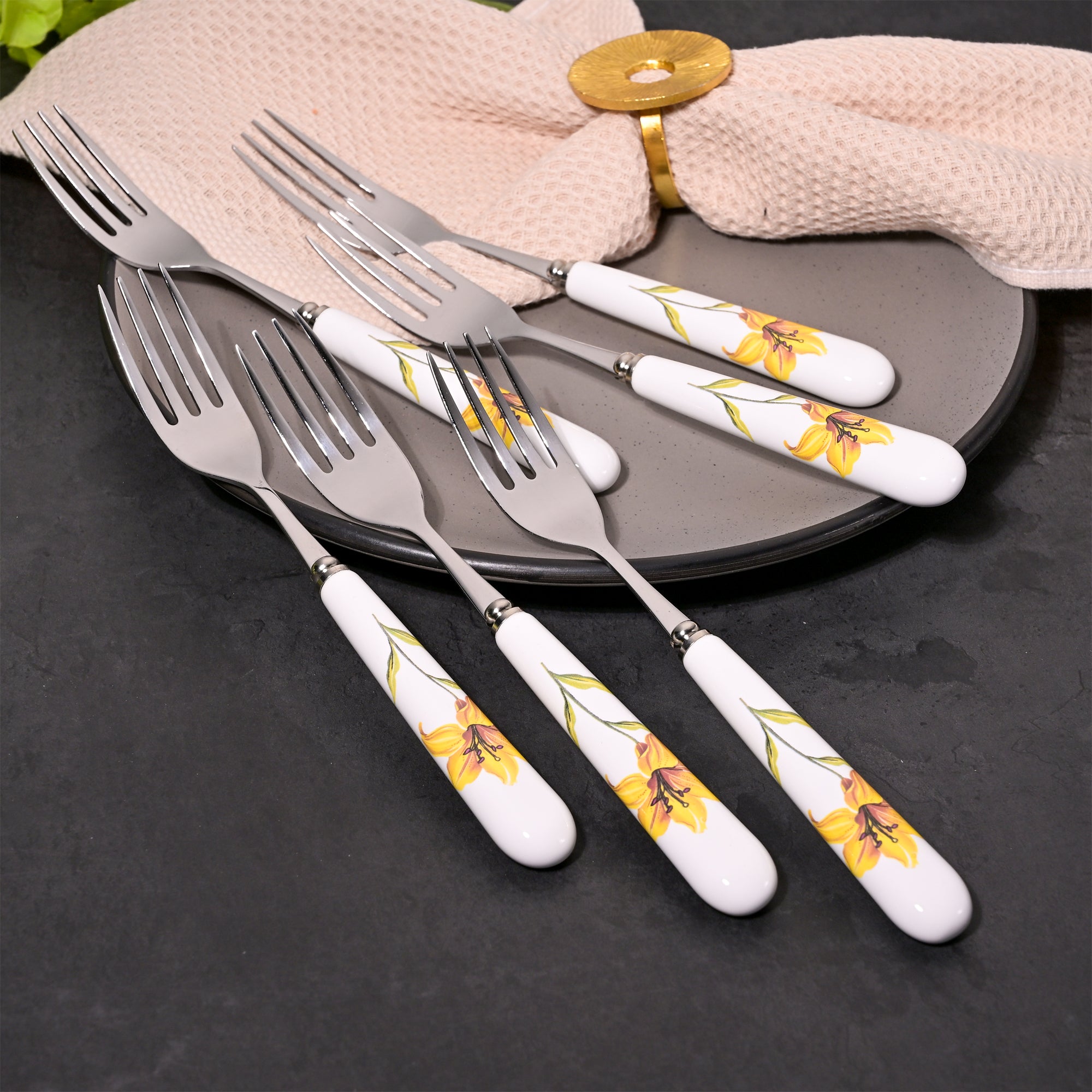 COD availableThis floral fork set brings a soft, refreshing charm to your table and feels new every time you use it. The delicate yellow design adds a gentle pop of color, making everyday dining feel a little more special. This special sunray ceramic & steel Fork Set features beautifully crafted pieces with hand-painted blooms on smooth white ceramic handles.
