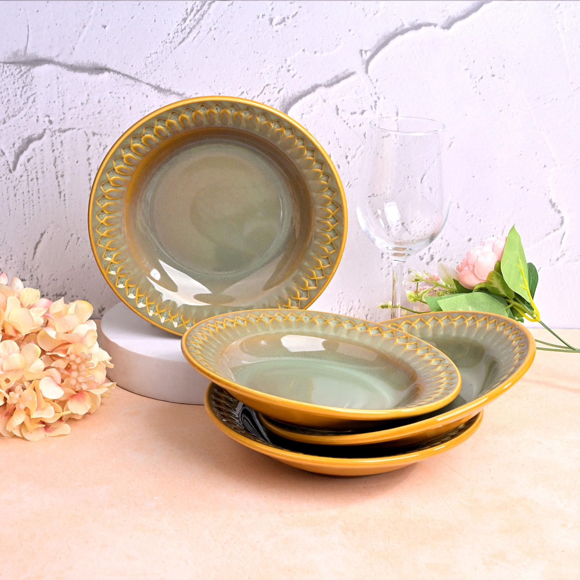 COD availableTransform your simple dining setup to be more presentable and welcoming with one of these Chic Embossed Ceramic Pasta Plates. Their earthy grey-green centre and beautiful golden borders create a rustic charm that makes every meal feel special. Perfect for serving pasta, noodles, or whatever you love to serve up. Whether it’s a relaxed breakfast or a dinner with friends, these plates fit right in. Made from high-quality ceramic, they’re sturdy enough for everyday use and retain their beauty over time. Bring them home and add a touch of natural elegance to your table.