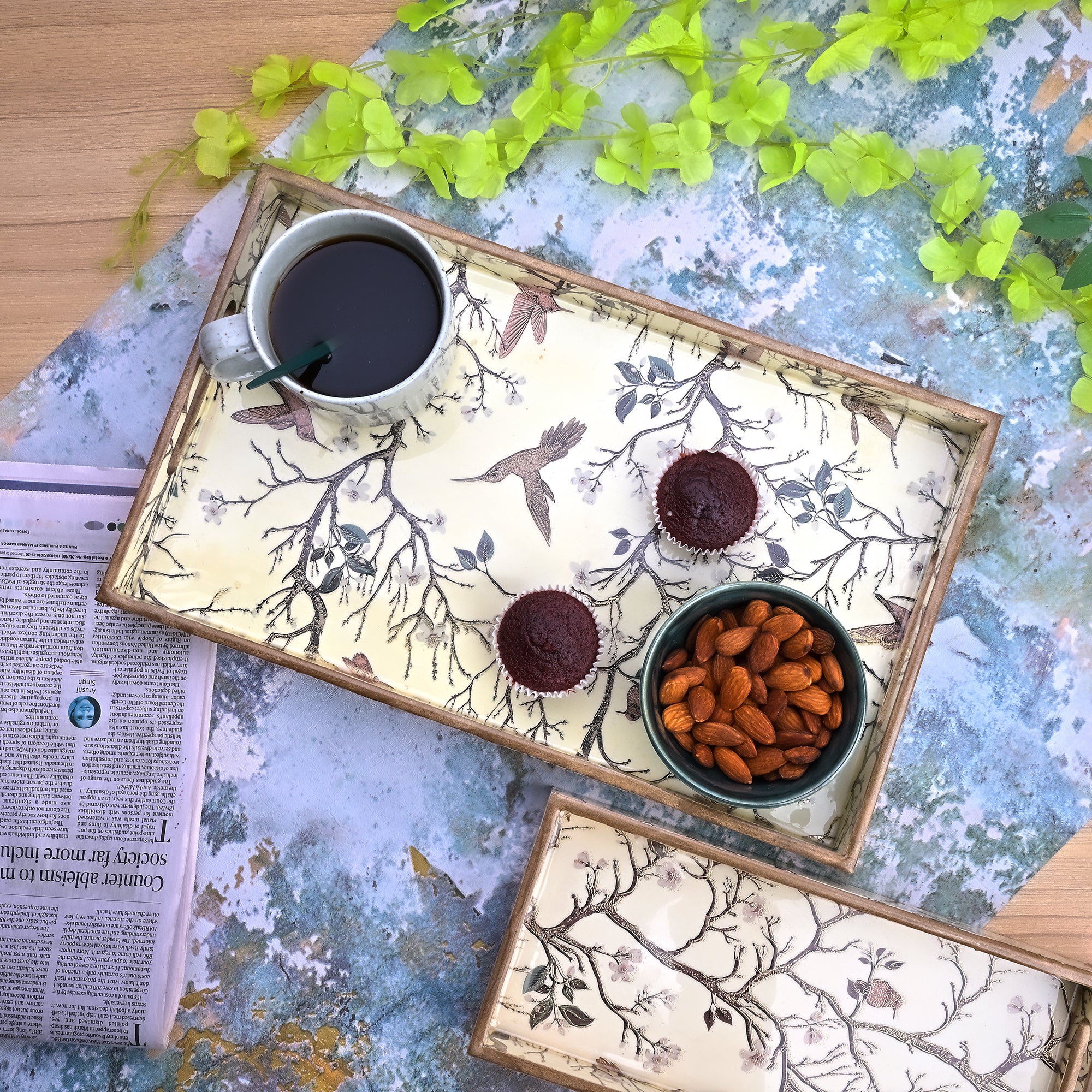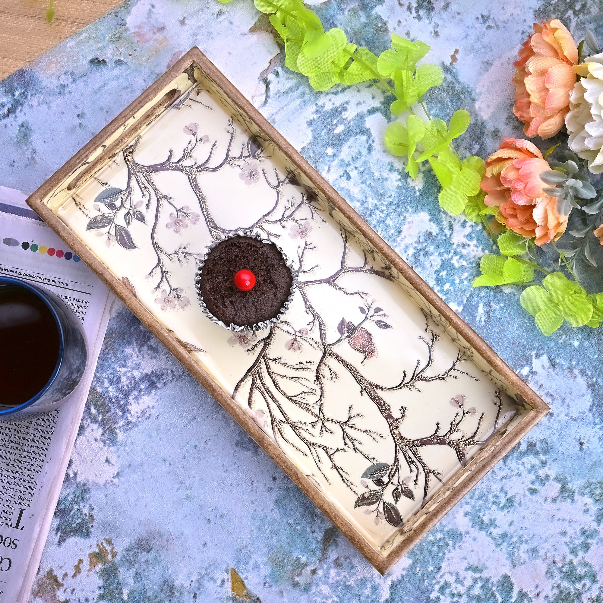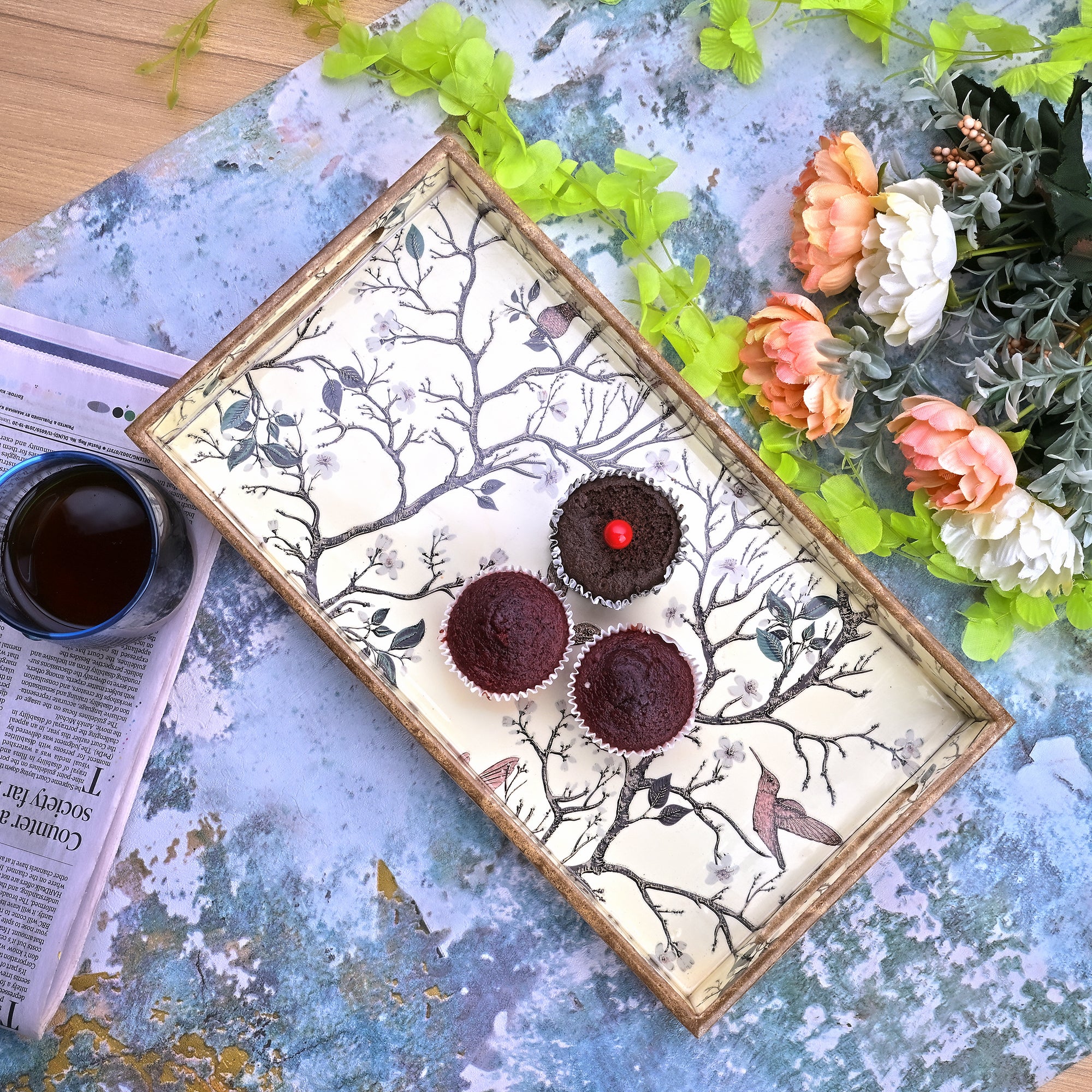 COD availableJust cheer everyone up with this all-over painted wooden tray displaying an elegant scene of blossoming flowers and serene birds. The tray incorporates a mix of brown, grey, pink, and cream colors, subtly adding vibrancy without overwhelming the design. Gold accents sparingly highlight specific elements, adding a touch of elegance and luxury. These wooden trays make a perfect decorative piece for any table setting.