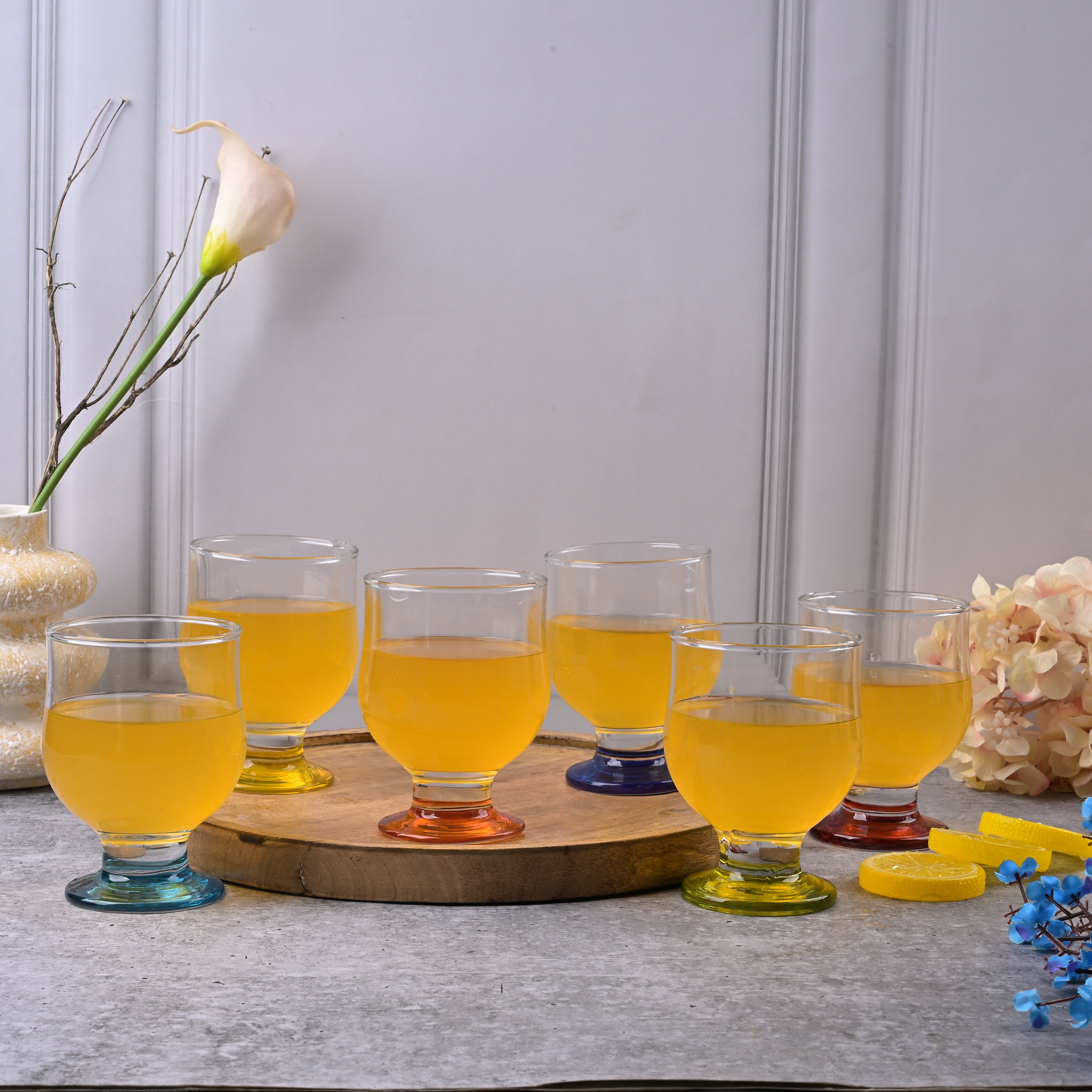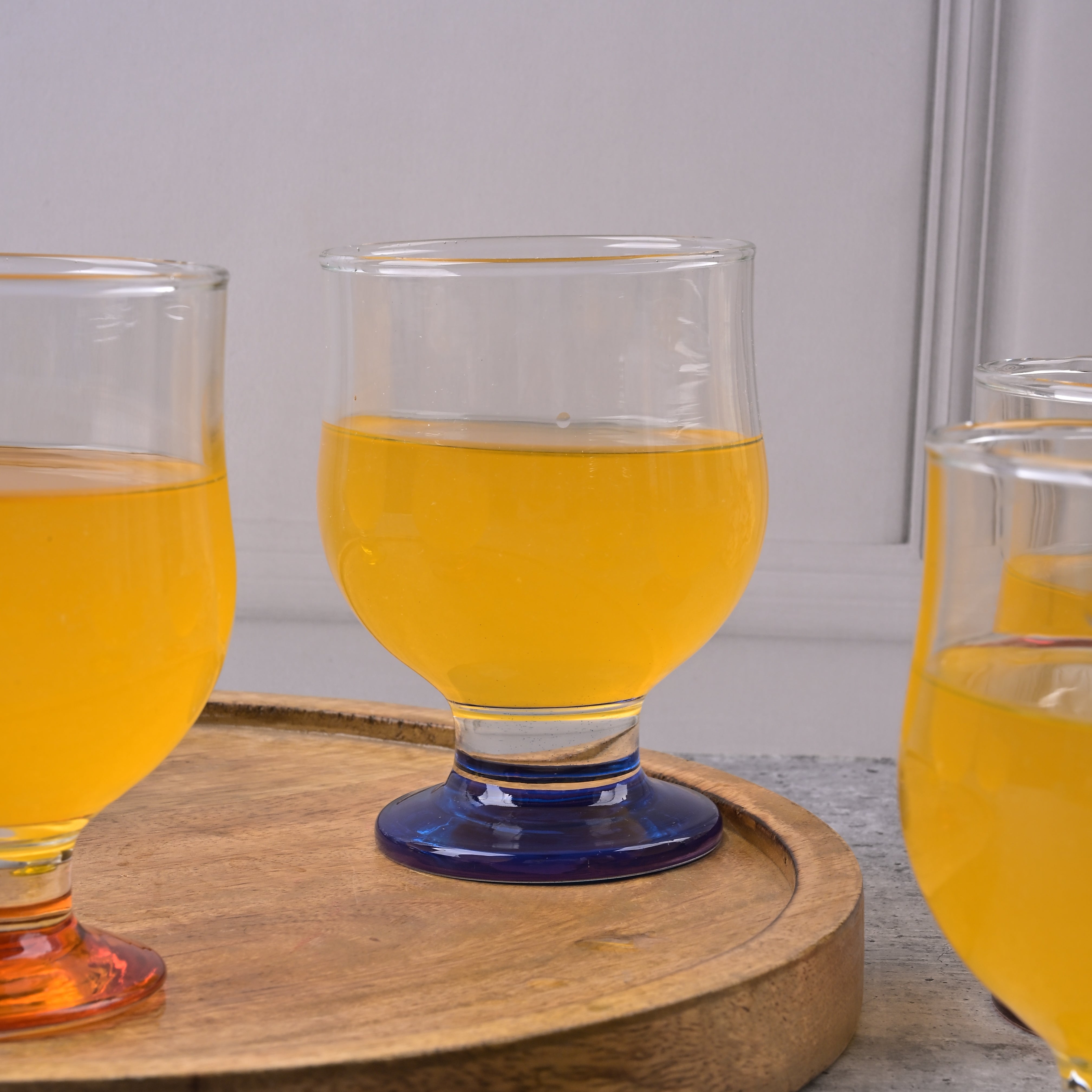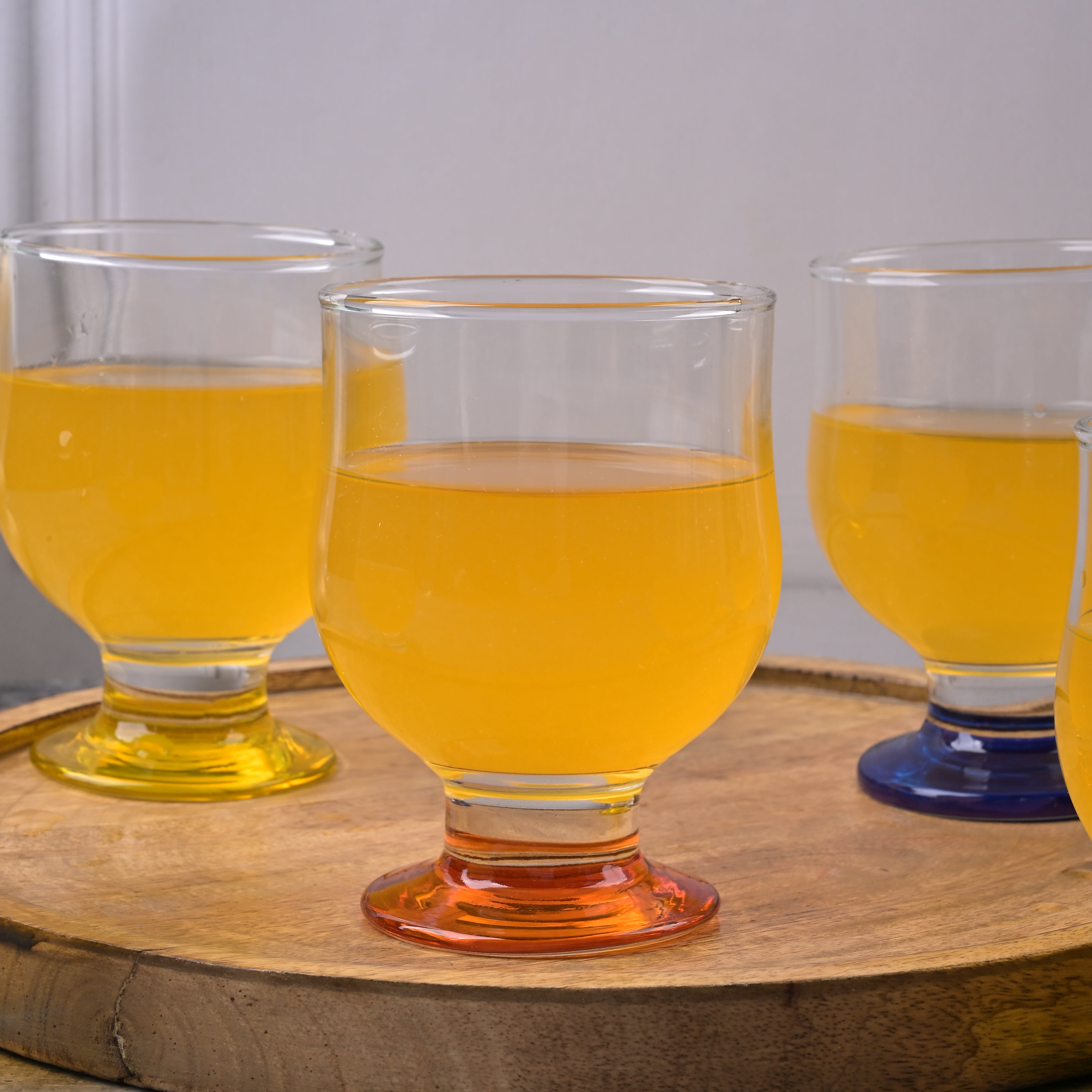 COD availableAdd a splash of fun to your dining experience with this 'Crystal Clear Color Pop Goblet Set of 6'. Each glass features a sturdy, clear bowl with a base tinted in bright blue, orange, green, and more so that every sip feels like a celebration. These goblets are perfect for serving juices, mocktails, or refreshing beverages. Their simple, colourful design will add a playful touch to your table.