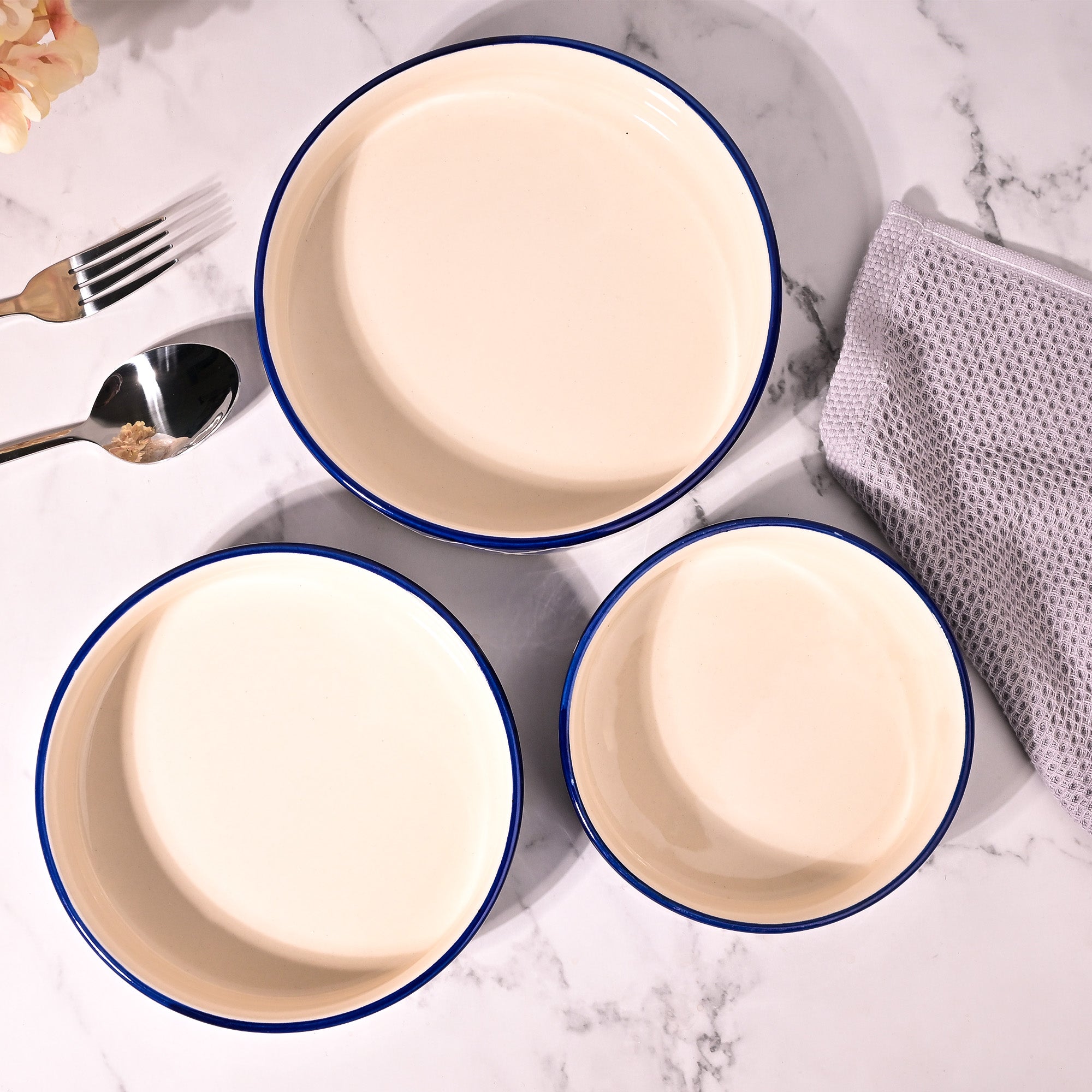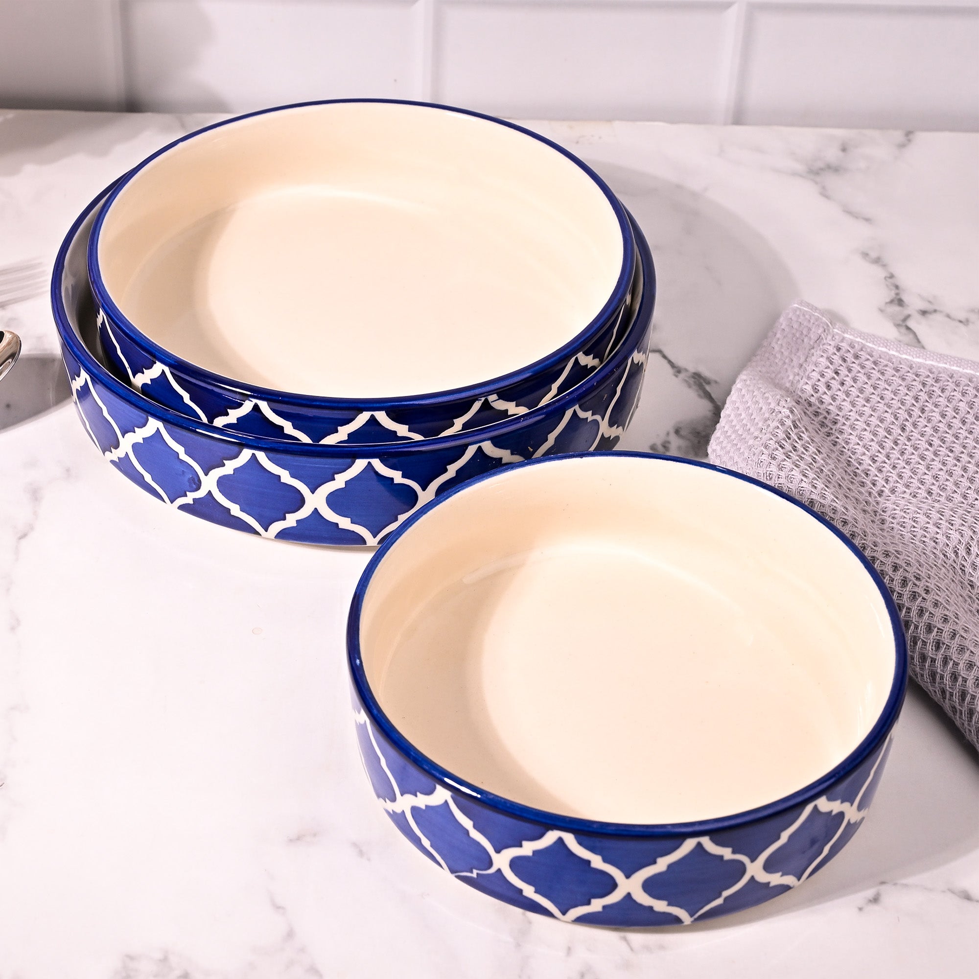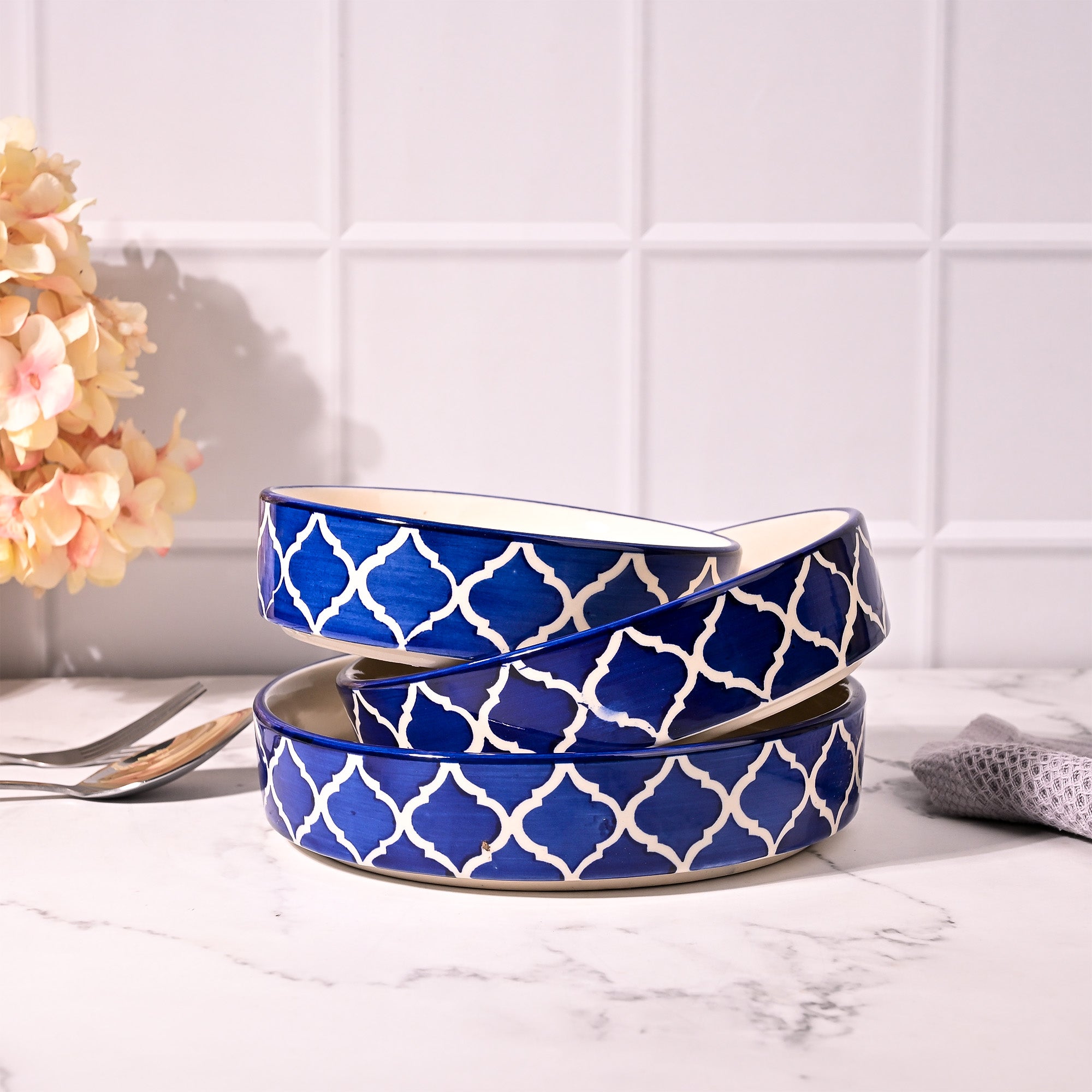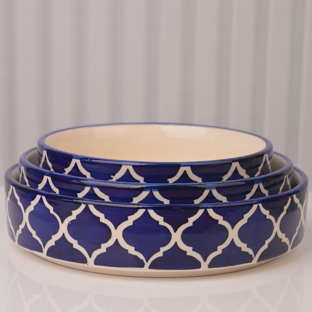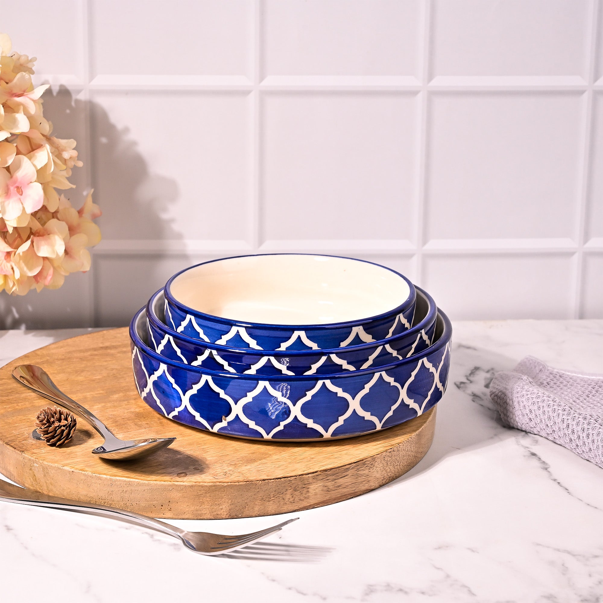 COD availableThis handcrafted Elegant Ceramic Serving Bowl set is all about elegance with tradition. Designed in a beautiful indigo and white colour combination, the classic Jaipur pattern brings out that rich artisanal charm. The geometric detailing gives the bowls a bold, timeless look perfect for those who love a touch of heritage on their table. Whether it’s dal-rice, sabzi, snacks, or desserts, these bowls fit right in. The set comes in three practical sizes (Large, Medium, and Small), so you’re always ready to serve in style.