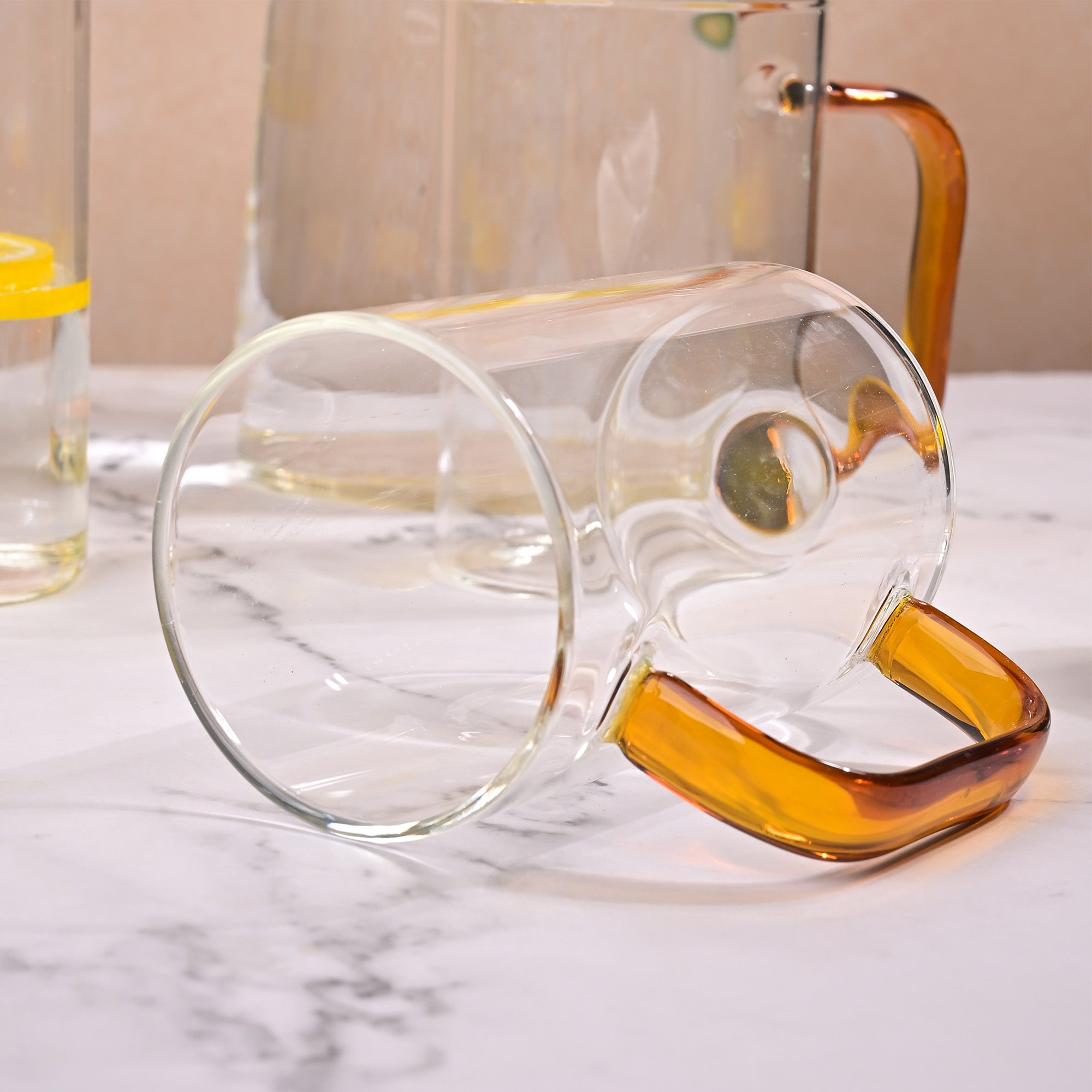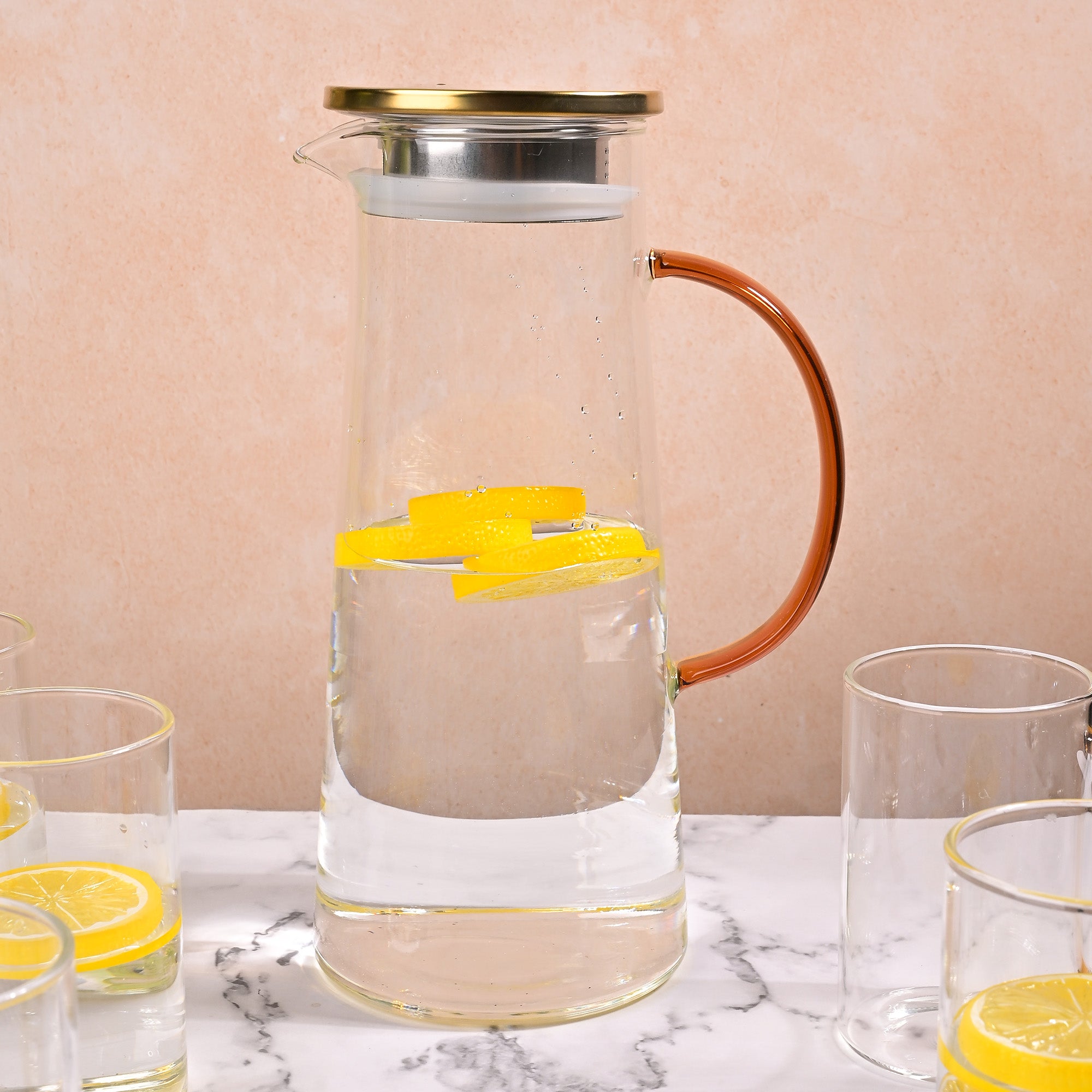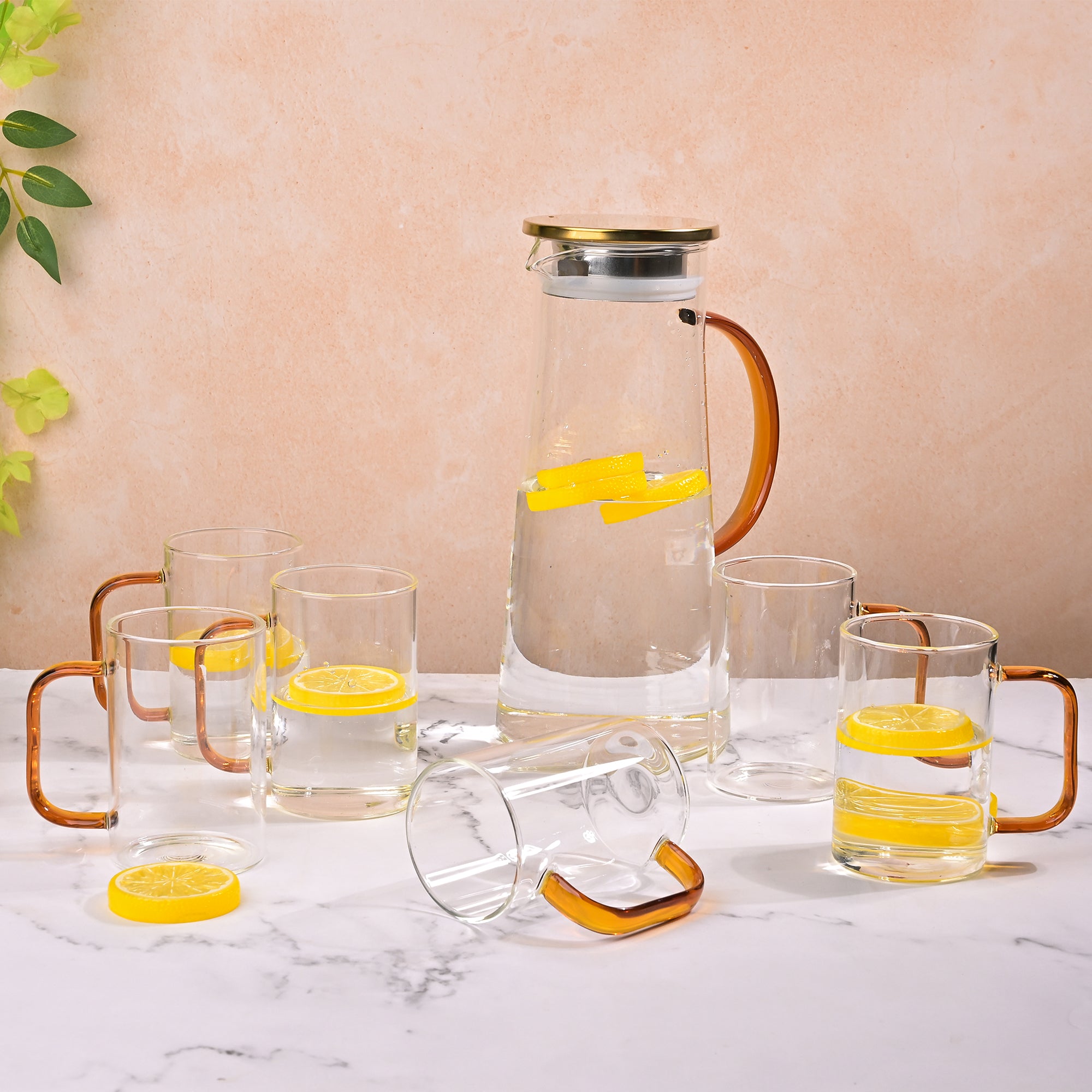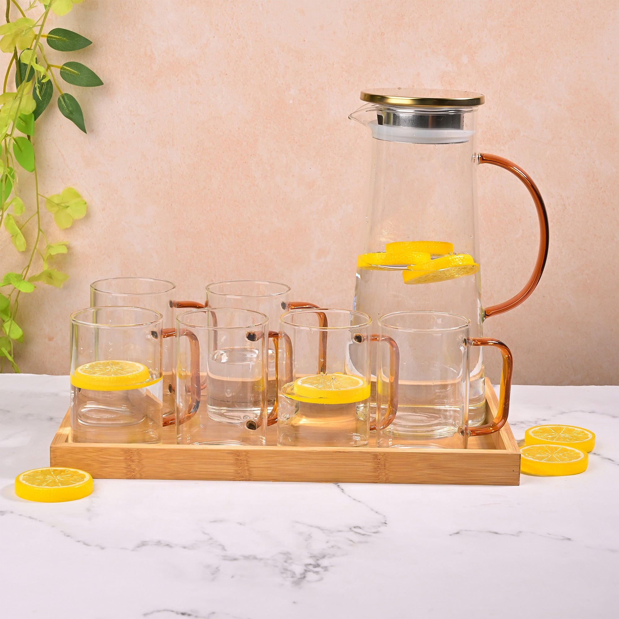 COD availableBrighten up your table with this 'Elegant Glass Pitcher and Mug Set' with tray featuring bold amber handles and a matching lid. Its sleek, cylindrical shape is perfect for serving water, iced tea, or juice, while the clear glass beautifully displays colourful drinks. The amber handles add a splash of colour and ensure a comfortable grip, making this carafe both practical and eye-catching. Perfect for brunches or casual gatherings, it lets you pour with style and makes every drink feel special.