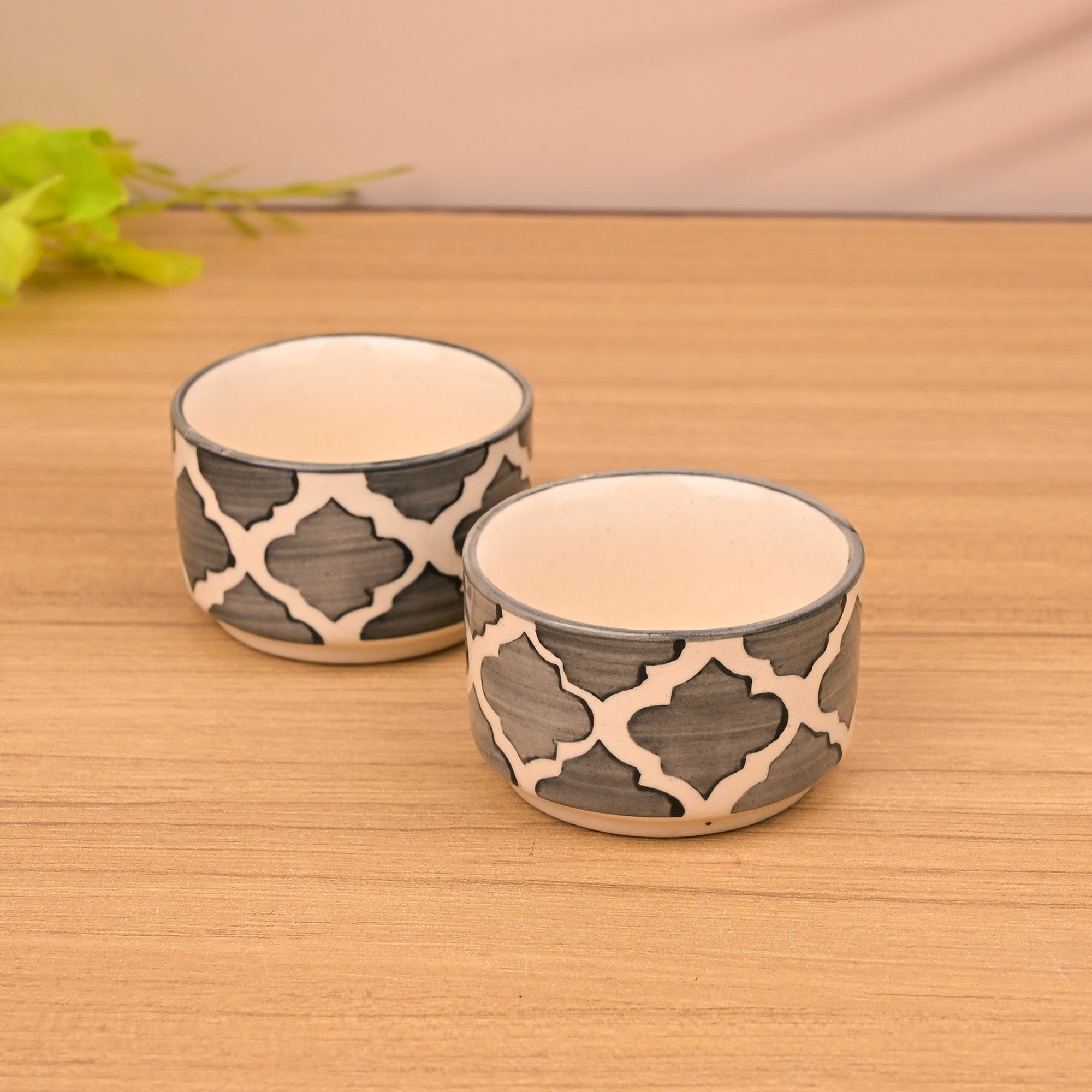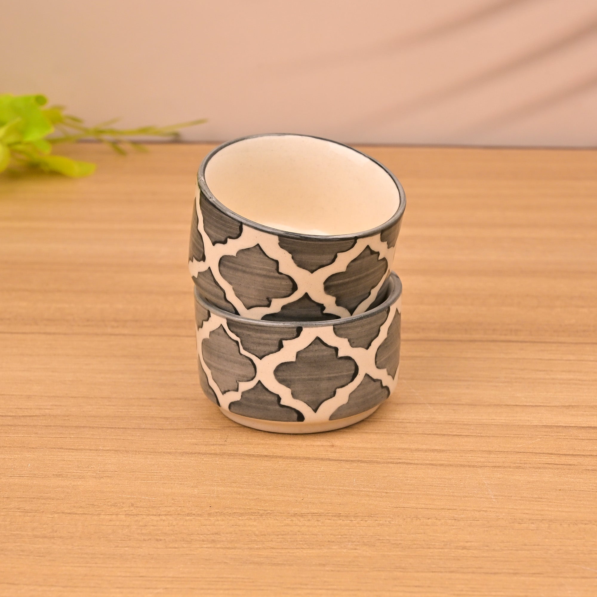 COD availableThese Jaipur-style Elegant Grey Ceramic Mini Dip Bowl Set bring elegance to your dining space. Designed in a classic grey-and-white colour combination. The artful pattern showcases the beauty of block printing-a timeless beauty that never goes out of style! These bowls aren’t just lovely, but they are multi-functional too. You can use them for serving chutneys, sauces, dips, or even a small snack. The bowls are compact in size, easy to hold, and practical to use every day.