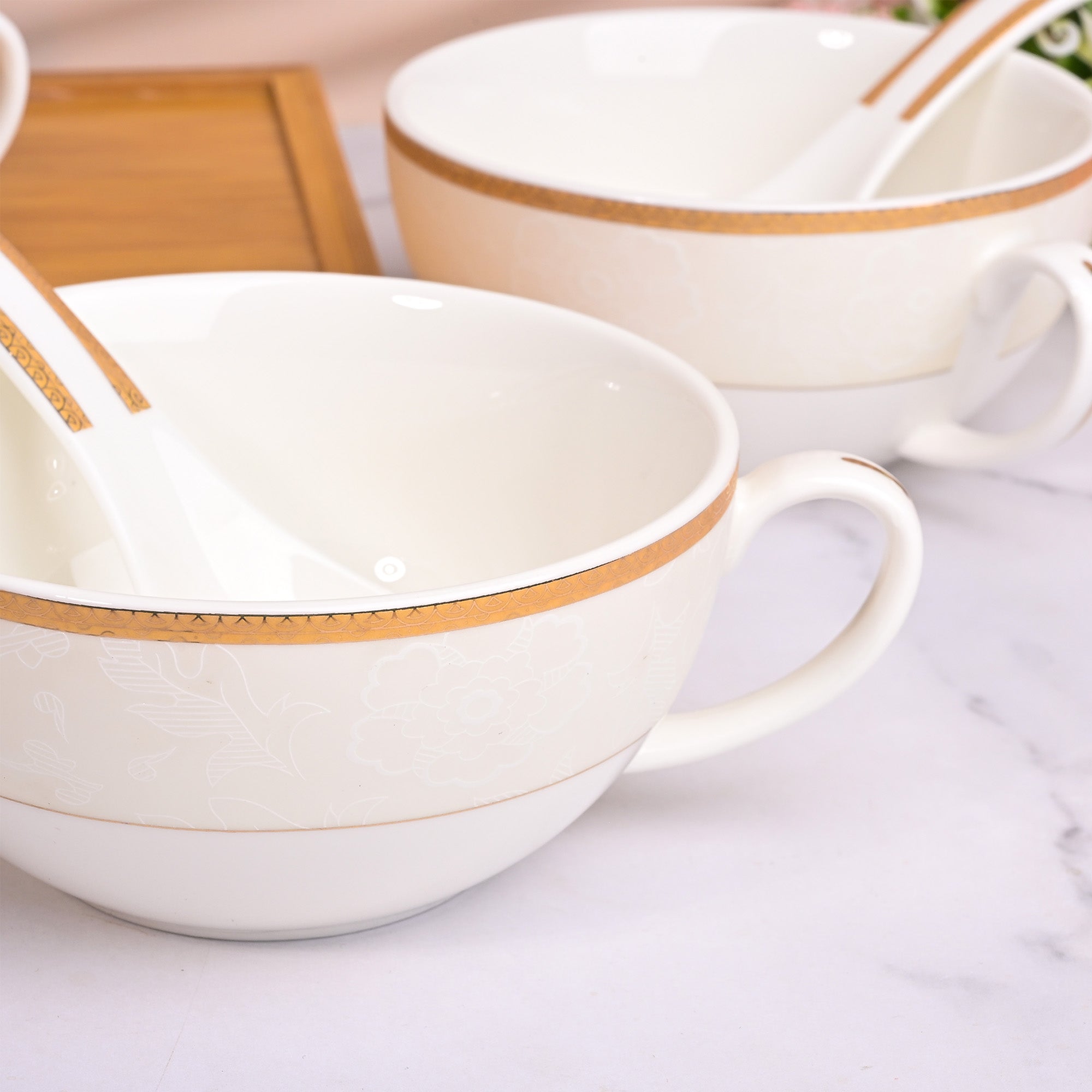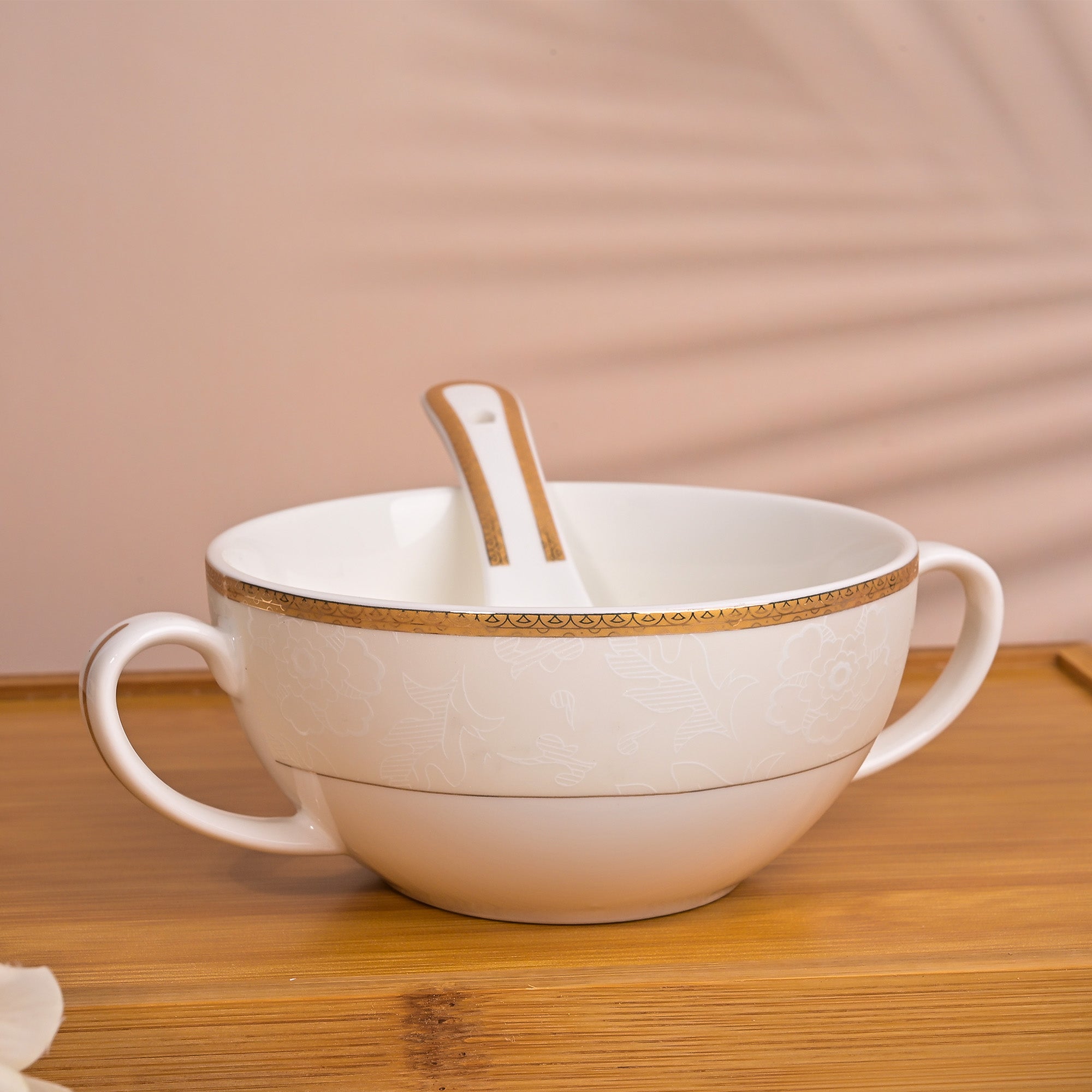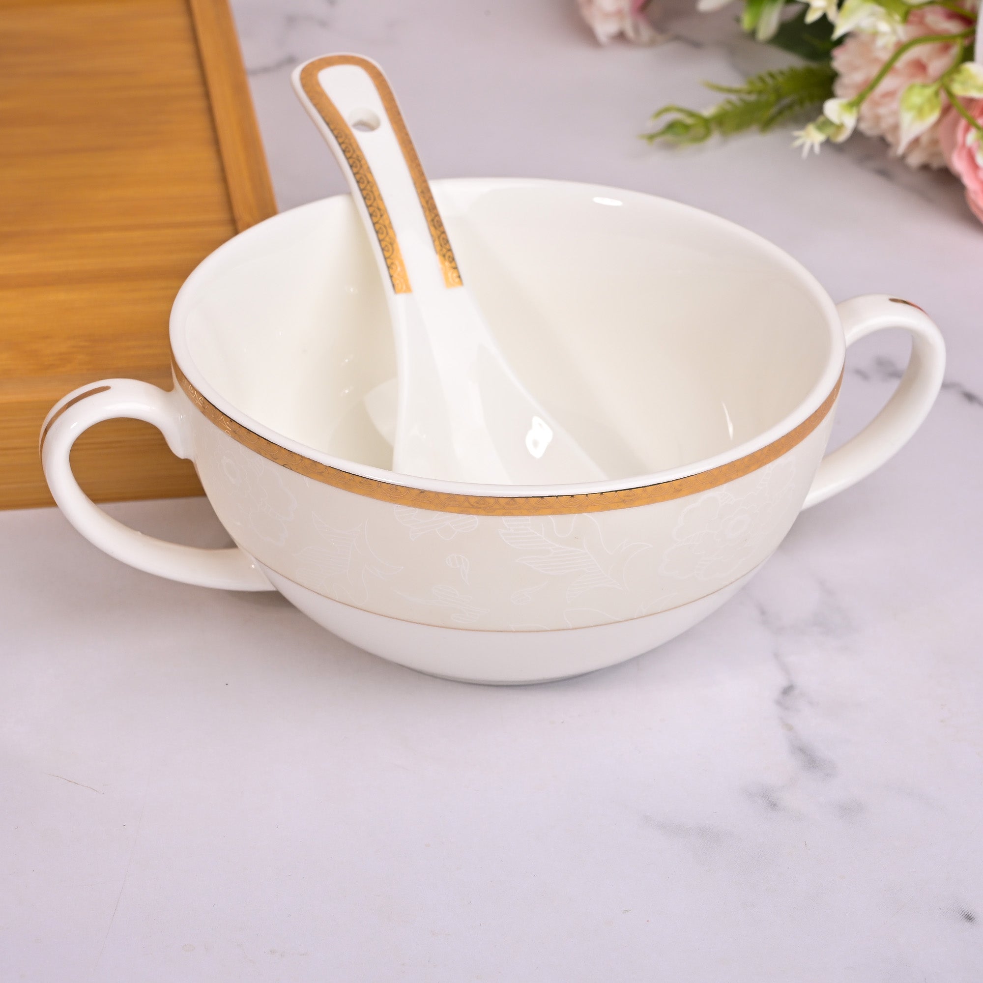 COD availableEnjoying soup is great, but enjoying it in a bowl that feels comfortable to hold? Even better. Meet our Elegant Porcelain White Bowl with Spoon Set thoughtfully designed with an easy-to-hold handle and a charming design. Made from durable porcelain, this set is built to last. The golden detailing on the rim and spoon handle adds a classy touch that instantly elevates your table. Perfect for soup, noodles, or even a quick microwave mug cake, this bowl is truly multi-functional. So go ahead, bring home this practical beauty and make everyday moments feel a little more special.