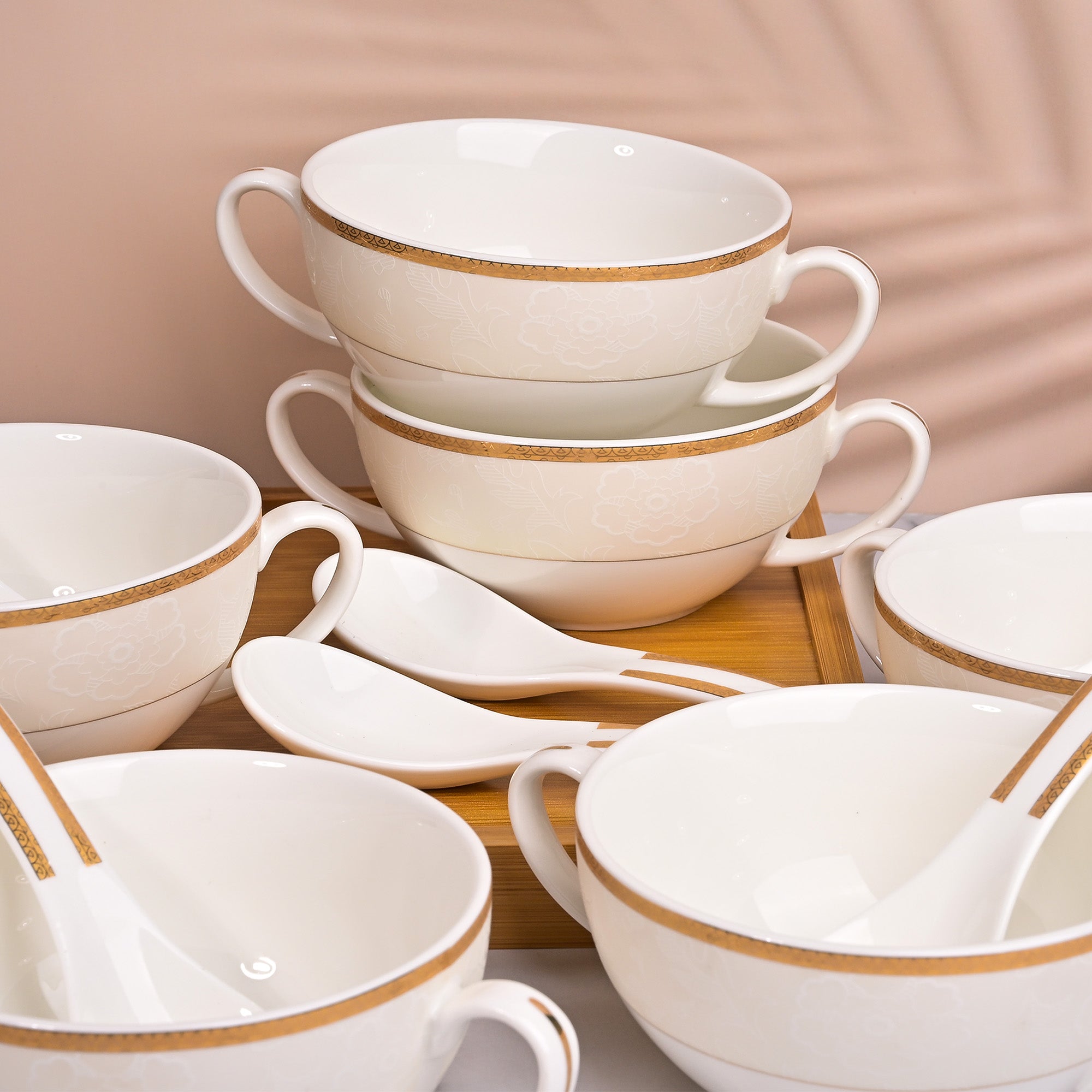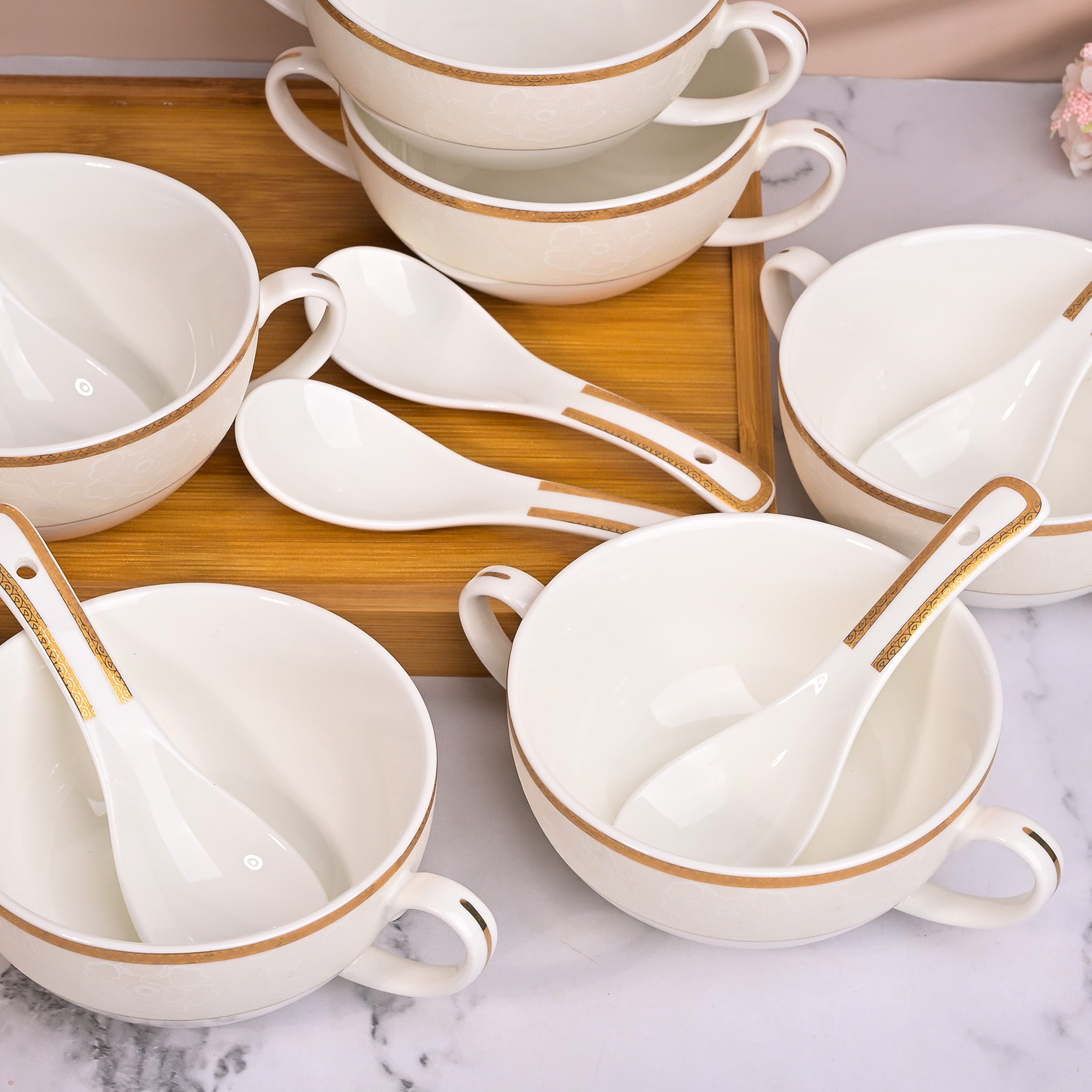 COD availableEnjoying soup is great, but enjoying it in a bowl that feels comfortable to hold? Even better. Meet our Elegant Porcelain White Bowl with Spoon Set thoughtfully designed with an easy-to-hold handle and a charming design. Made from durable porcelain, this set is built to last. The golden detailing on the rim and spoon handle adds a classy touch that instantly elevates your table. Perfect for soup, noodles, or even a quick microwave mug cake, this bowl is truly multi-functional. So go ahead, bring home this practical beauty and make everyday moments feel a little more special.