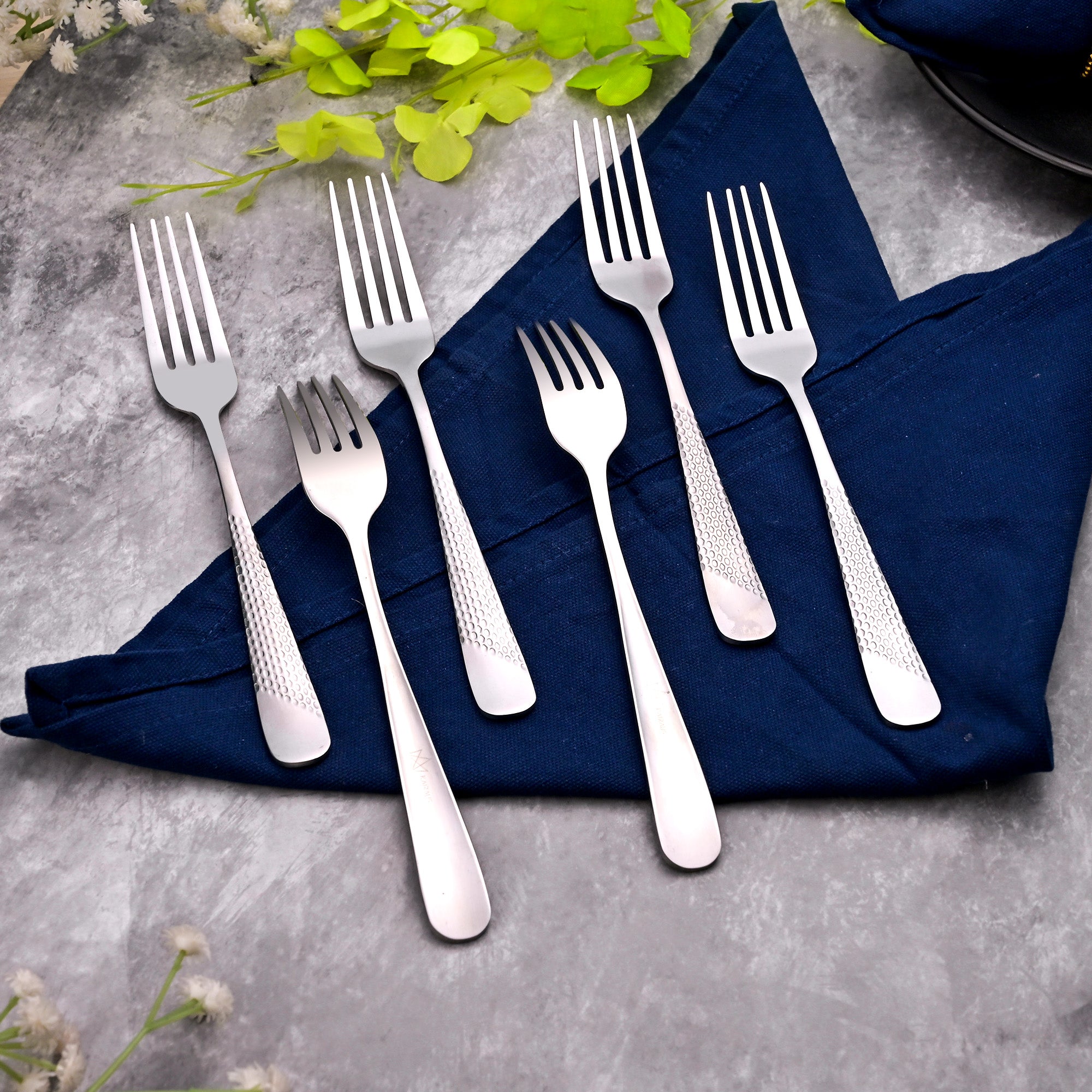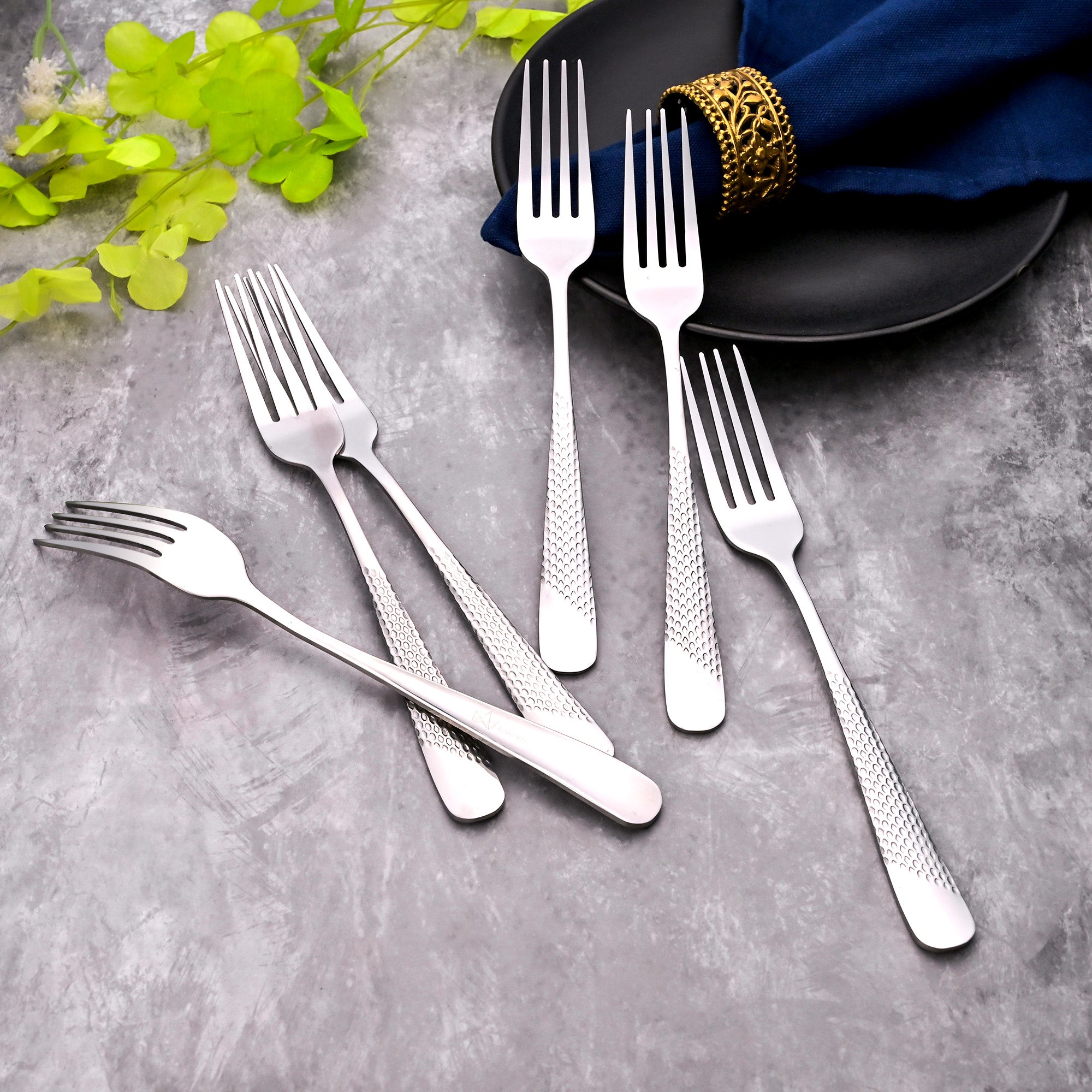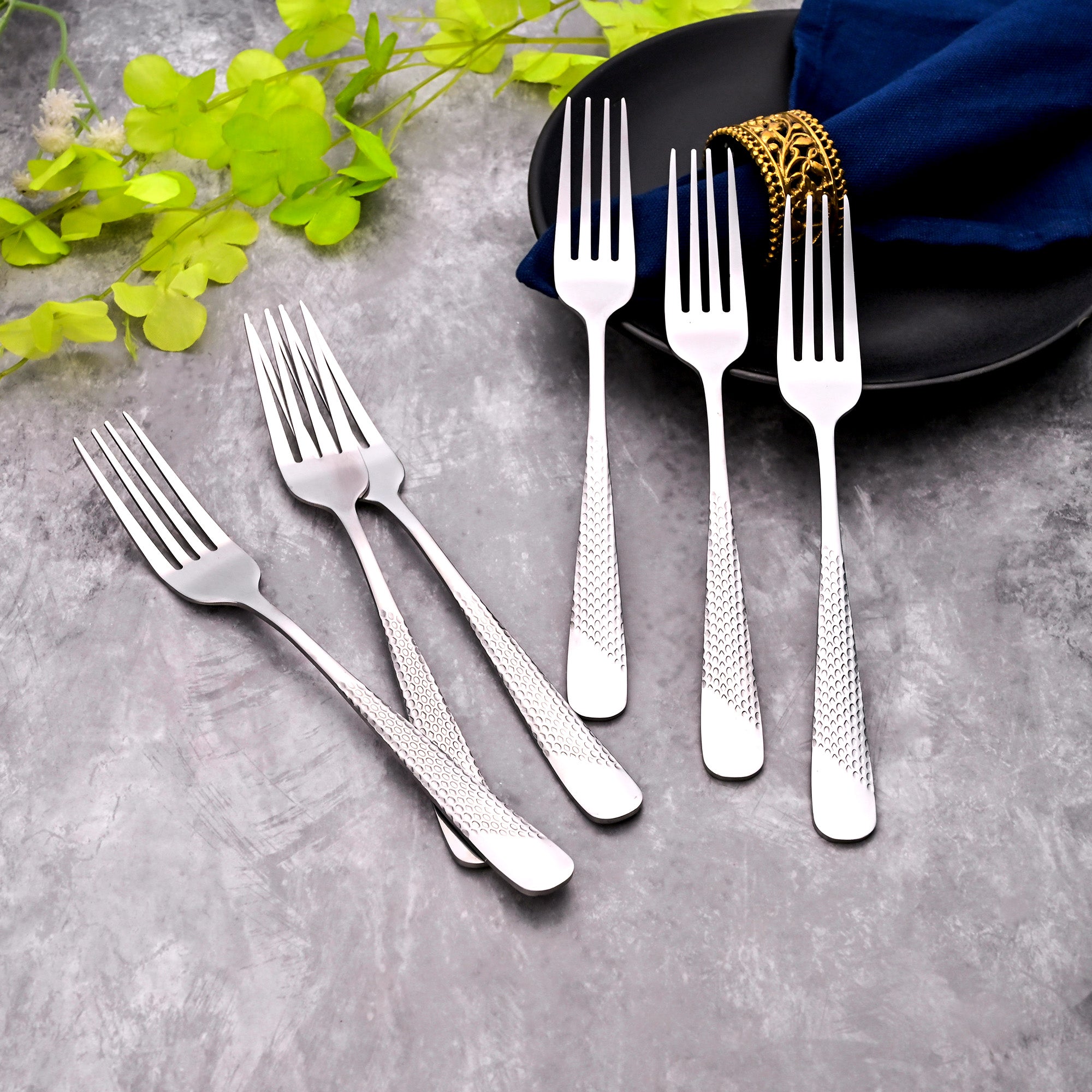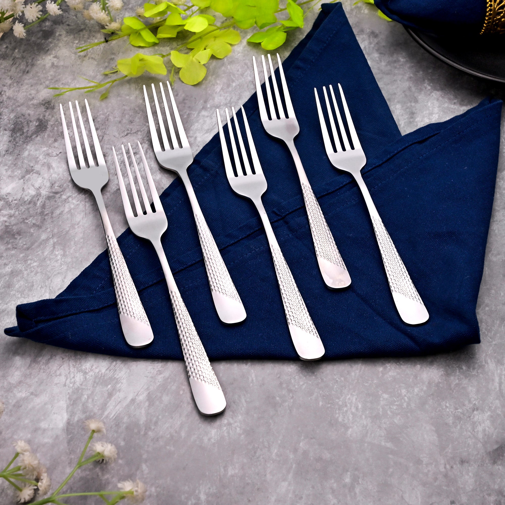 COD availableEnjoy your desserts, fruits, and salads with this classy Elite Silver Fork Set. Made from the finest quality stainless steel, these forks feature a hammered design on the handles that adds a versatile and elegant touch. Perfect for special occasions and dessert time.
