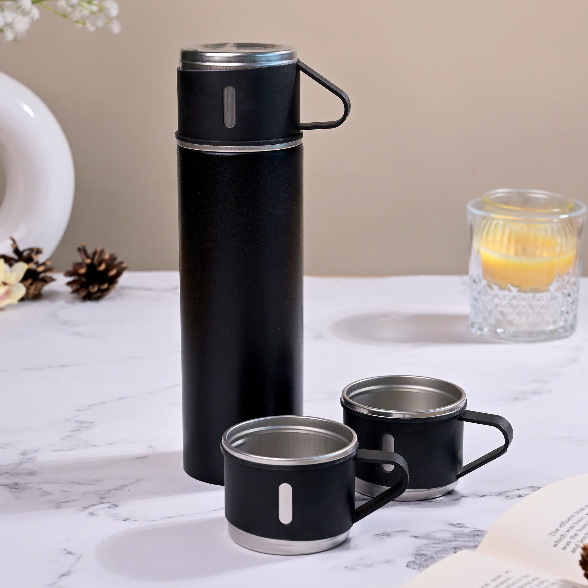 COD availableEnjoy timeless style and functionality with the Elite Stainless Steel Insulated Vaccum Flask set. Featuring one sleek black flask and two cups in polished steel, this set is designed to keep your drinks at the ideal temperature. The durable, stylish design and secure, leak-proof lids make these flasks perfect for every occasion, blending classic elegance with practical performance.