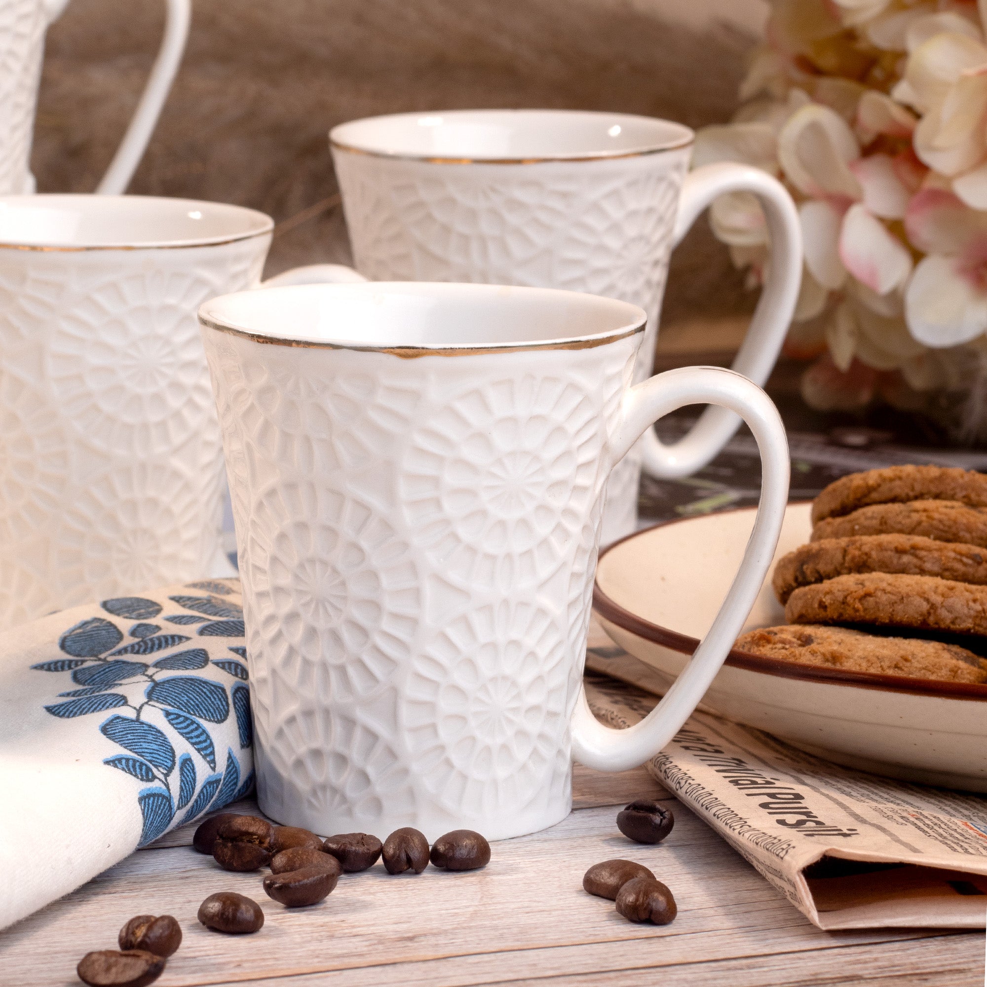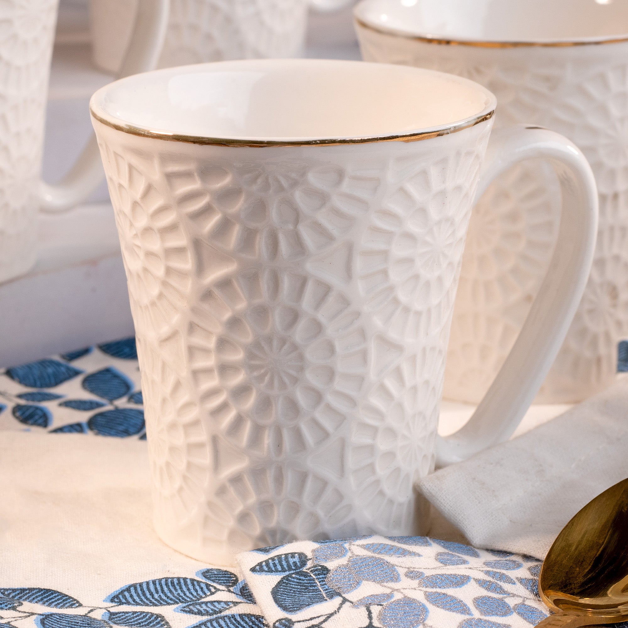 COD availableExperience the uniqueness dominating your tea nook as you pick this Embossed Tea Cup Set. Crafted with ceramic, you do not just pick a drinkware with high-quality and durability, but also make a responsible choice by picking a sustainable product. While the embossed patterns add uniqueness to the table, the golden rim brings back the nostalgia. Also, the handles of this cup are comfortable and strong, ensuring a spill-free tea time for you.