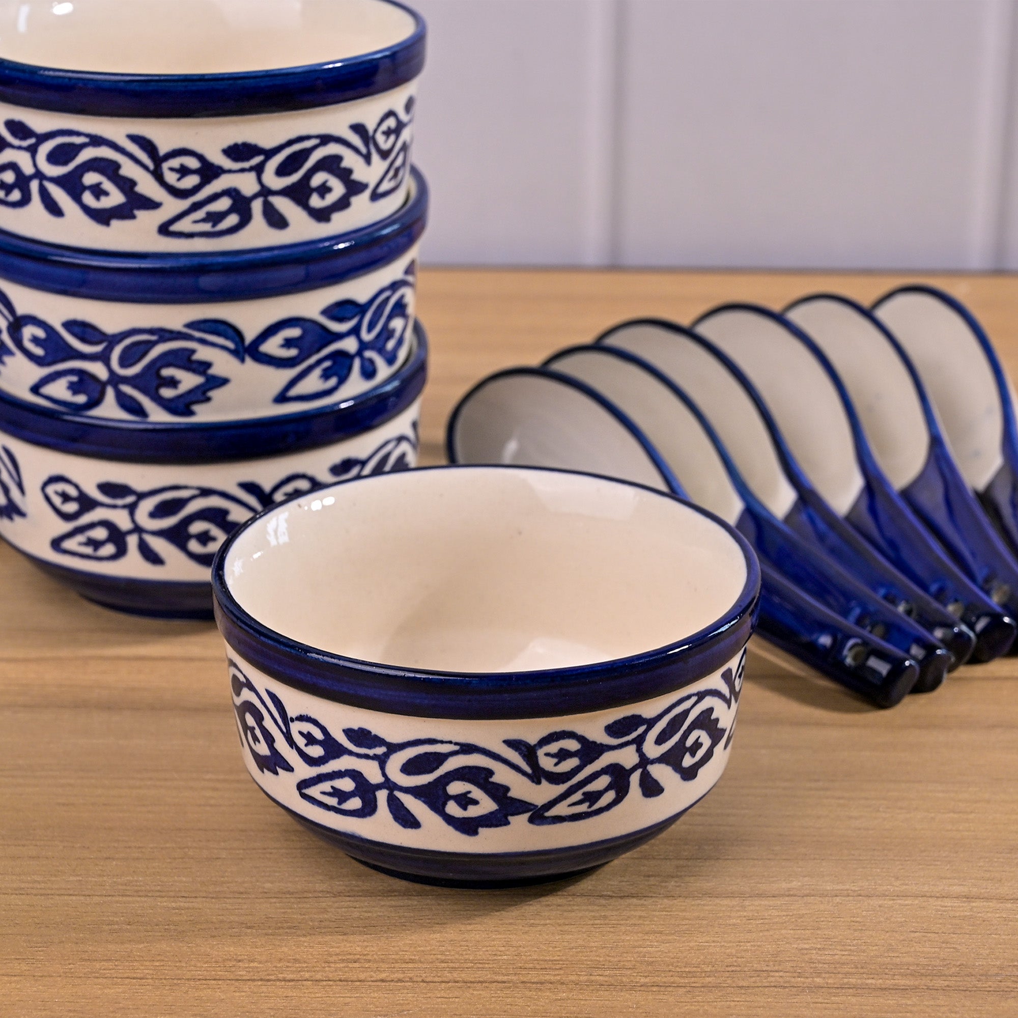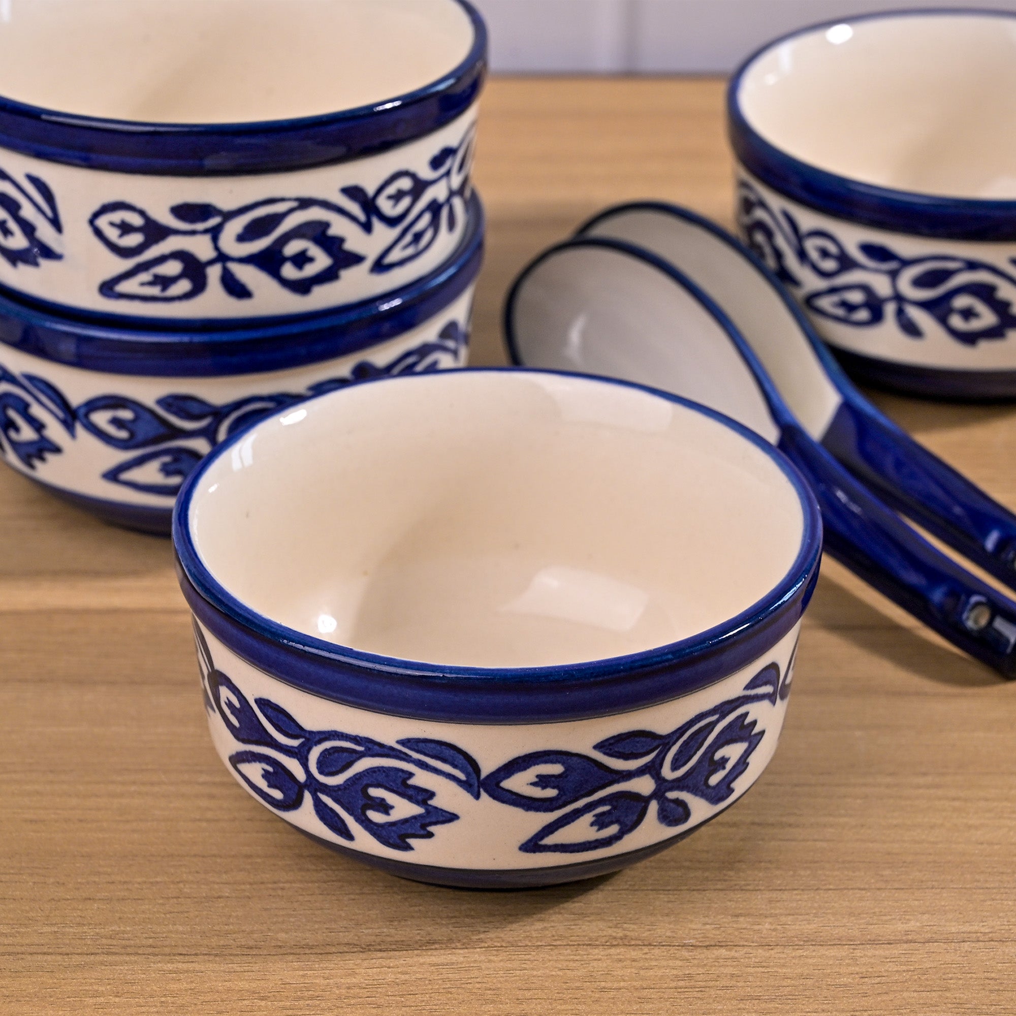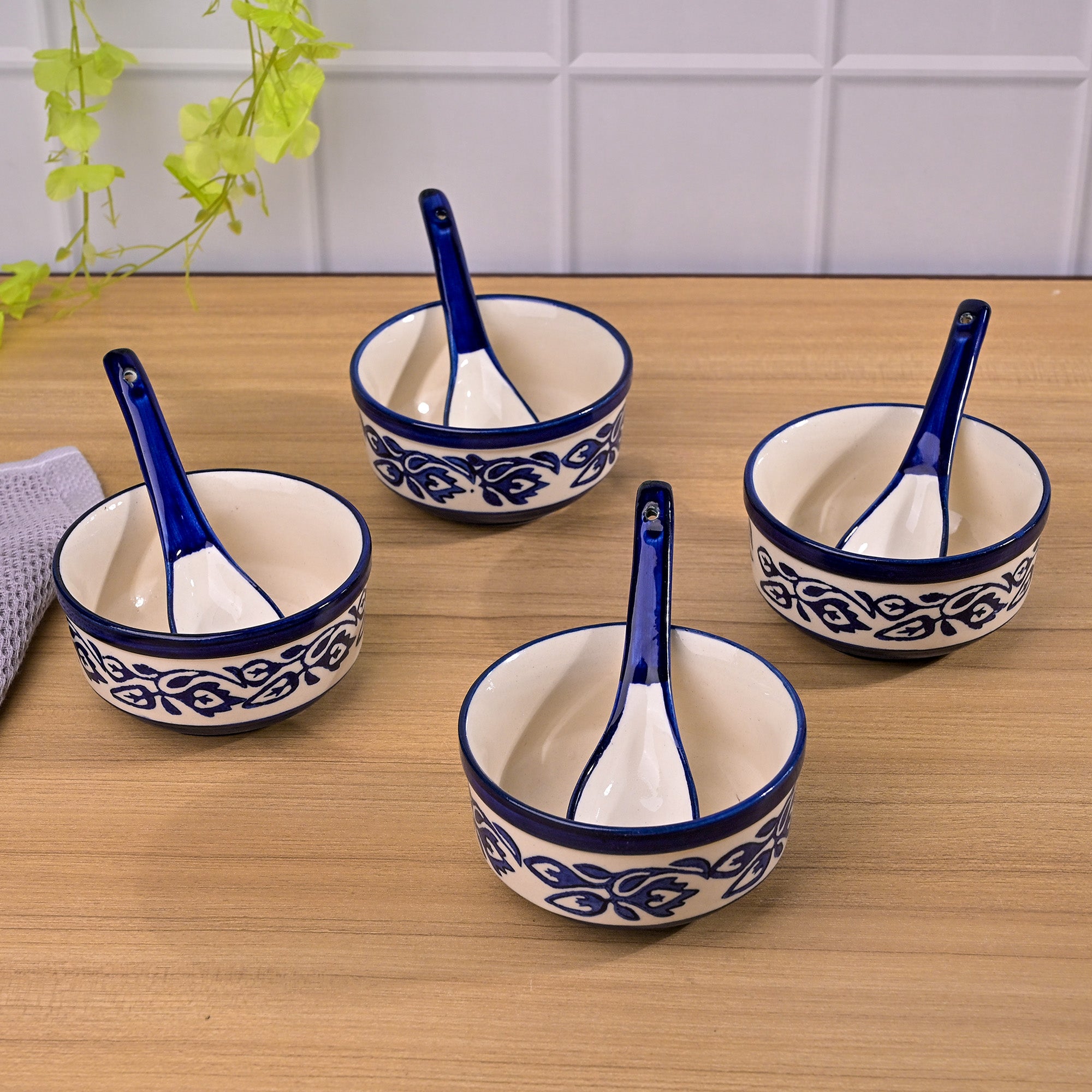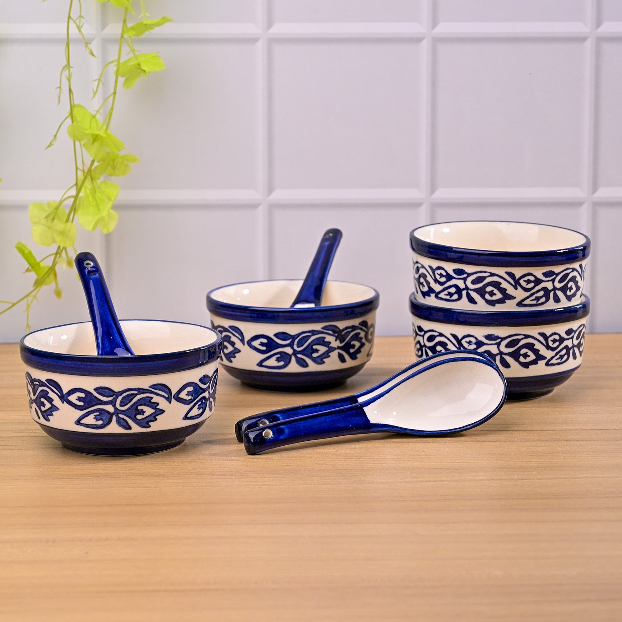 COD availableYour simple table deserves a vibrant touch that transforms the entire dining space. Kairaus brings this beautifully designed Floral Printed Porcelain Bowl set to do just that. With its glossy finish and hand-printed blue and white flower design, this bowl set is truly unforgettable at first glimpse. Made from porcelain, it offers both durability and a long-lasting shine. The best part? It comes with matching spoons making it even more versatile. And it's not just limited to soup- you can use these bowls for fruits, snacks, sweets or whatever you like.