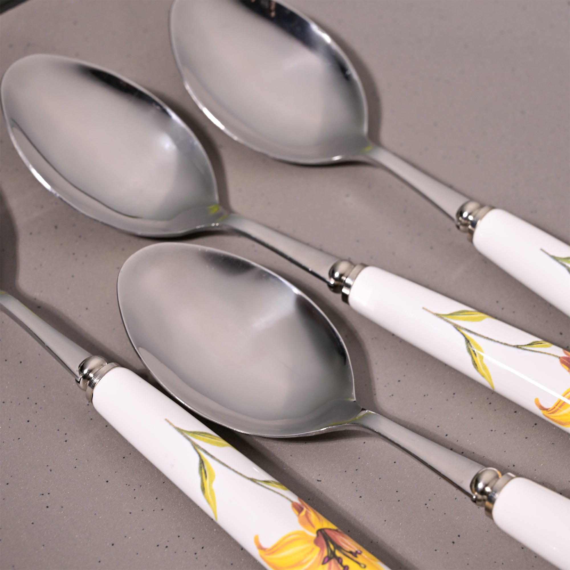 Each spoon features a golden daffodil design on a smooth white ceramic handle that instantly enhances its charm. Crafted from premium stainless steel, these spoons are as durable as they are elegant. You can use it for serving desserts, tea, or snacks, this set turns a simple moment into a statement of style and grace.