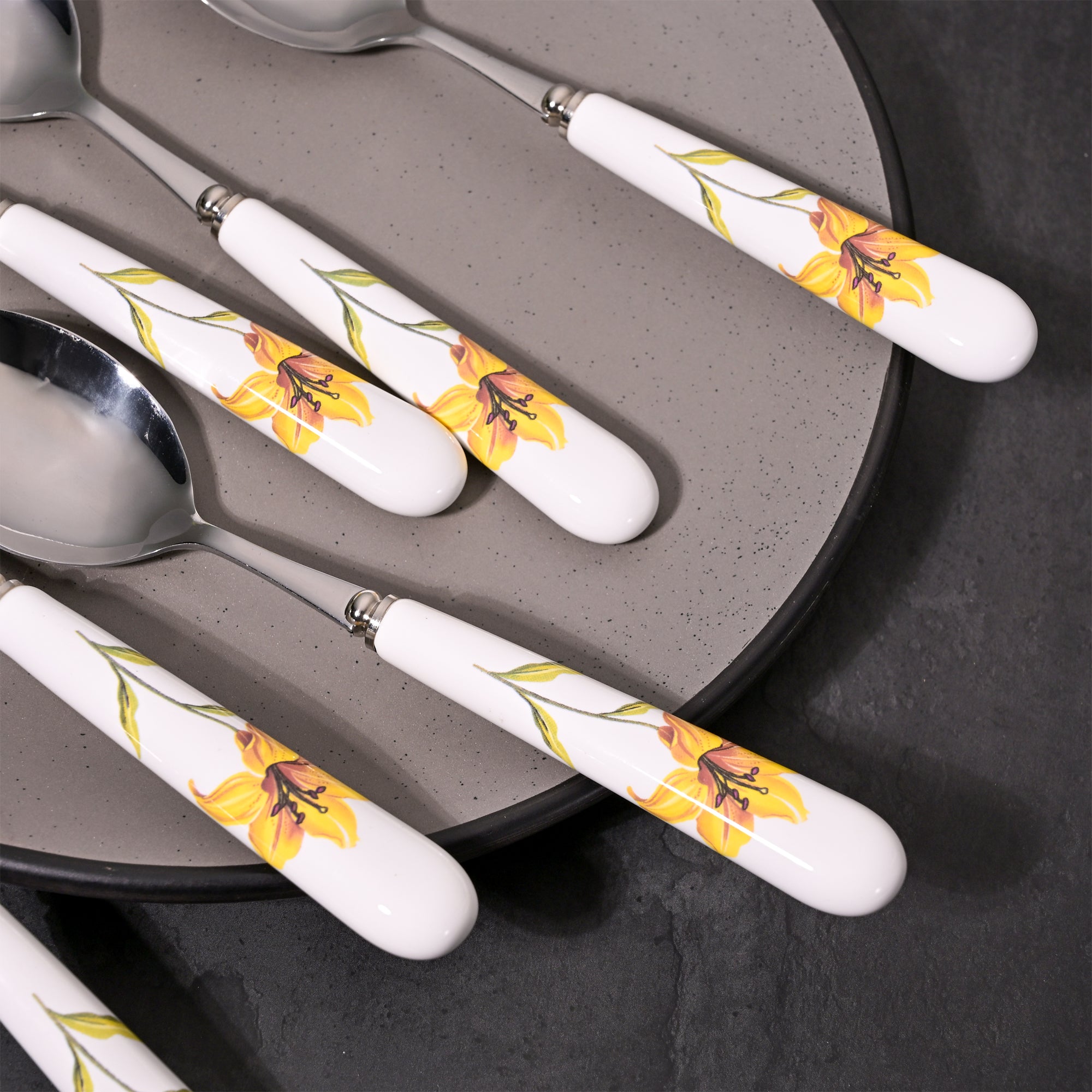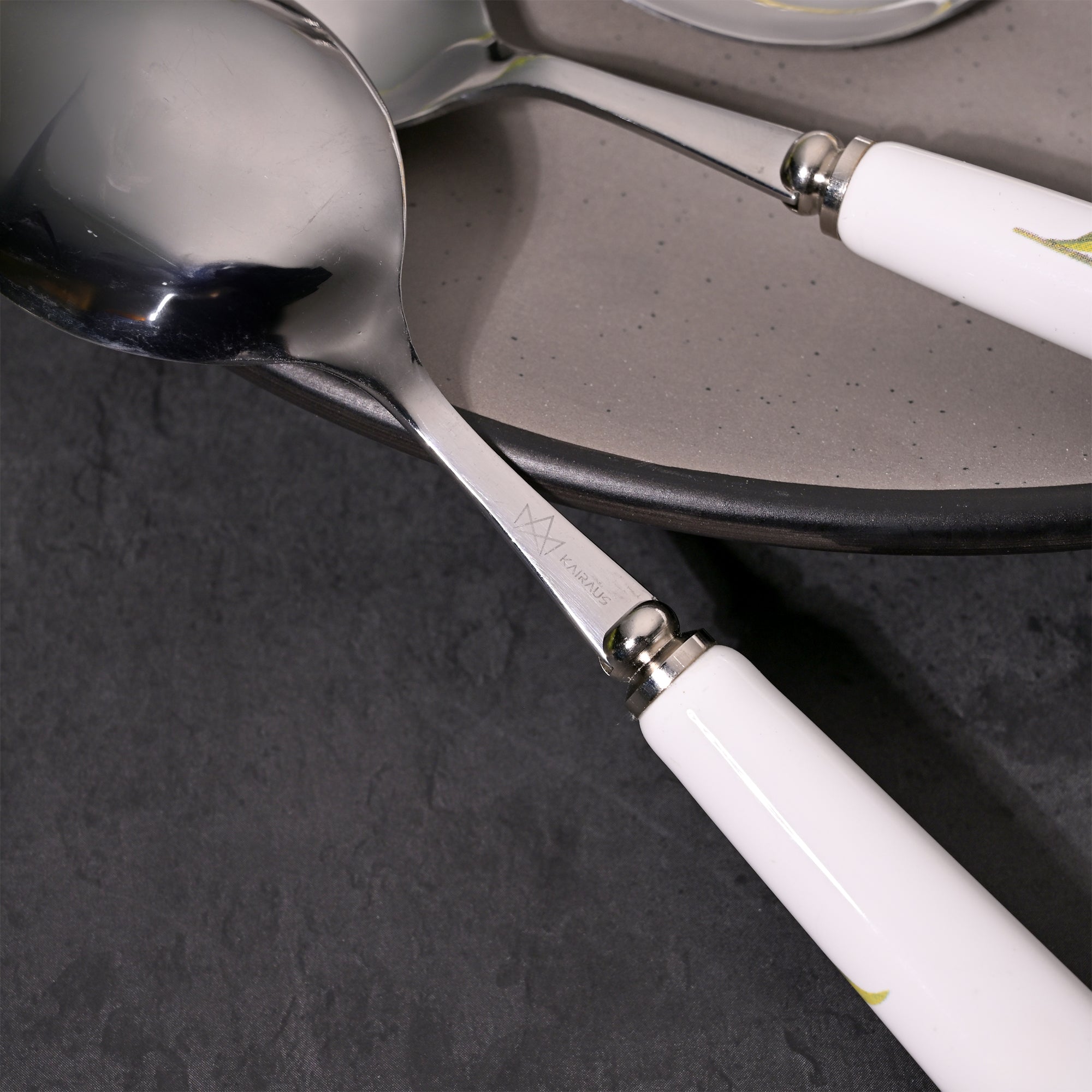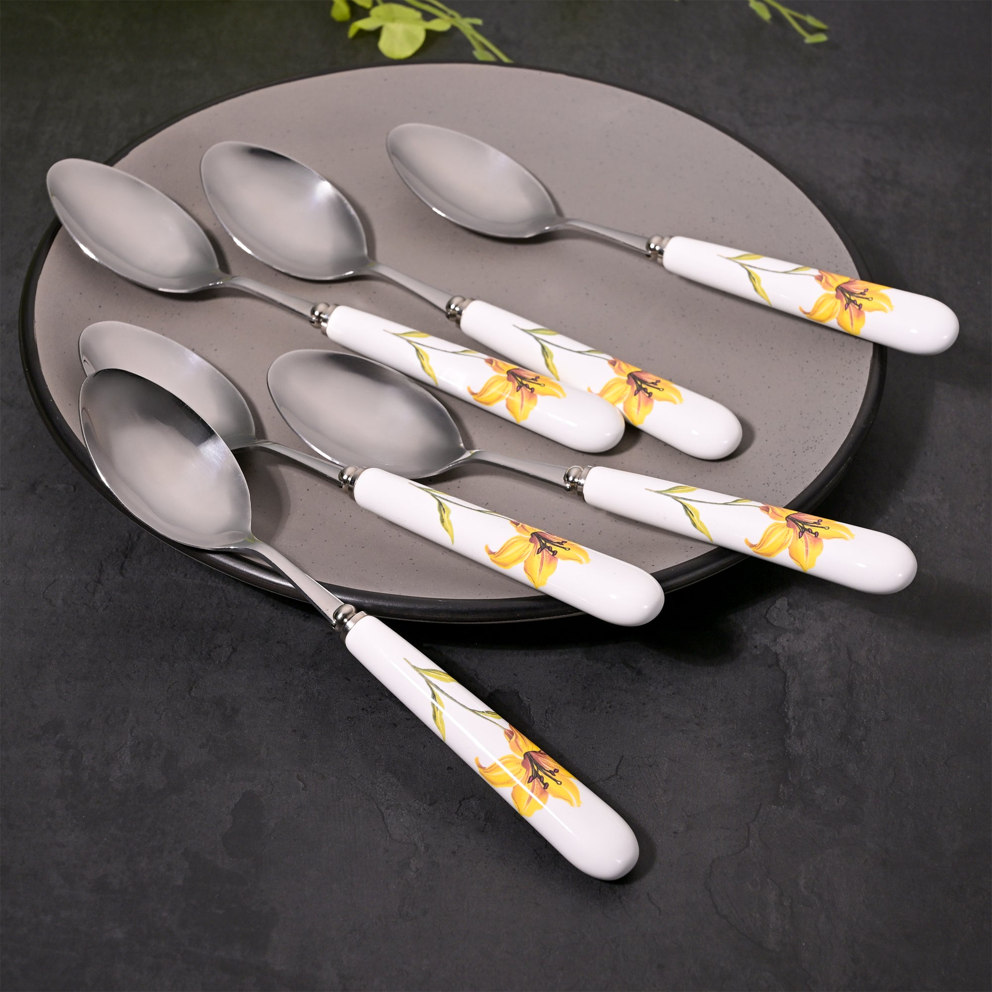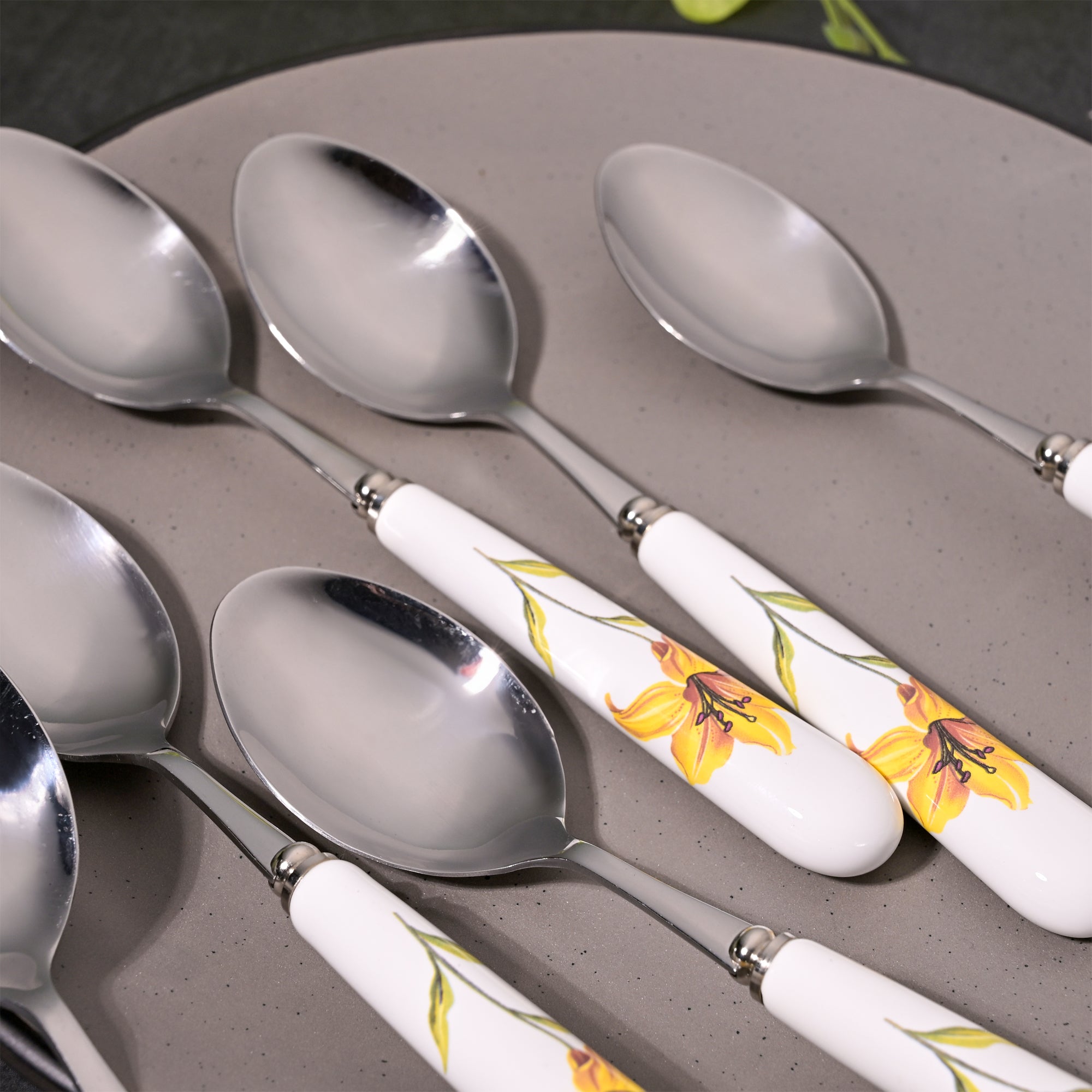 Each spoon features a golden daffodil design on a smooth white ceramic handle that instantly enhances its charm. Crafted from premium stainless steel, these spoons are as durable as they are elegant. You can use it for serving desserts, tea, or snacks, this set turns a simple moment into a statement of style and grace.