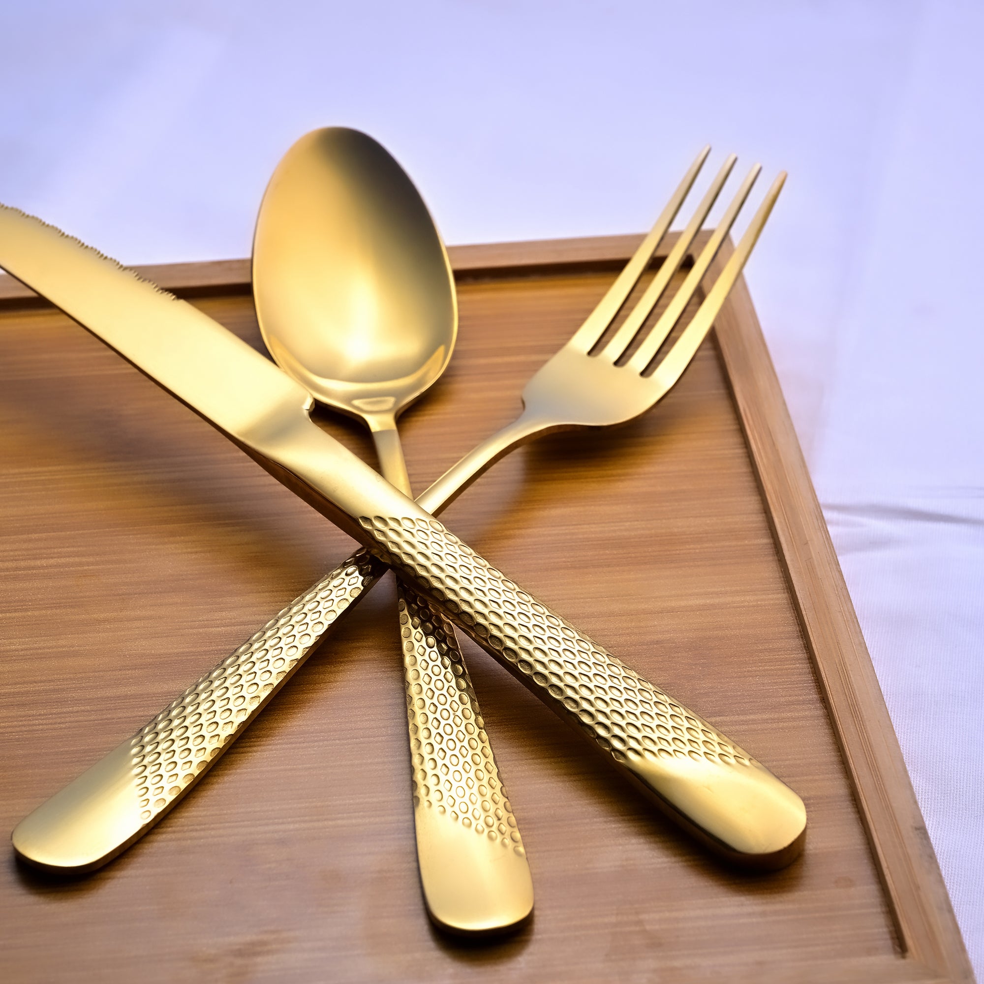 COD availableGold has the power to make anything look royal and elegant, just like your favorite jewelry. So, if you love that luxurious vibe and want to bring a premium touch to your dining table, this golden cutlery set is the perfect pick. The hammered design on top of each handle adds a soft texture that makes it look more attractive and stylish