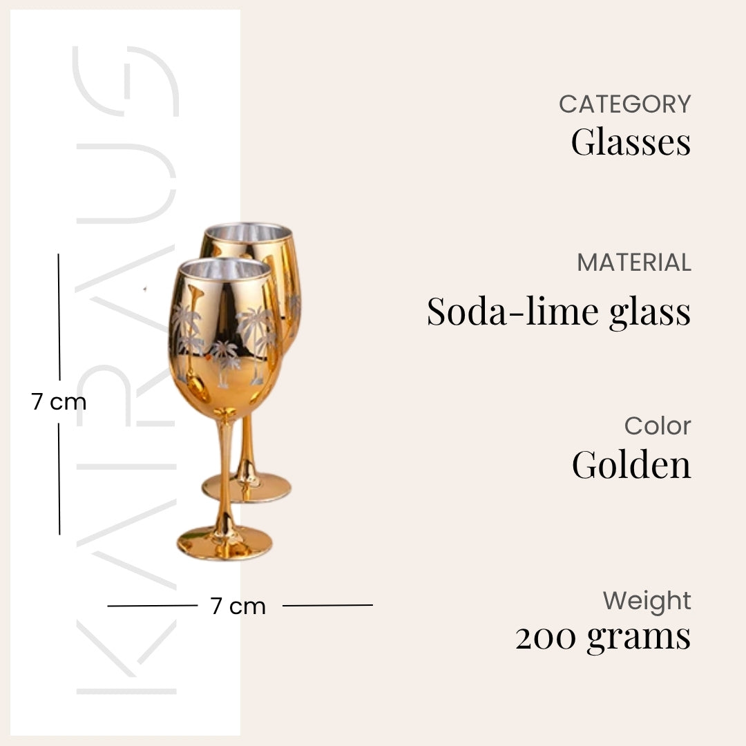 COD availableBring a little bit of paradise to your table with this 'Golden Wine Glass Set of 2.' Each one sparkles with a rich gold finish and features elegant palm tree engravings that adds a touch of tropical luxury to your wine moments. These glasses are perfect for sipping wine at special events. Their reflective surface catches the light beautifully, making every toast feel extra special. Excellent for those who appreciate a bit of glamour in their everyday moments.