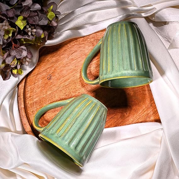 Groovy Green Ribbed Ceramic Coffee Mug (Set of 2)