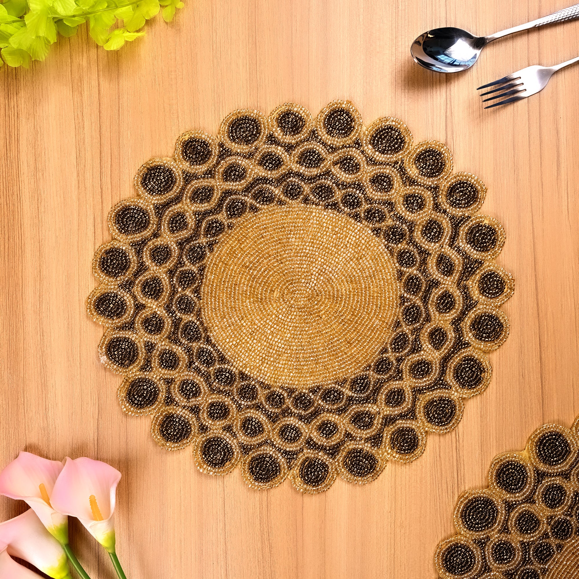 COD availableAdd a touch of elegance to your dining table with our Handcrafted Beaded Table Mat. Expertly crafted with intricate beadwork, this stunning placemat not only protects your surfaces but also elevates your table setting. Perfect for both casual meals and special occasions, it brings a unique blend of artistry and functionality. It’s the ideal accent for any decor style, making every meal feel like a celebration!