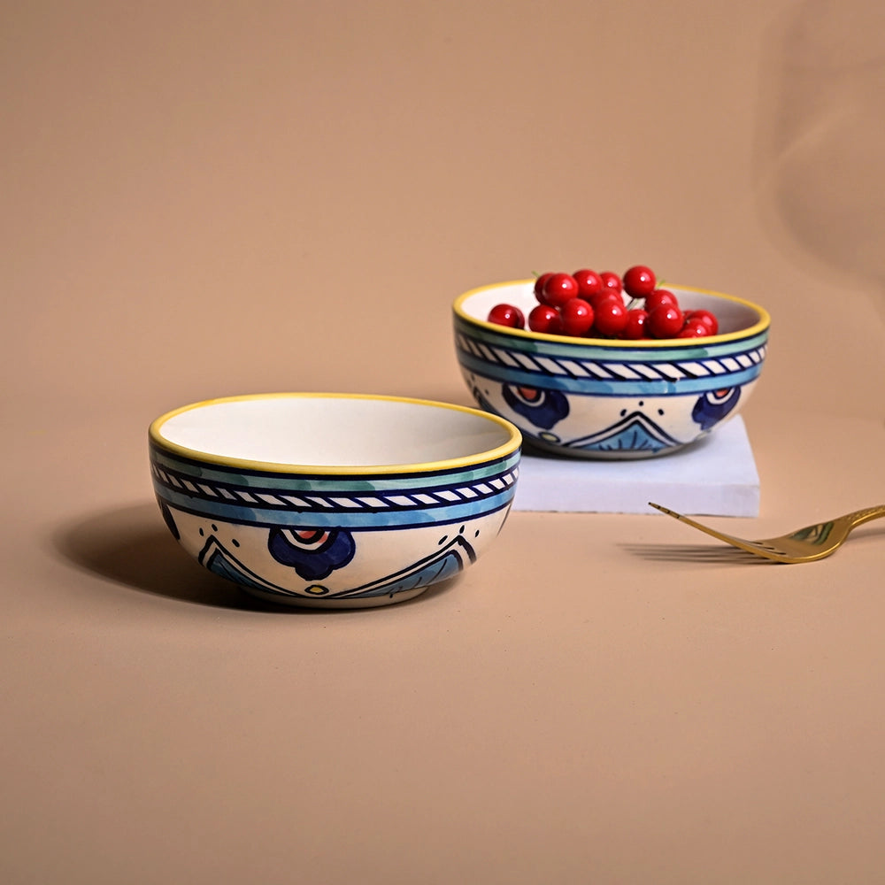 COD availableWant to add a touch of brightness and tradition in your serving style? This Handcrafted Ceramic Katori Bowl is the perfect match for your dining ! With a bold floral design, hand painted brush strokes, and a happy yellow rim, this bowl brings cheer and festive feeling to every meal. Made from high-quality ceramic, it can withstand everyday use, and is not just a artful piece. This bowl's deep and wide shape is best for serving fruits, snacks, or even curries. Whether you are hosting guests party or simply having a lunch that needs a little brightening up, this bowl makes each occasion bright and just a little bit more delightful. Handcrafted with joy and love, this bowl is a true celebration of color, culture, and craft.
