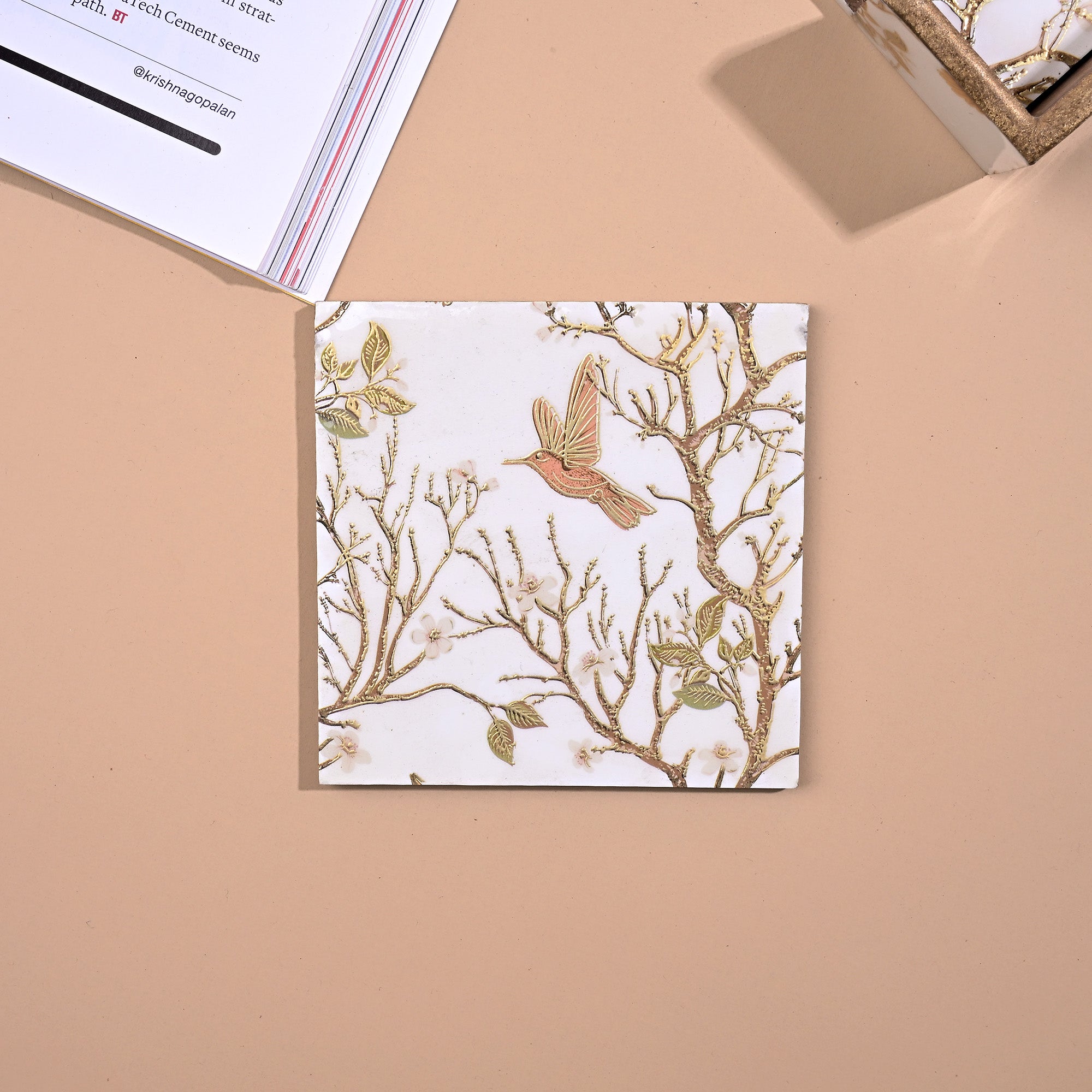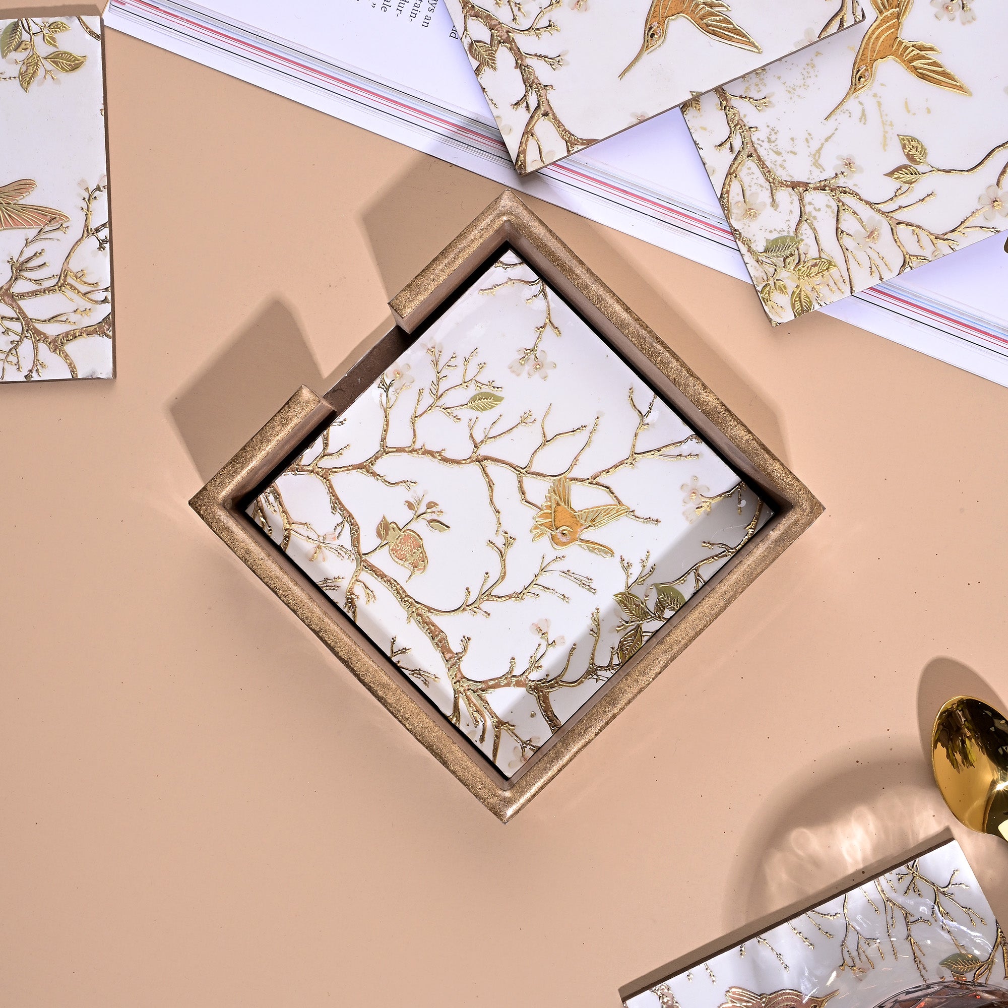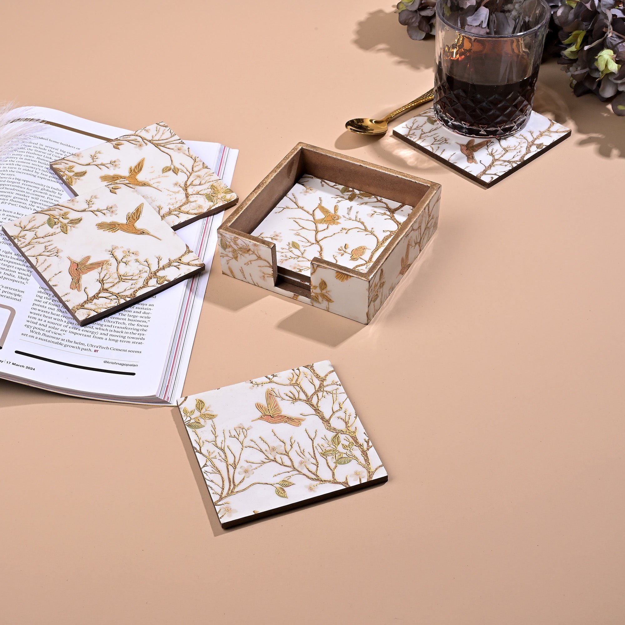 The set includes a sleek stand for convenient storage, keeping your coasters organized and easily accessible. Ideal for use in dining rooms, kitchens, offices, or restaurants, these coasters combine functionality with aesthetic appeal, ensuring your tables stay clean and your décor stays chic. Elevate your beverage experience with this charming and versatile coaster set.
