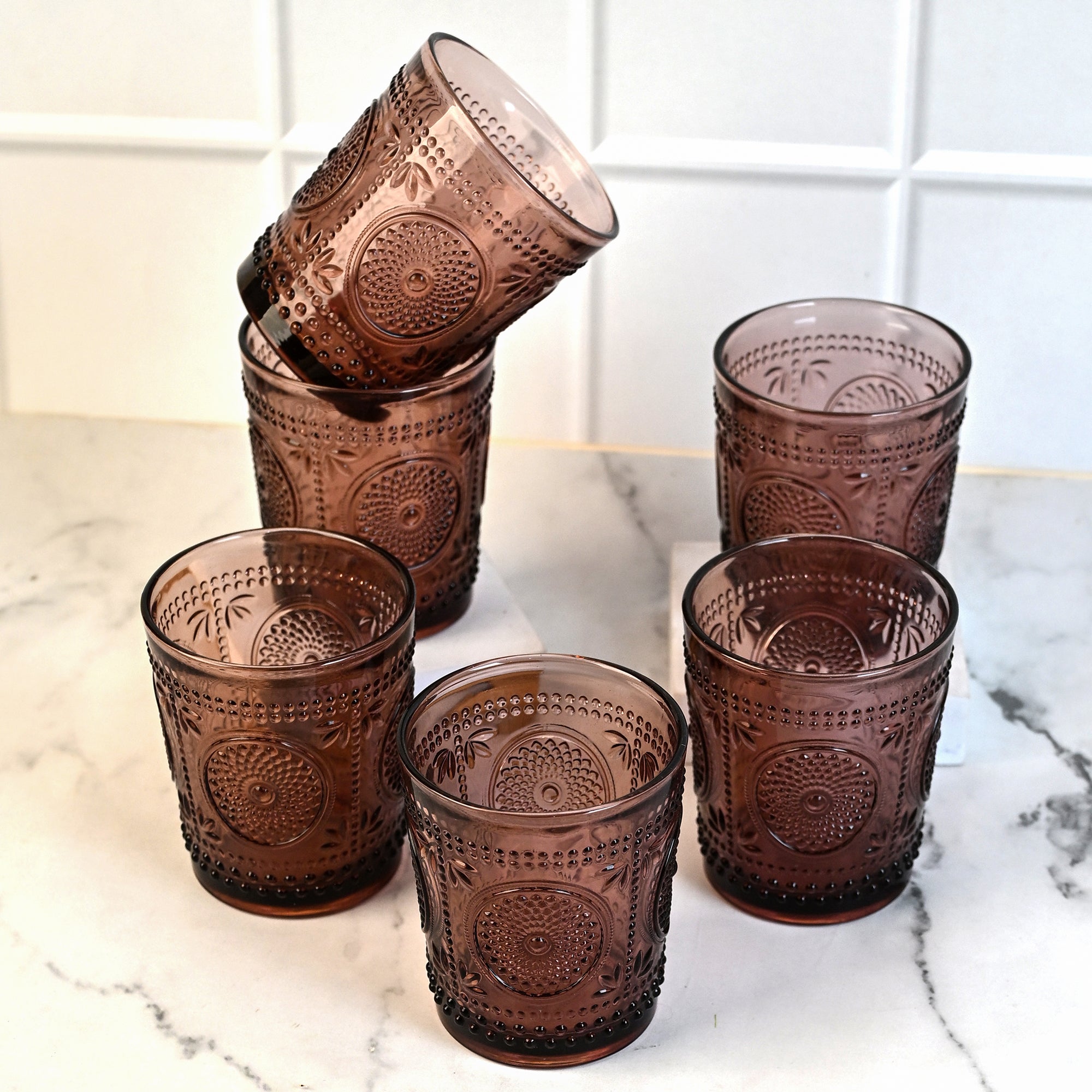 COD availableJuni is your escape from the world of mass-produced and ordinary glasses. Made with lead-free glass, Juni exudes its richness through its wine purple colour and perfectly embossed mandala, floral and leaf patterns. Its rim is wide and lustrous, making your trace memorable. Whereas its diameter is perfect to hold and enjoy every sip and pour. Moreover, it weighs strongly yet effortlessly and has a smooth base with a sign of rarity: Kairaus' crown.