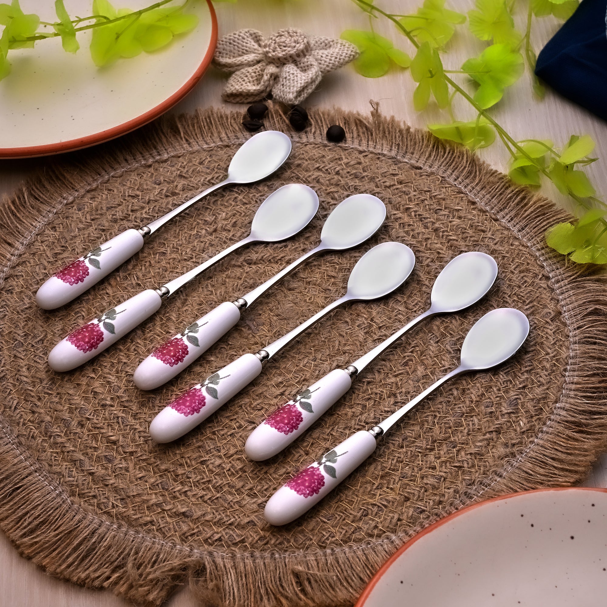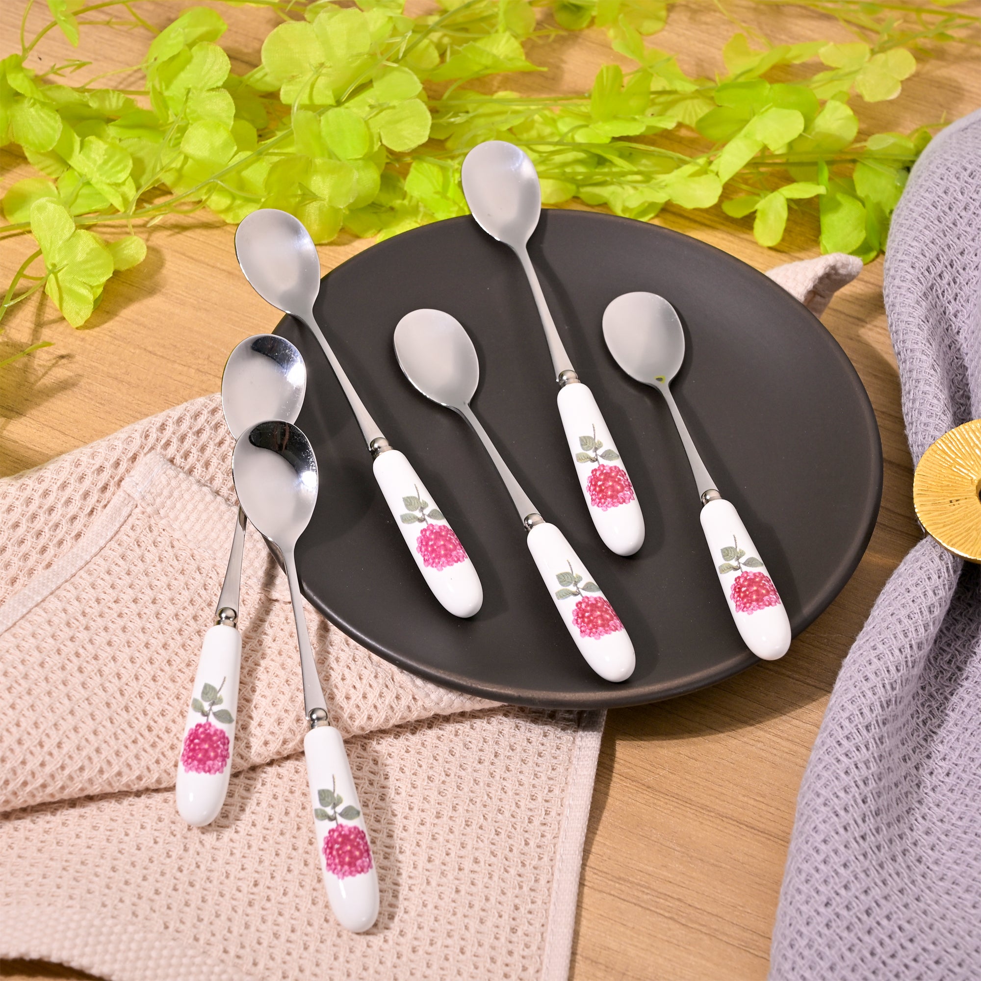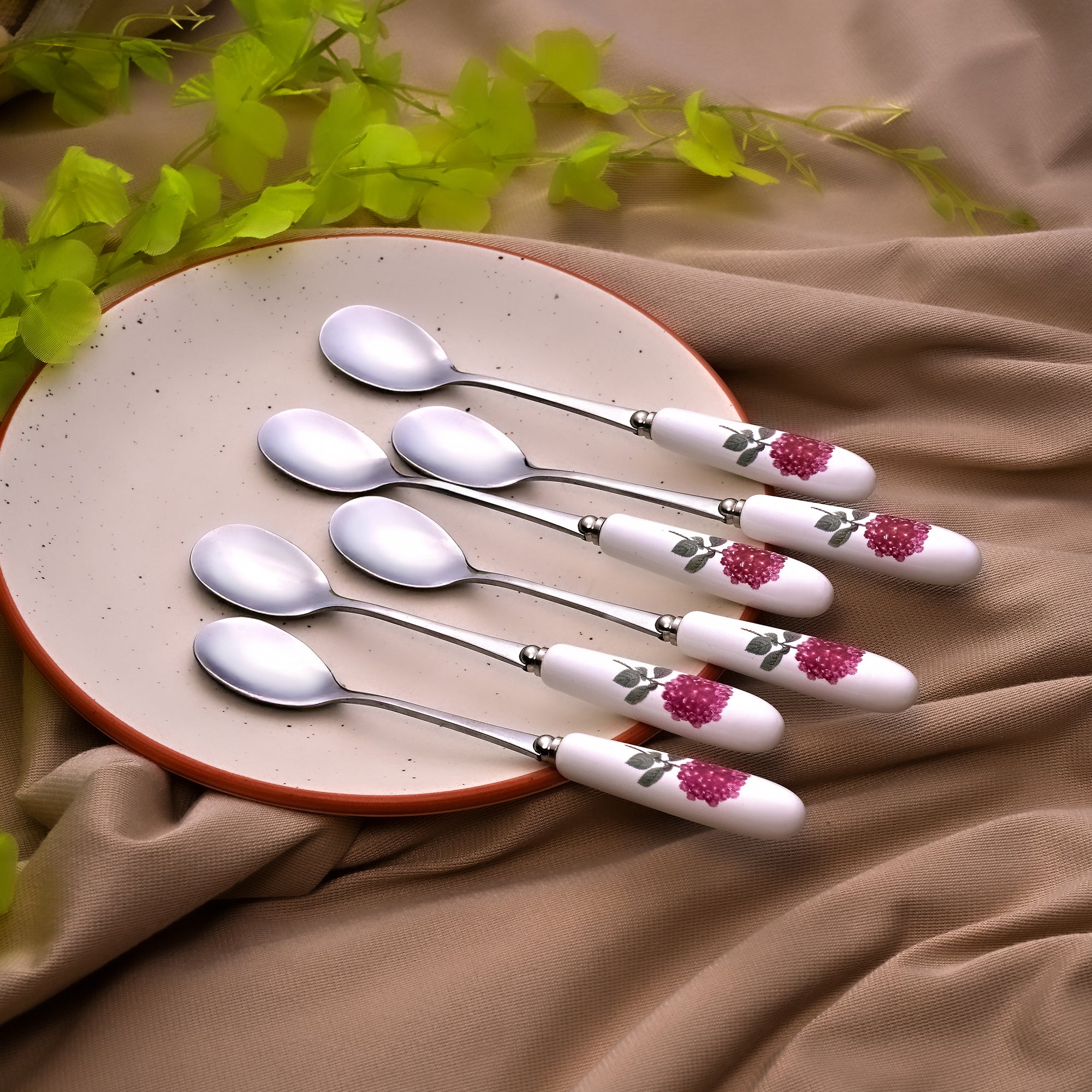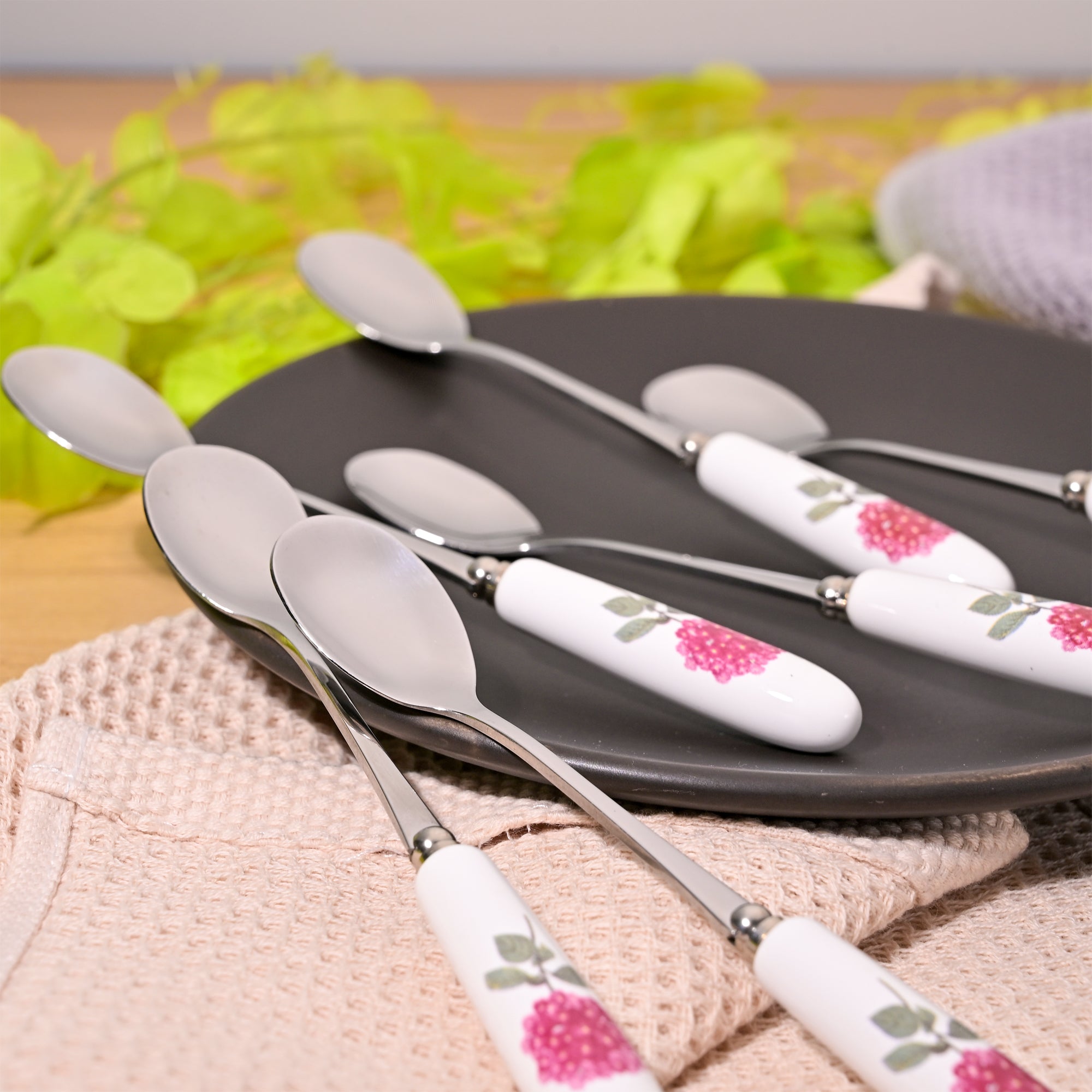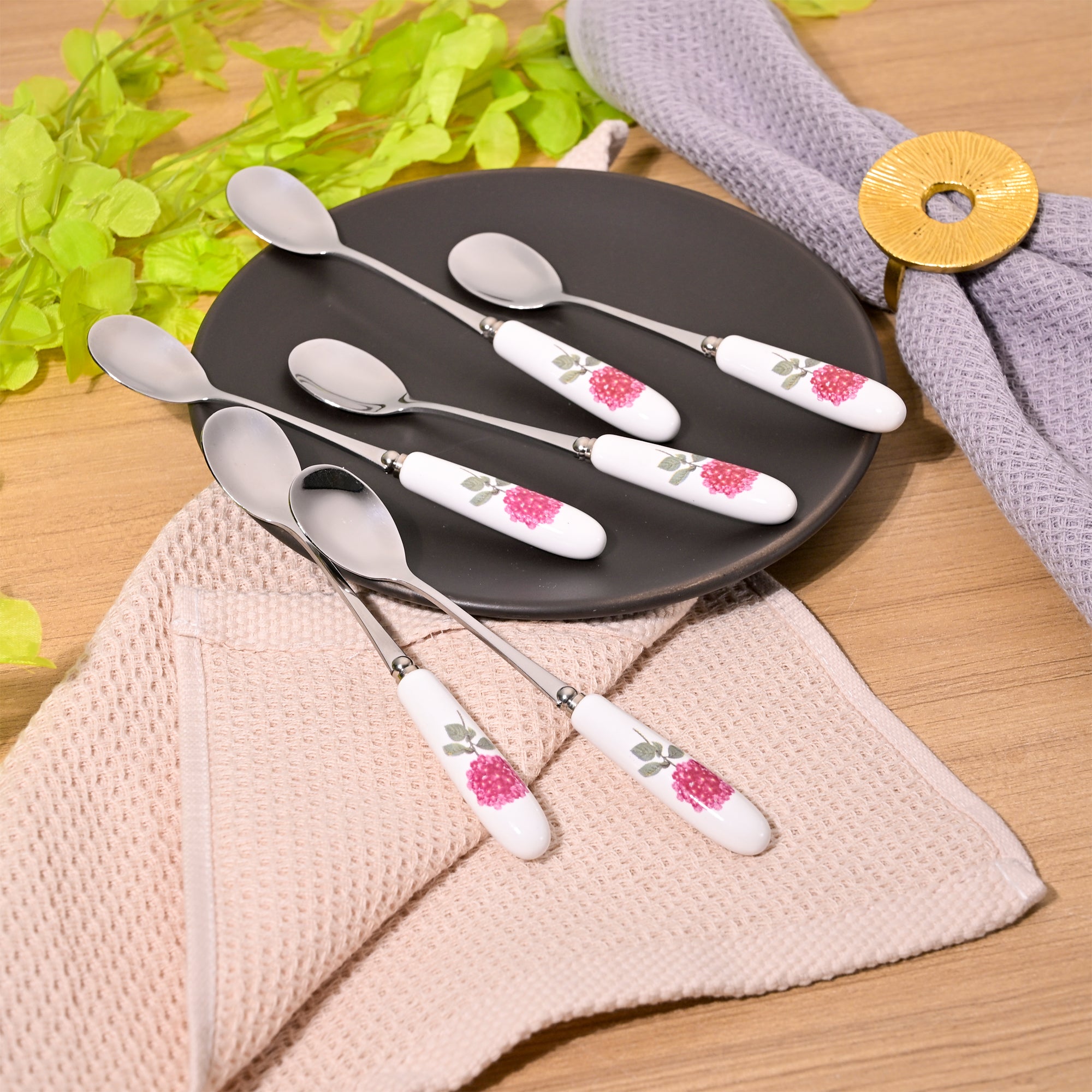 The floral design over a glossy white ceramic handle brings a soft, elegant look that instantly upraises your table setting. This set is made with high-quality stainless steel, these spoons are not just pretty but also strong and durable perfect for everyday desserts or when you're hosting something special.