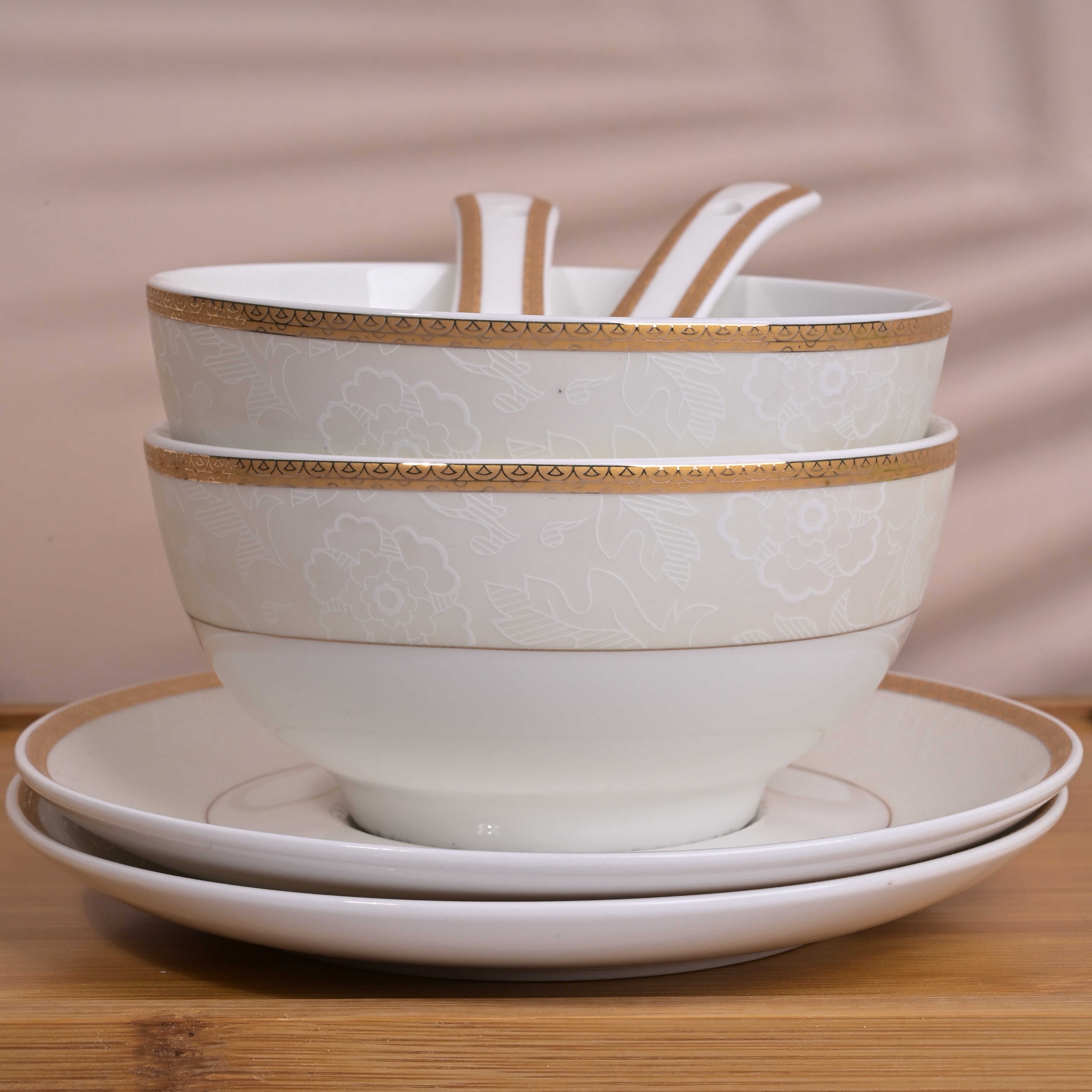 COD availableWant some cosy feeling with royal grace? Well, we've got just the perfect piece for you with our Luxurious Gold-Rimmed Soup Bowl Set. This bowl is designed for those who love enjoying their warm soups in bowls that feel truly relaxing. Made from high-quality porcelain, it offers both durability and a long-lasting finish. The classic white colour with golden detailing gives this soup bowl a royal touch, while the subtle cream floral design adds a vintage vibe. If you want that royal feel at your table, try this bowl and exalt your cosy mealtimes.