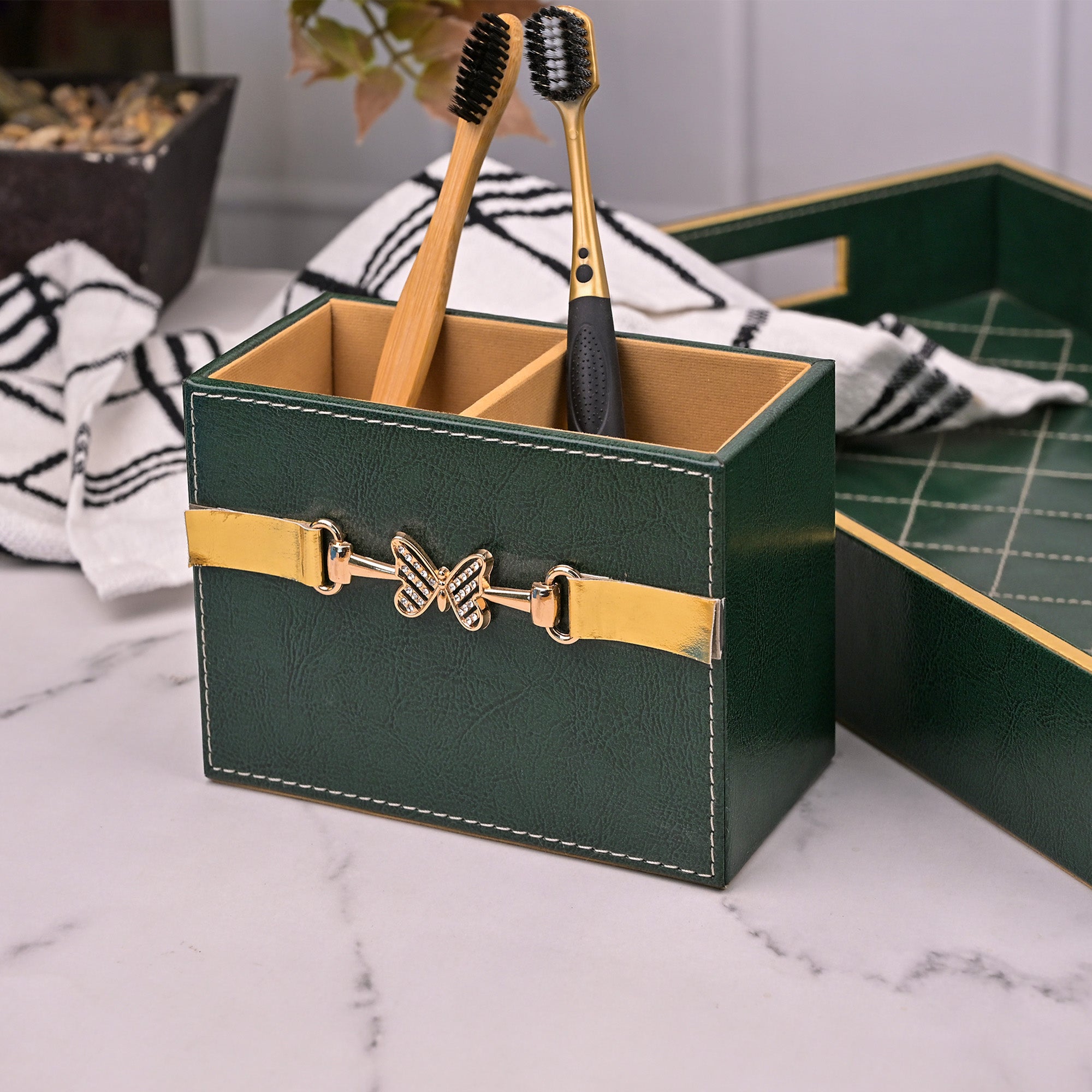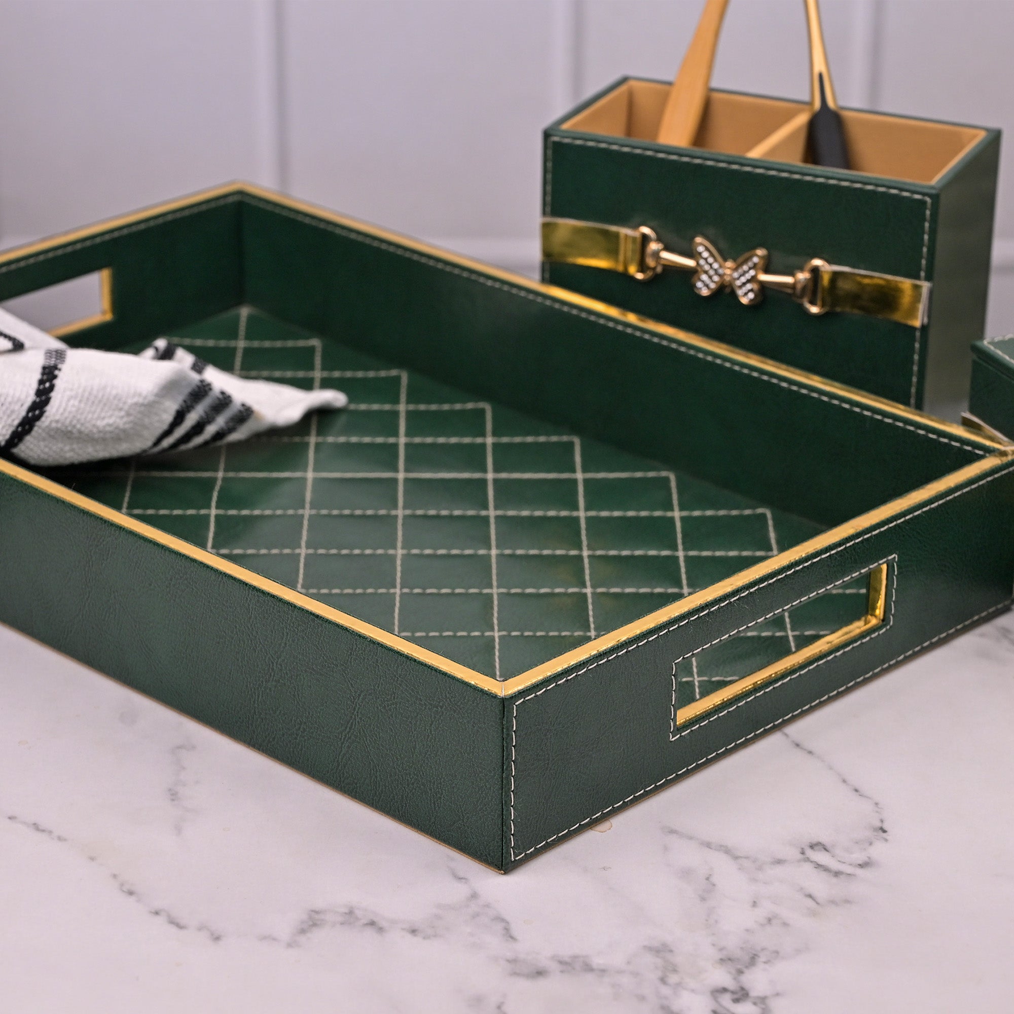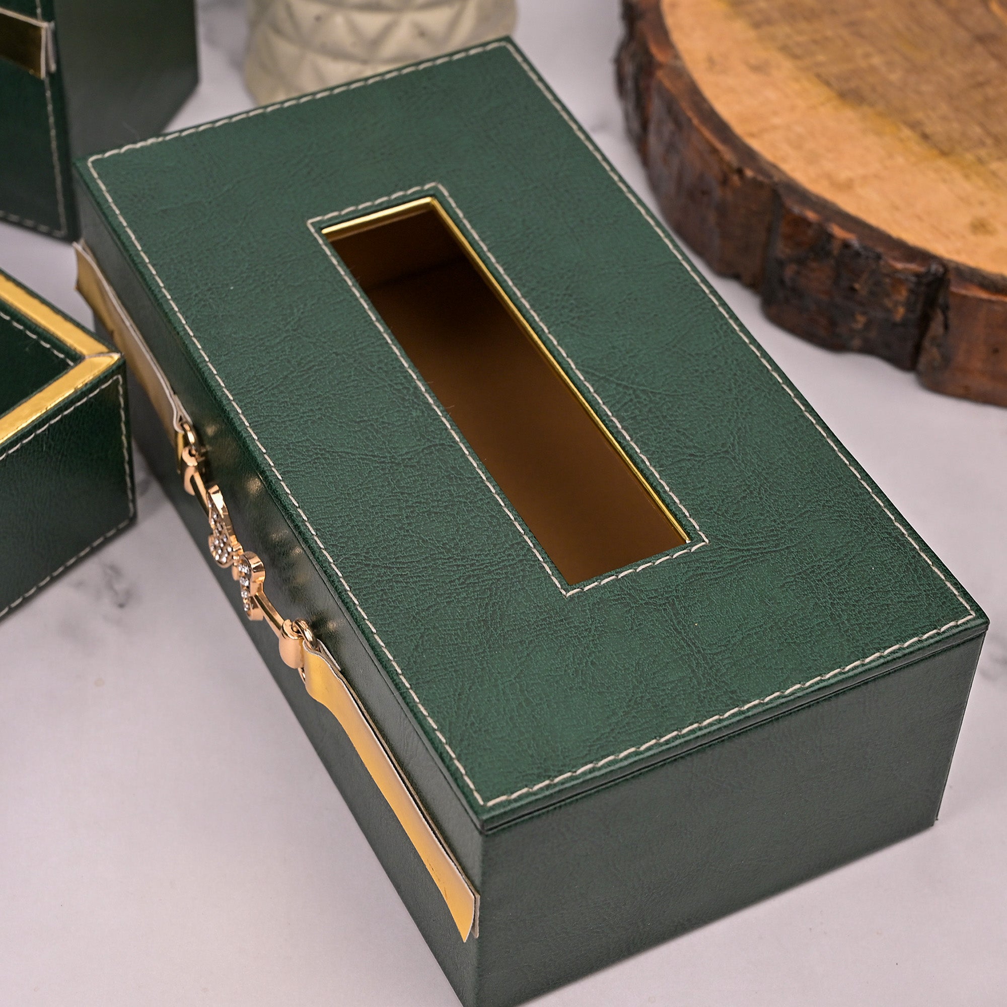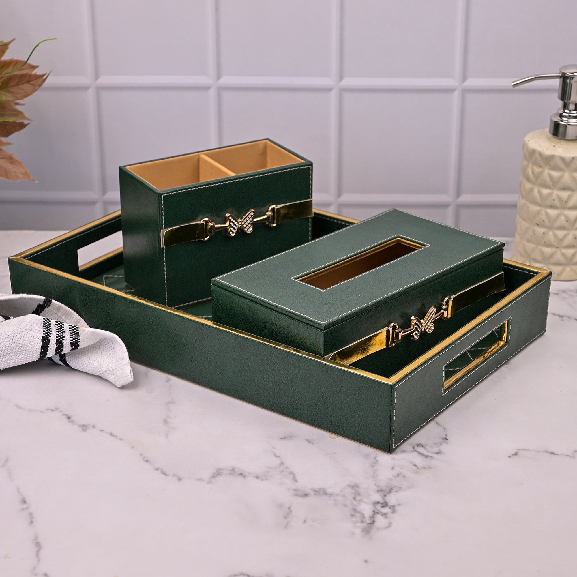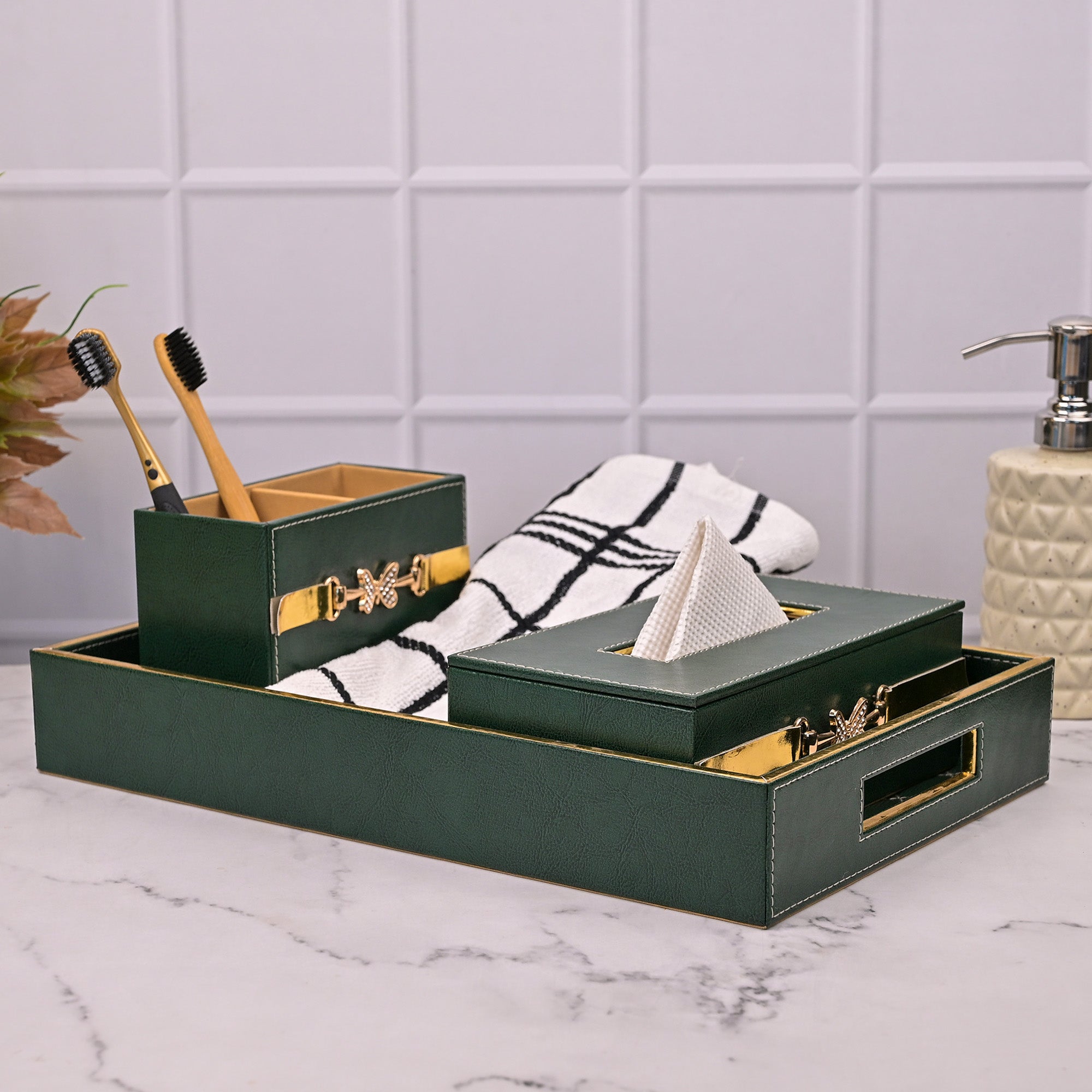 COD availableThis elegant and Luxury Green Leather Bathroom Accessory Set features a versatile storage box, a stylish tray, and a convenient tissue holder box, all designed to enhance your bathroom's aesthetic. The interior is lined with soft green cloth, providing a touch of luxury while protecting your items. Perfect for organizing essentials, this set combines functionality with a sophisticated design, making it an ideal addition to any modern bathroom decor.