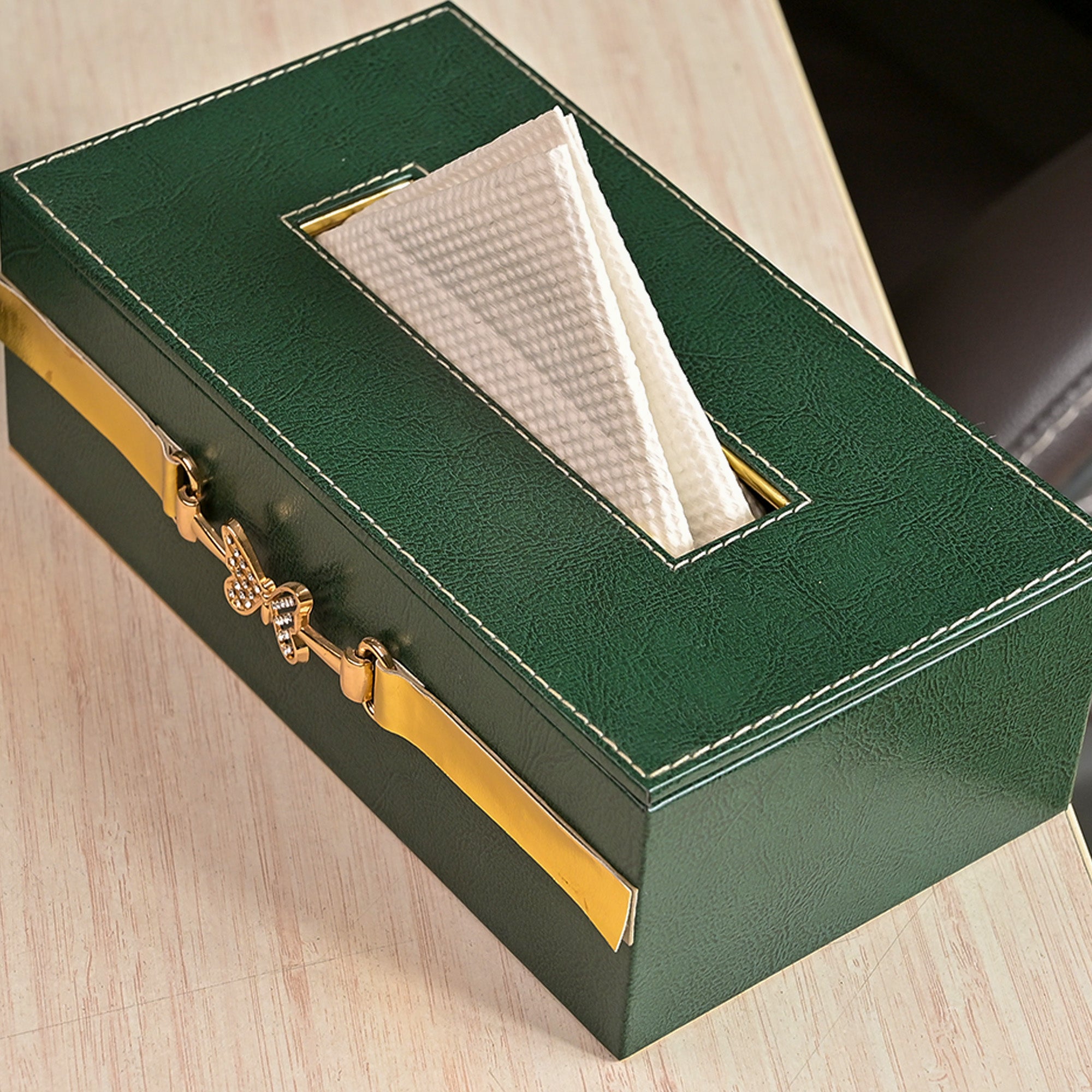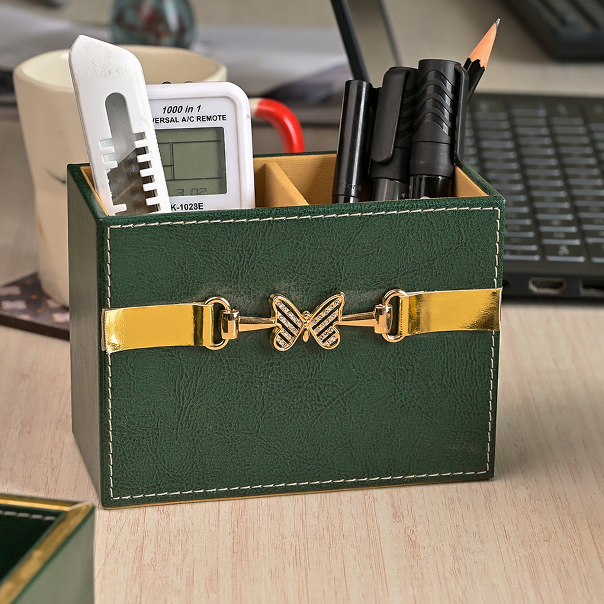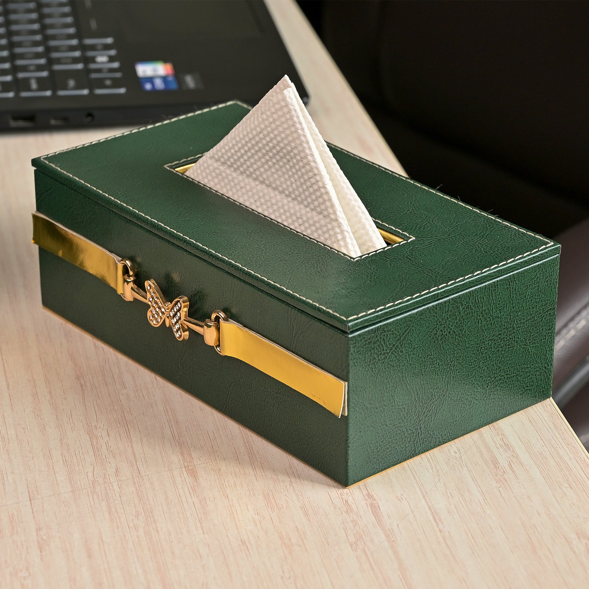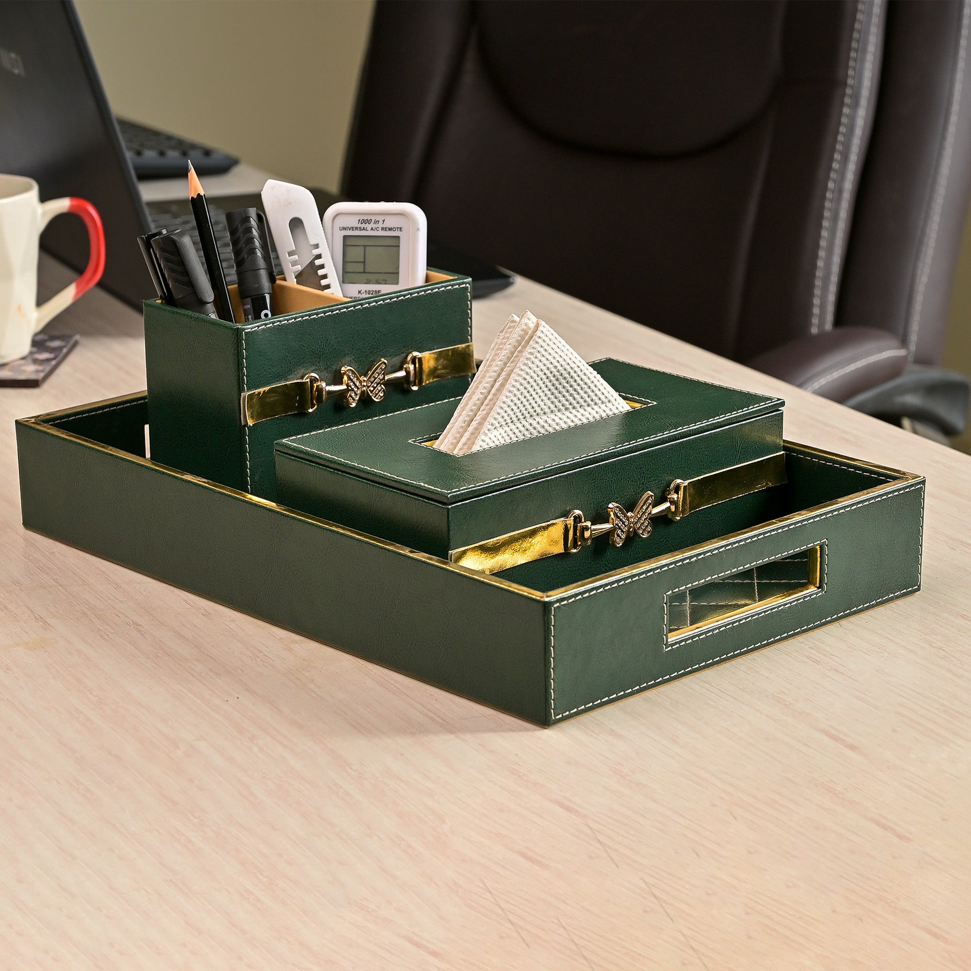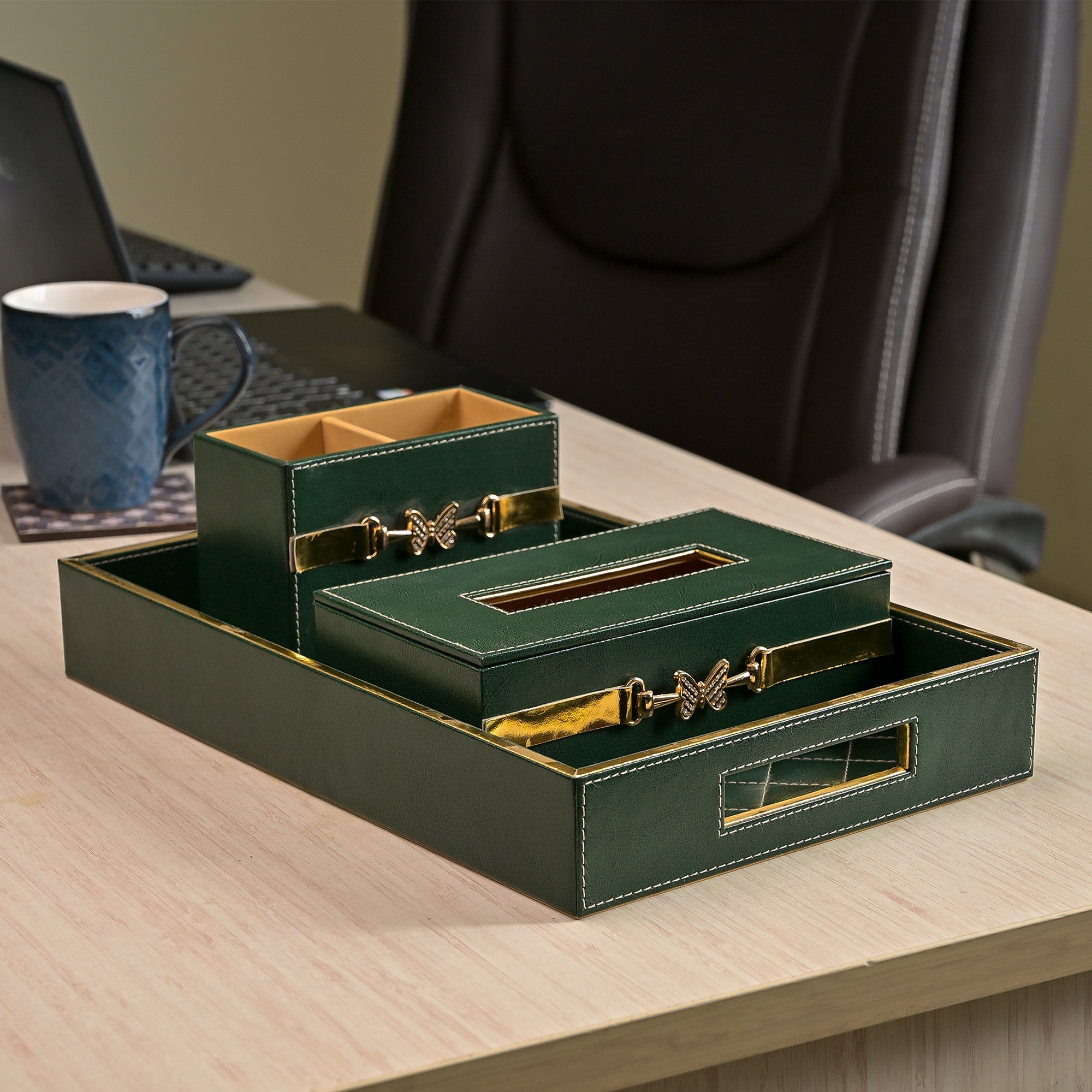 COD availableThis elegant and Luxury Green Leather Desk Organiser Set features a versatile storage box, a stylish tray, and a convenient tissue holder box, all designed to enhance your bathroom's aesthetic. The interior is lined with soft green cloth, providing a touch of luxury while protecting your items. Perfect for organizing essentials, this set combines functionality with a sophisticated design, making it an ideal addition to any modern desk decor.