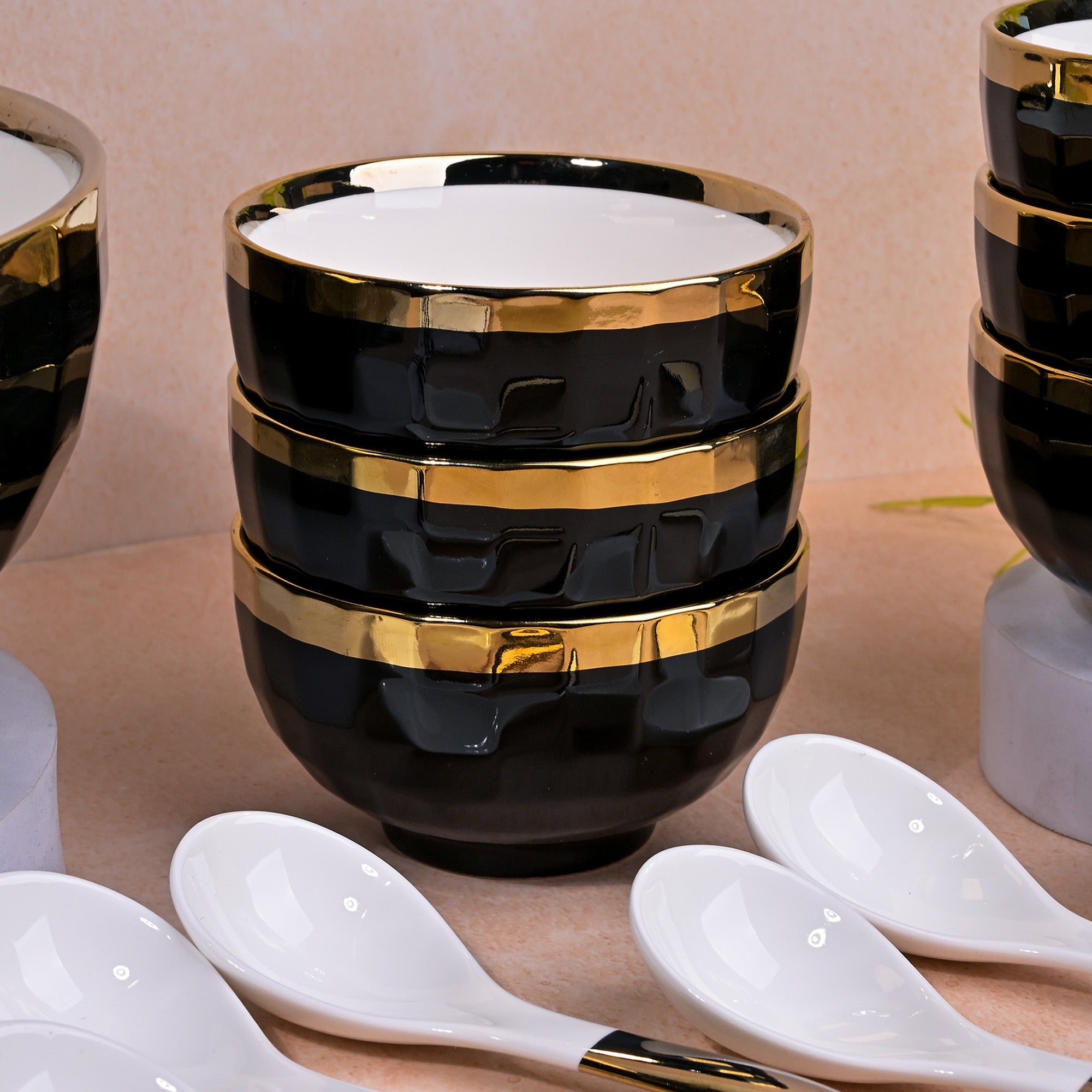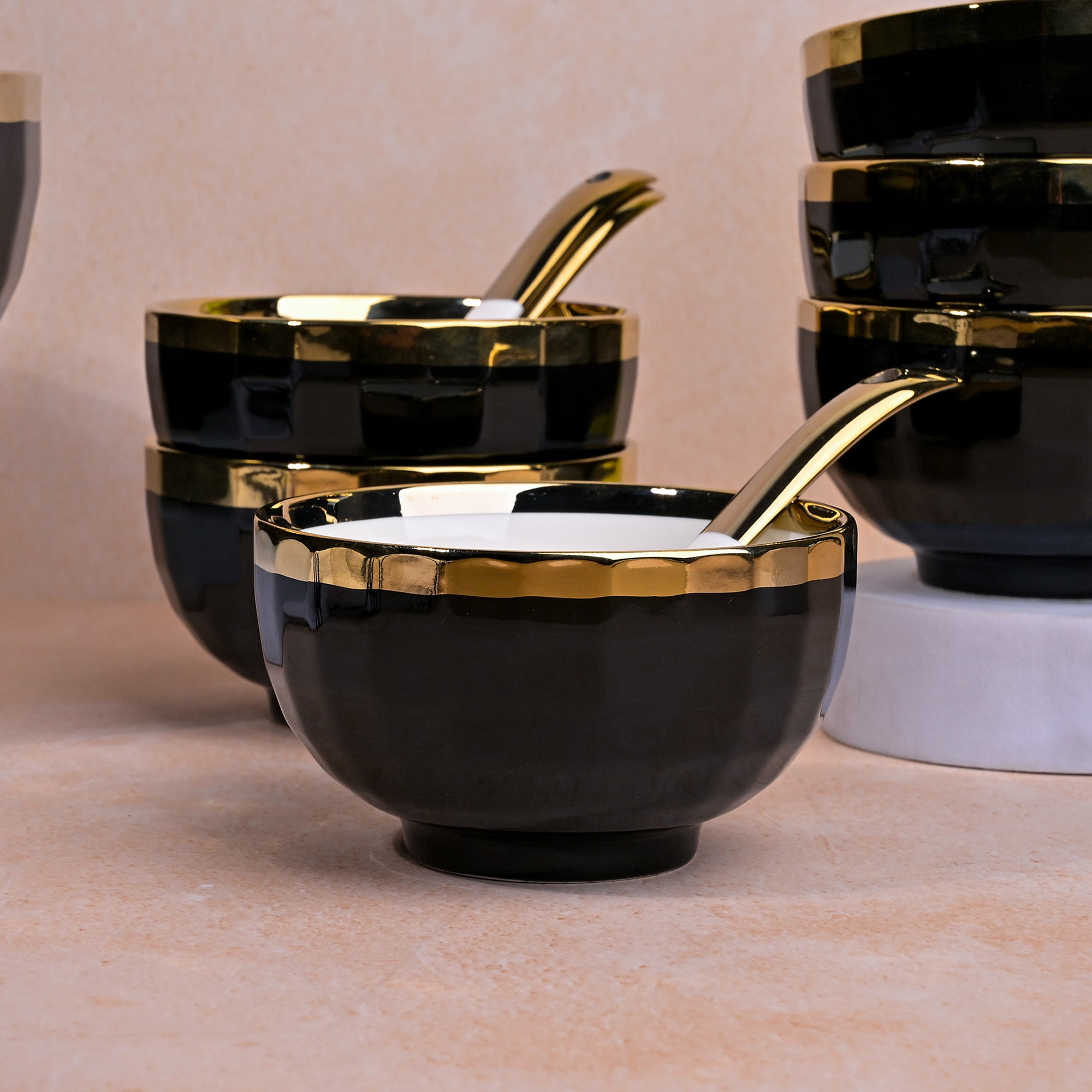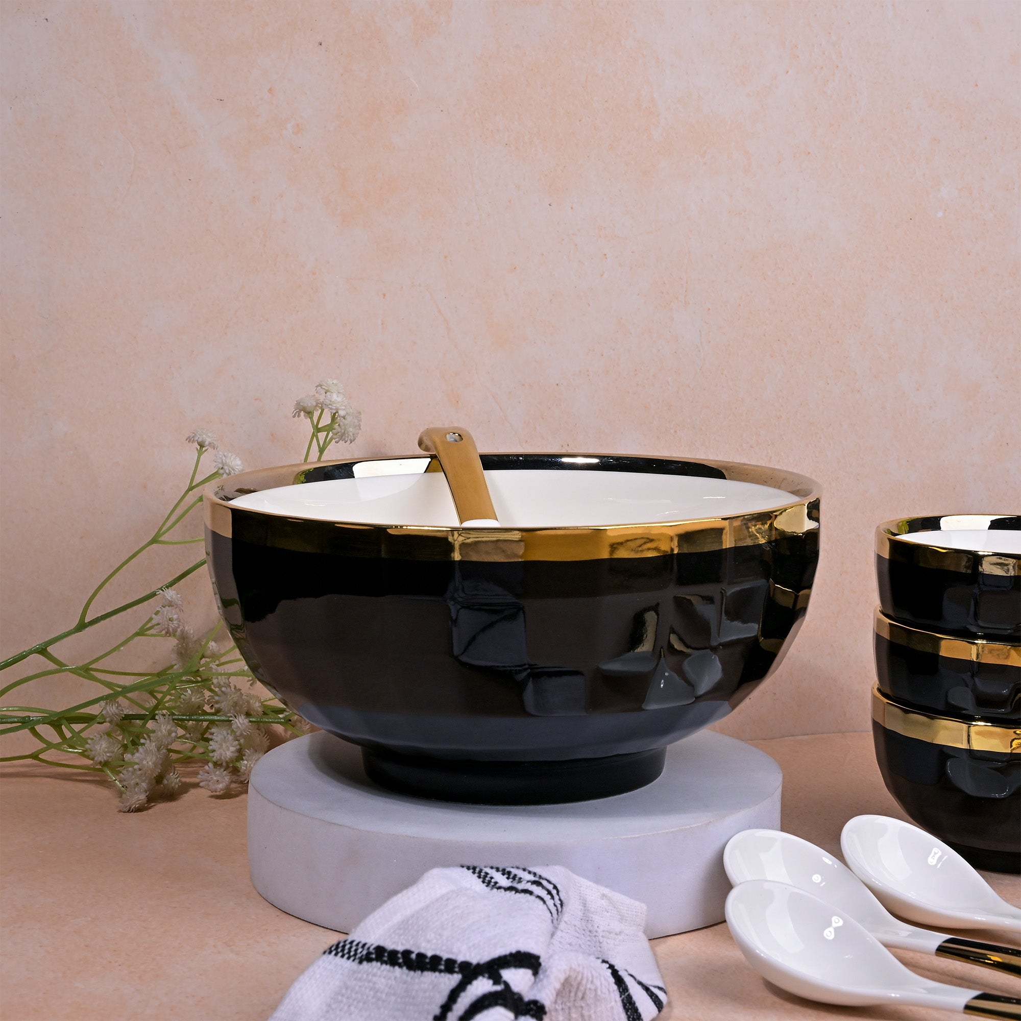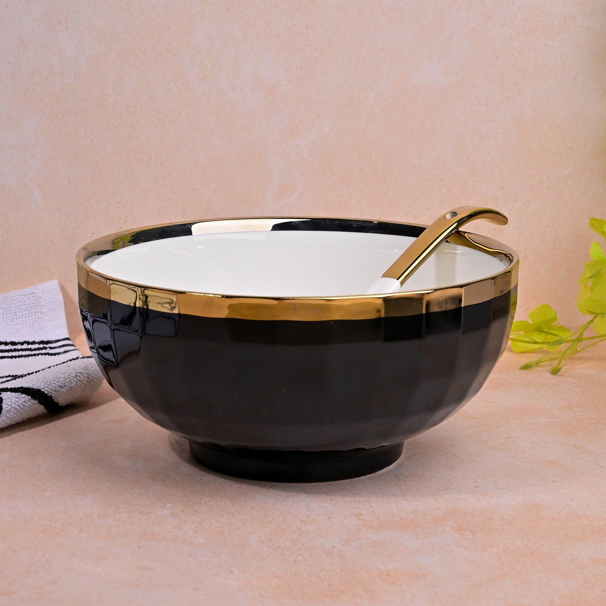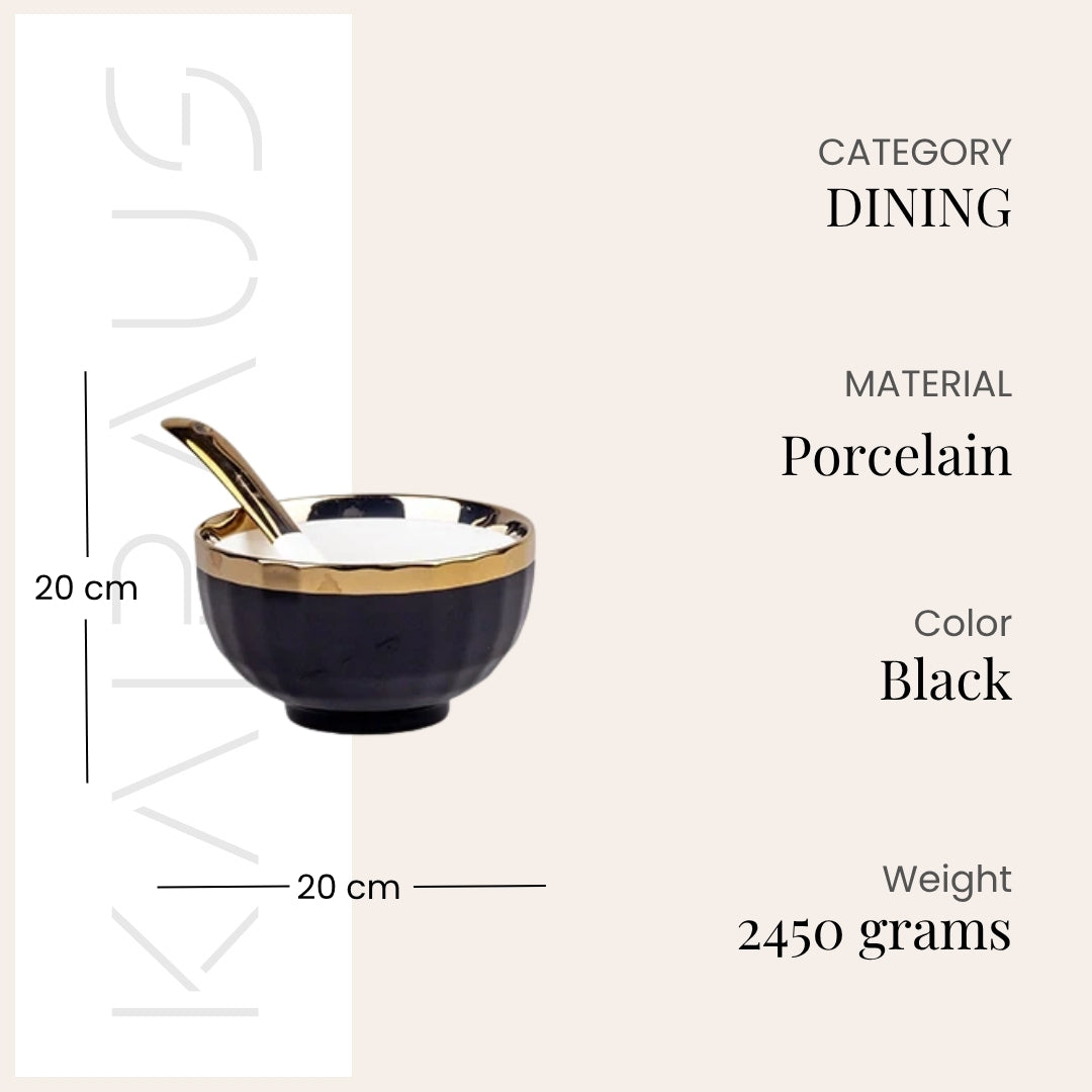 COD availableDo you want something genuinely luxurious that is also ideal for daily use? Say hello to the Midnight Gold Porcelain Bowl Set. The bowls are made of glazed porcelain and come with matching spoons. It's designed with a deep black colour combined with shiny gold rims and glossy handles giving it a premium finish and formal feel. The size is very convenient for serving soups, snacks and far more. Whether you are hosting a dinner party or a special occasion, this bowl set brings charm, class, and just the right touch of elegance to your table.