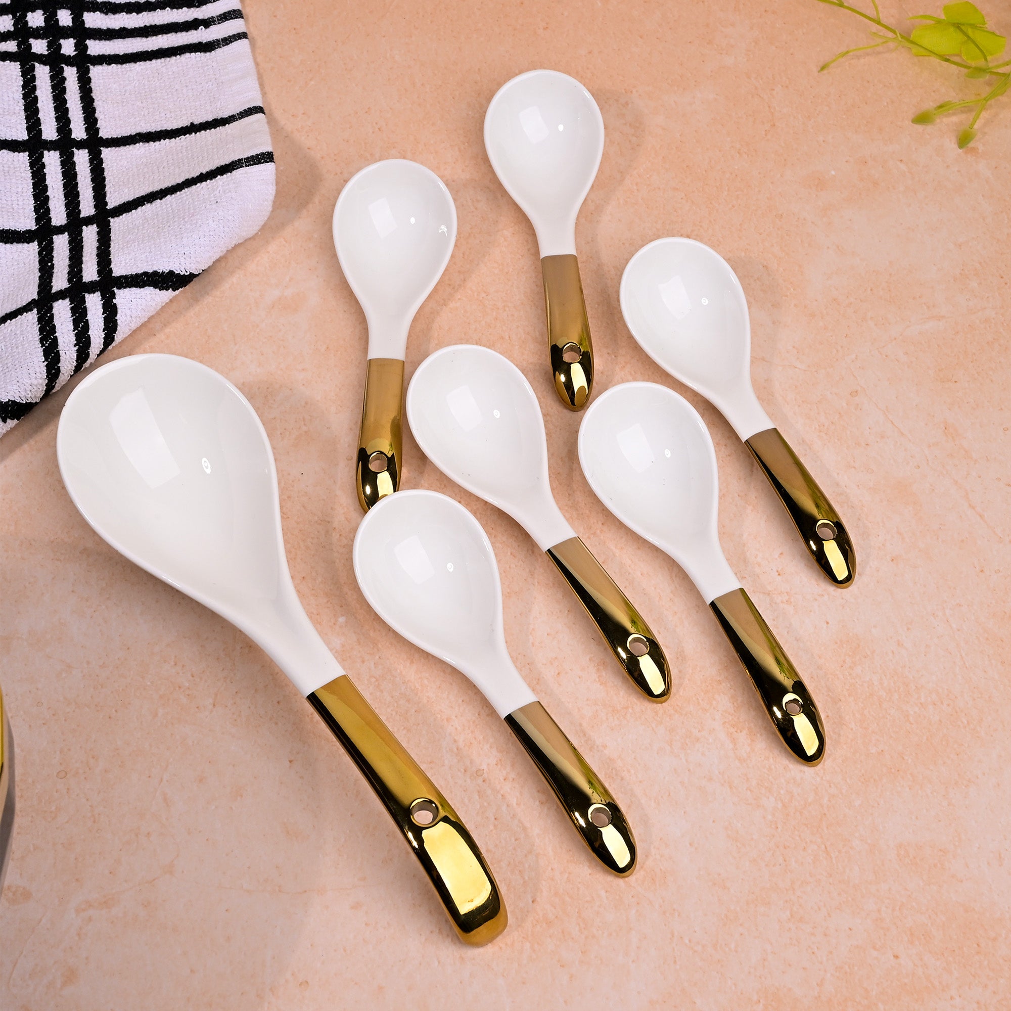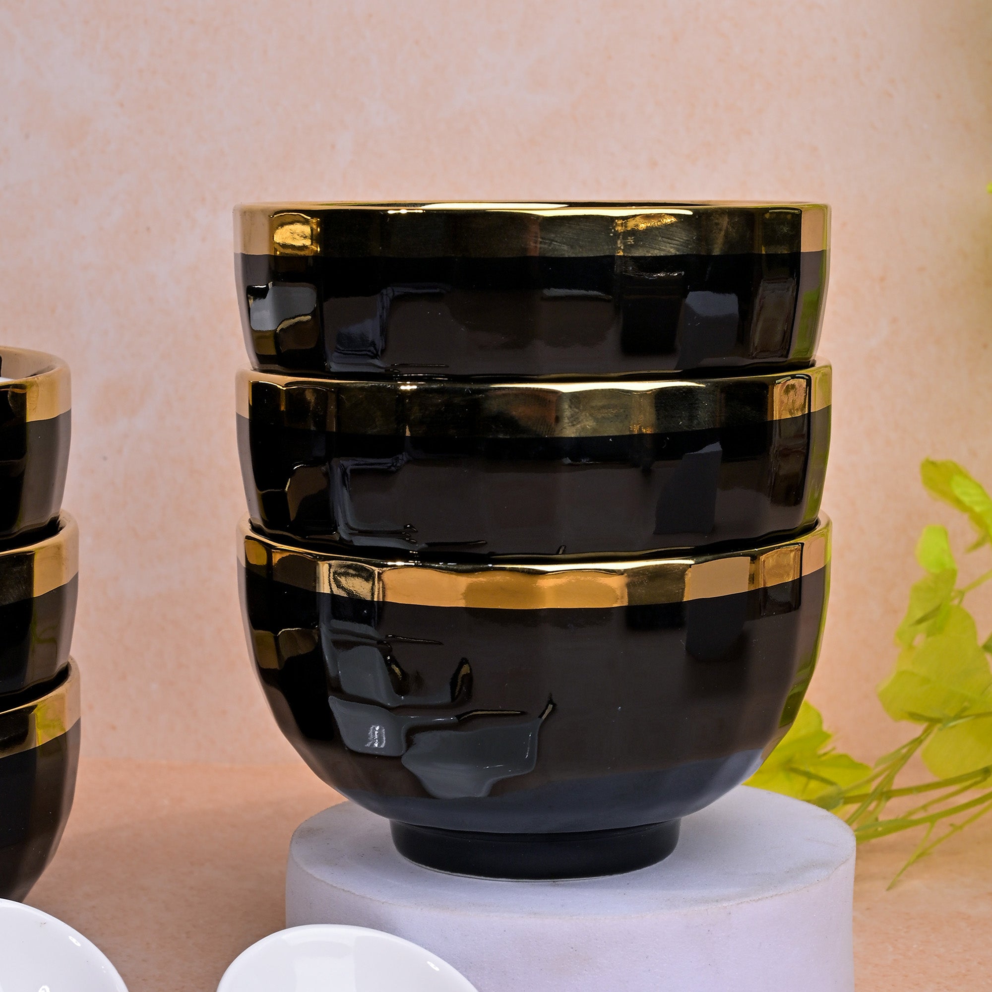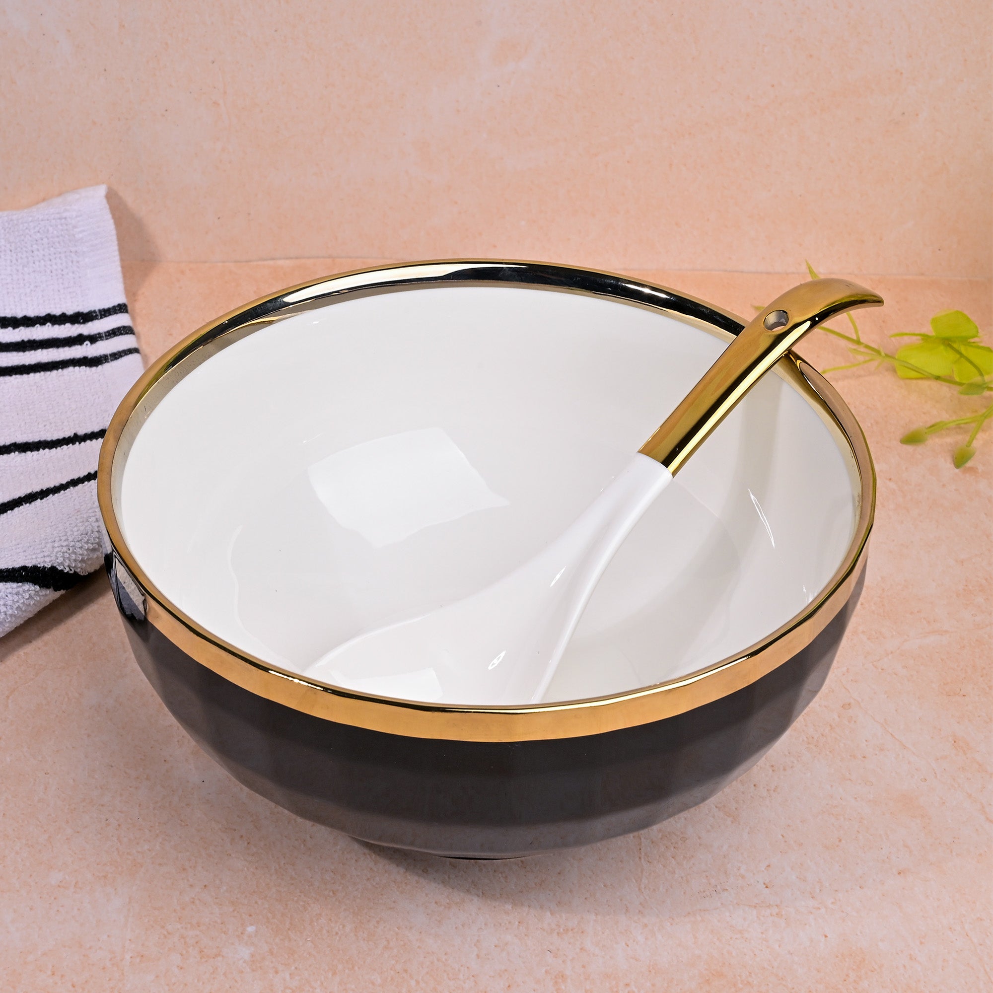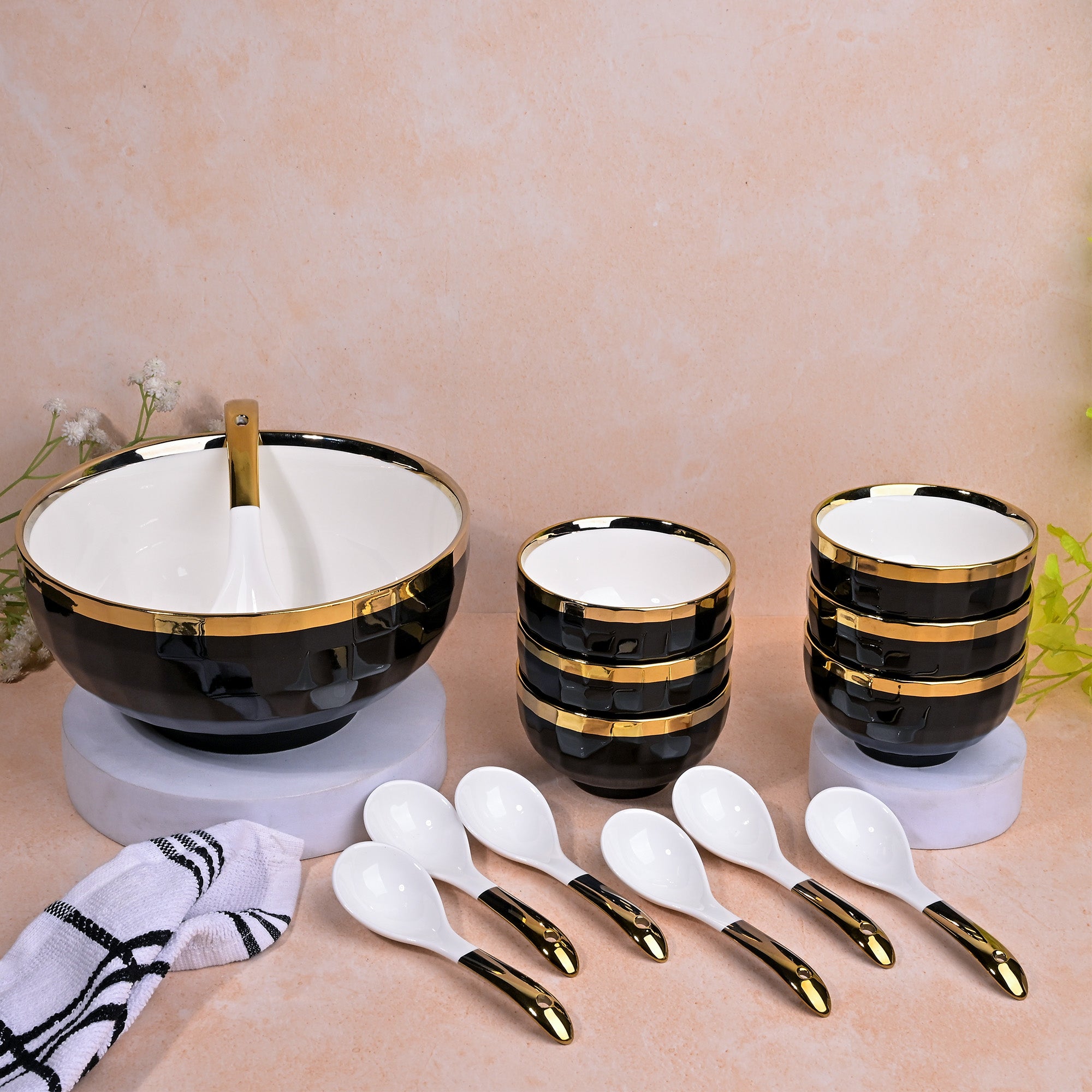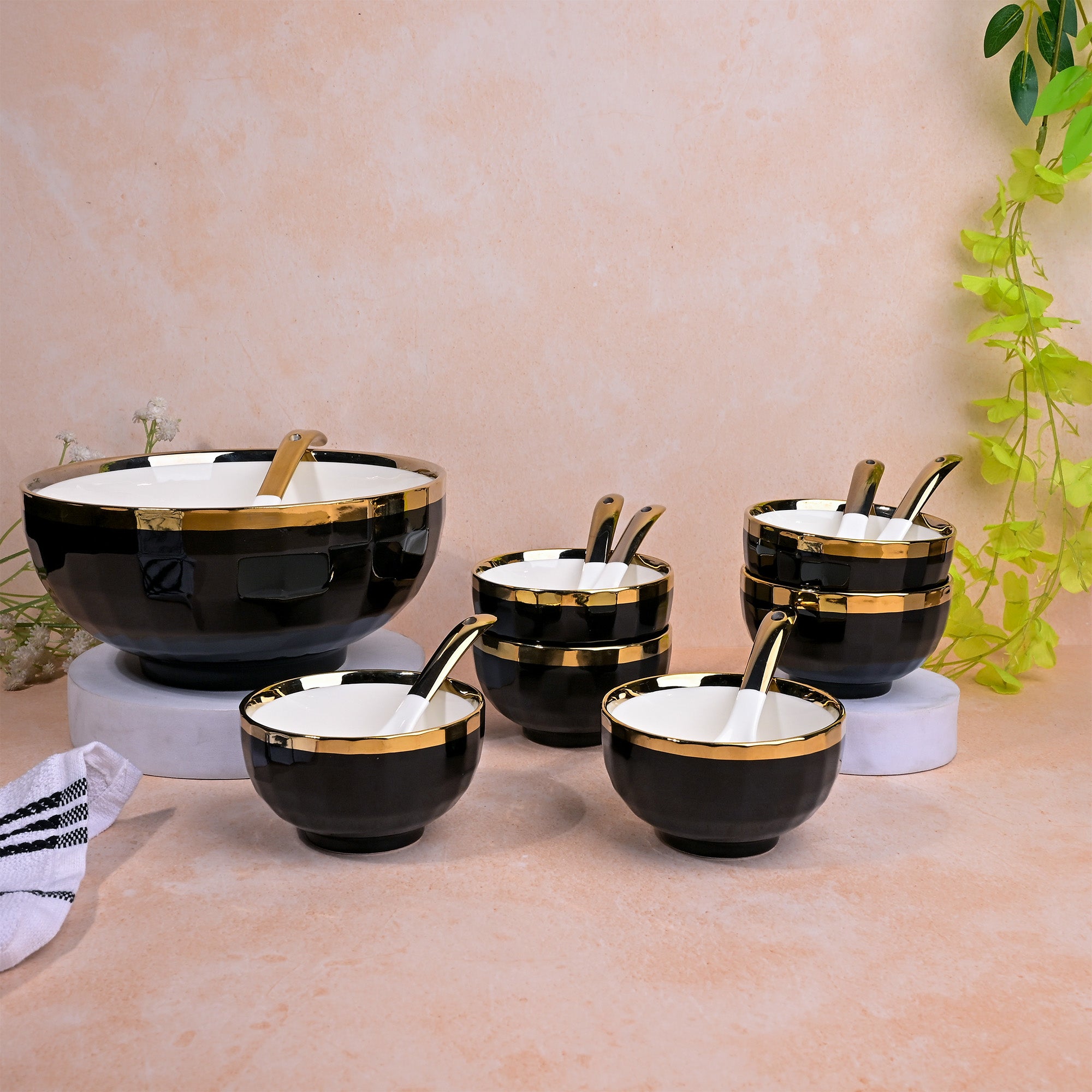 COD availableDo you want something genuinely luxurious that is also ideal for daily use? Say hello to the Midnight Gold Porcelain Bowl Set. The bowls are made of glazed porcelain and come with matching spoons. It's designed with a deep black colour combined with shiny gold rims and glossy handles giving it a premium finish and formal feel. The size is very convenient for serving soups, snacks and far more. Whether you are hosting a dinner party or a special occasion, this bowl set brings charm, class, and just the right touch of elegance to your table.