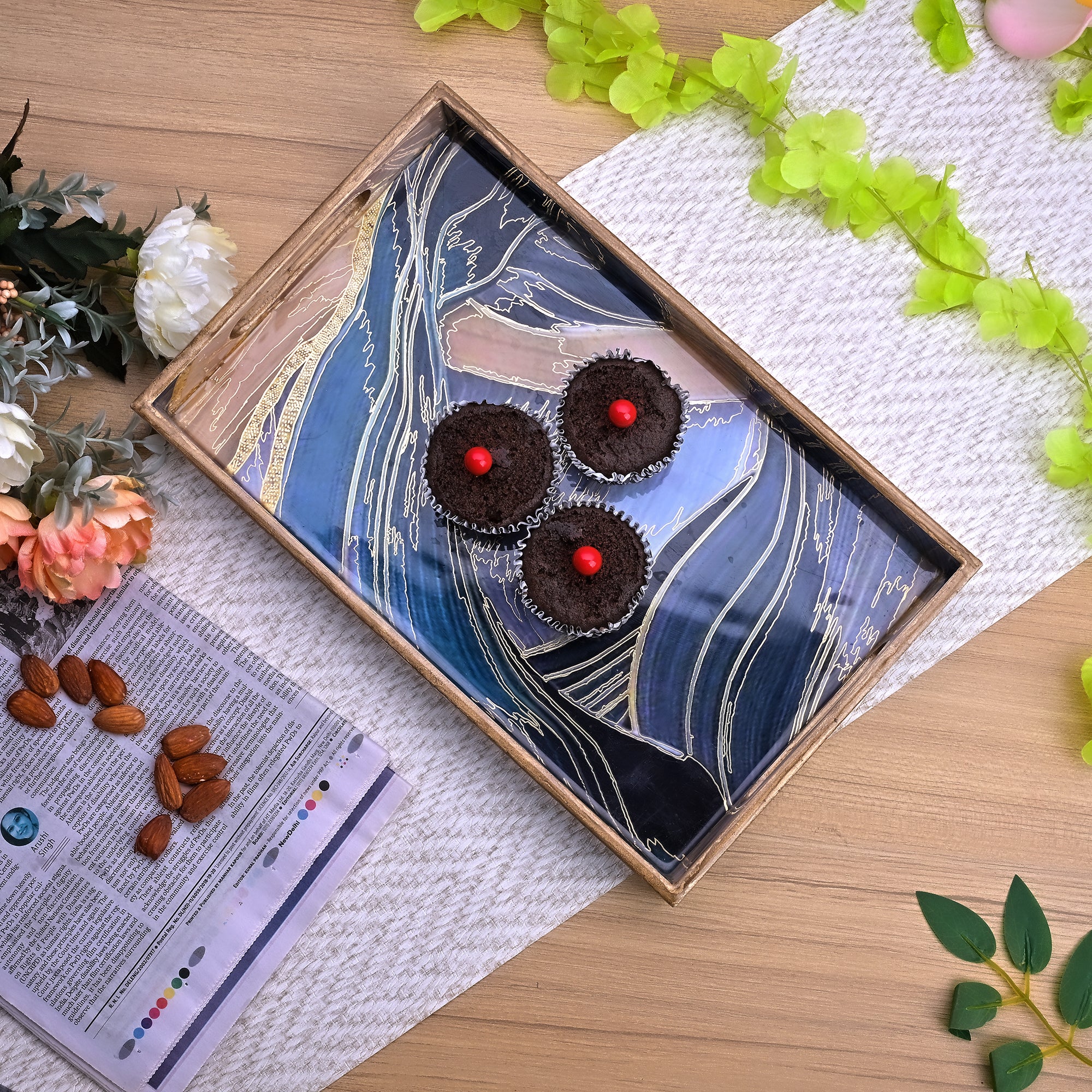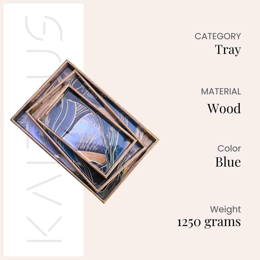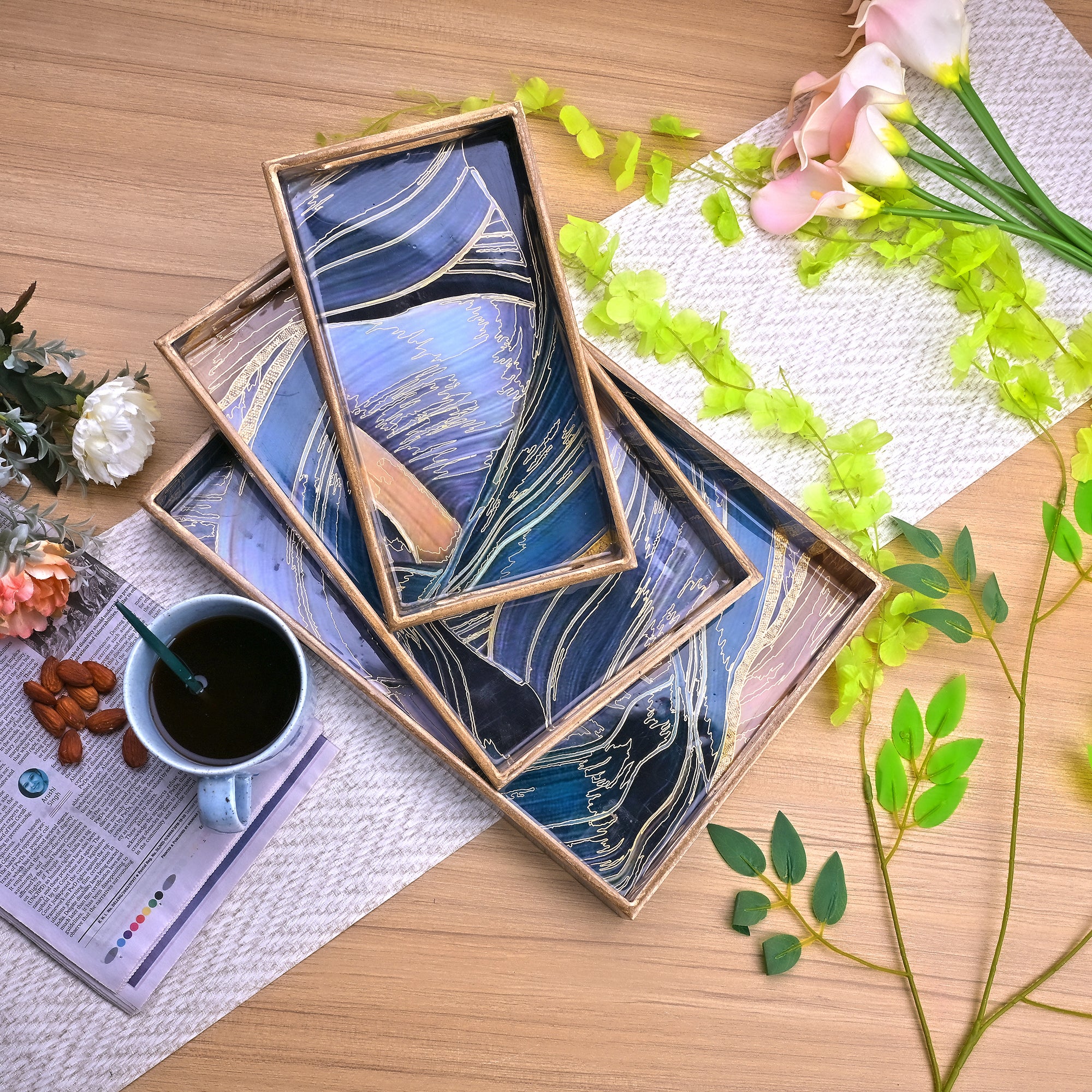 COD availableBring home this mystical Midnight Mystery Serving Tray Set featuring a modern- art-inspired ocean wave pattern with fiery, flowing lines. The deep blue and black tones with golden detailing create a bold visual contrast that instantly uplifts your dining space. Made from premium-quality wood, it offers durability with an artistic edge. The glossy finish gives it a silky, shiny surface that’s easy to clean and maintain. This tray set comes in three convenient sizes, it’s perfect for everyday use or special gatherings.